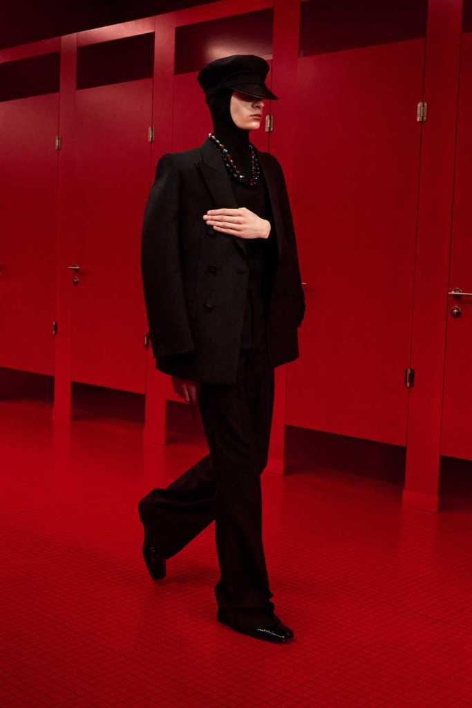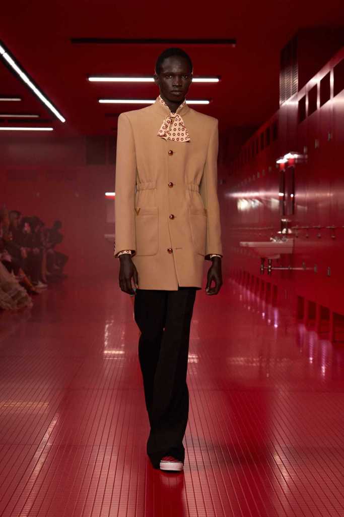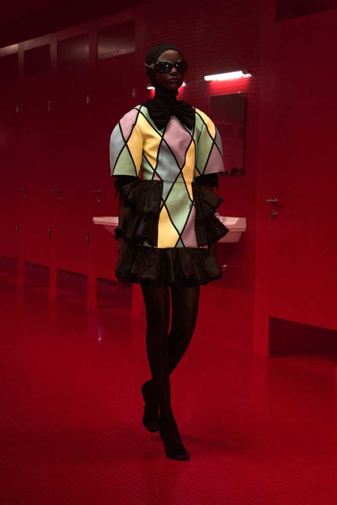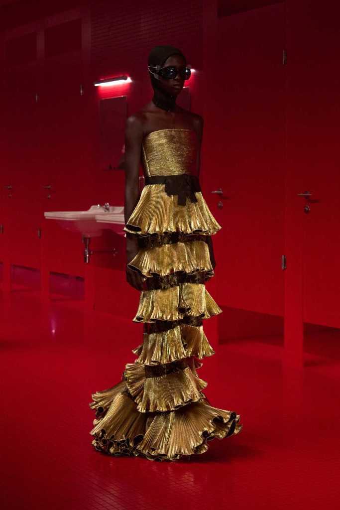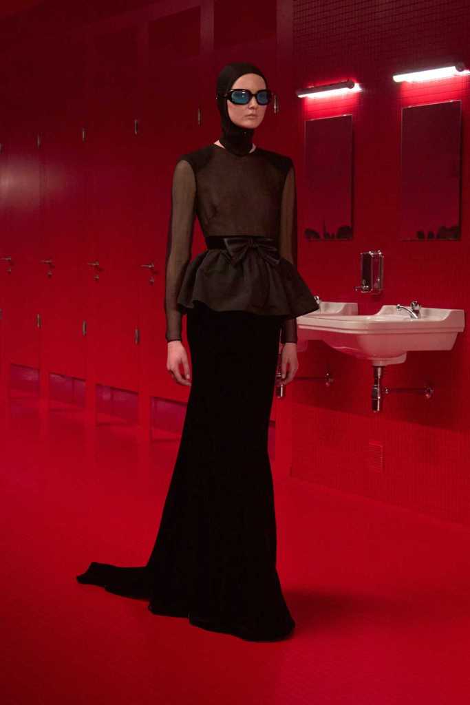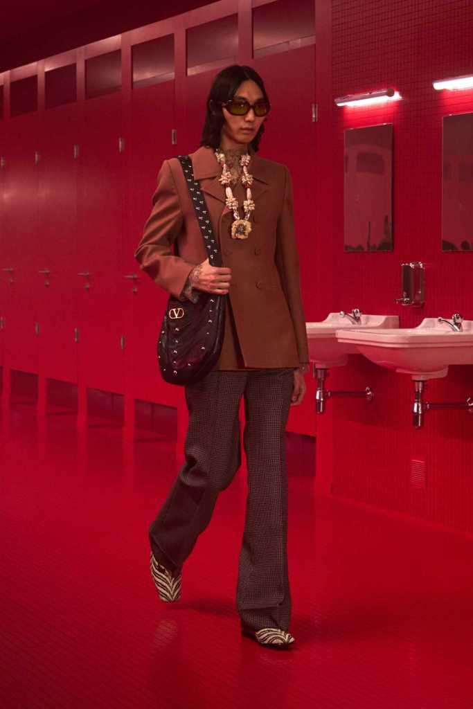 Le Méta-Théâtre des Intimités (The Meta-Theatre of Intimacies), was a Valentino sensory overload that blurred the lines between public and private, intimacy and performance. Set against the backdrop of a public restroom bathed in lurid red light, the show unfolded as a statement on how we construct identity through the act of dressing.