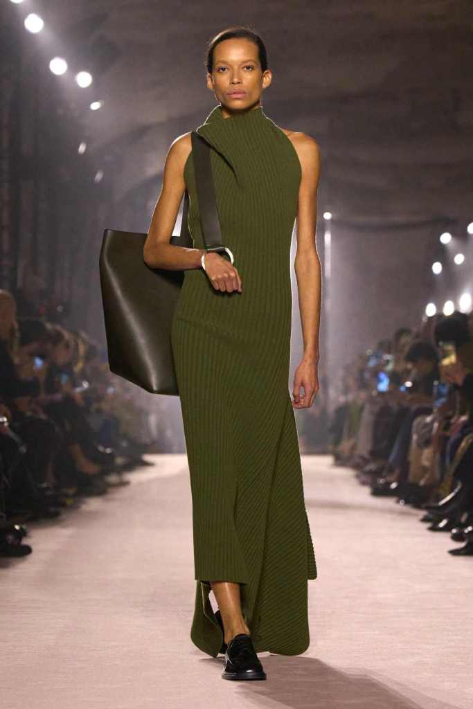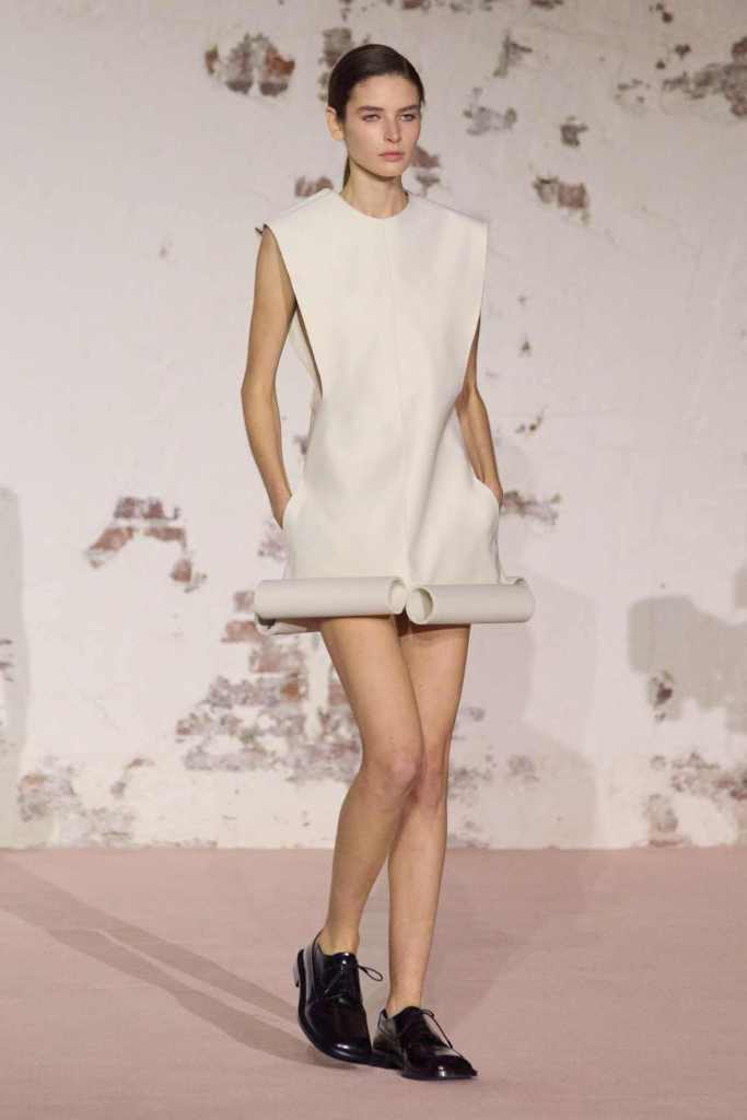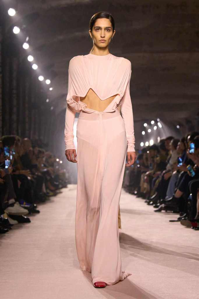 Beckham’s playful experimentation extended to accessories, with standout pieces like the jewellery box-inspired evening bag and Victoria Beckham Beauty’s perfume bottles cleverly repurposed as leather charms. Footwear was equally intriguing, with oversized Oxford shoes that featured built-in heel grips. Sharp knife like cutouts in pastel georgette dresses, added a sculptural dimension to the otherwise fluid silhouettes.