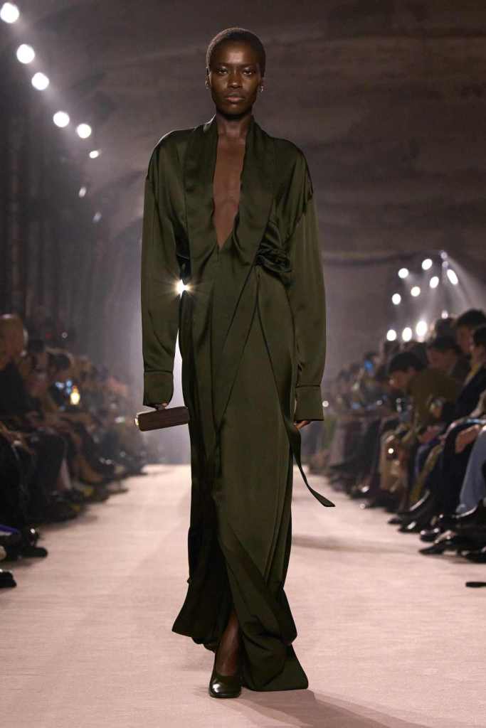 The collection showcased Beckham’s obsession with strong tailoring, though this time with a twist. Jackets had dropped lapels and were paired with stirrup trousers that elongated the legs. Trousers morphed into sandals, creating a seamless illusion of height. Rolled-up hems on blazers and minidresses added a sense of spontaneity, capturing the unconscious gestures we all make when adjusting our clothes. This theme of self-customisation continued in the silk dressing gowns transformed into evening dresses and the VB-monogrammed bathrobe reimagined as a pussy-bowed smoking jacket.