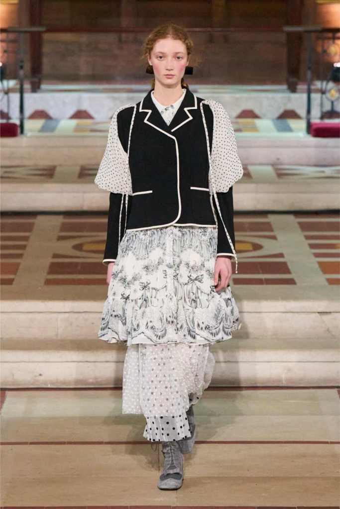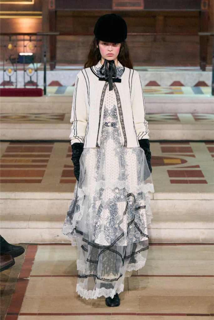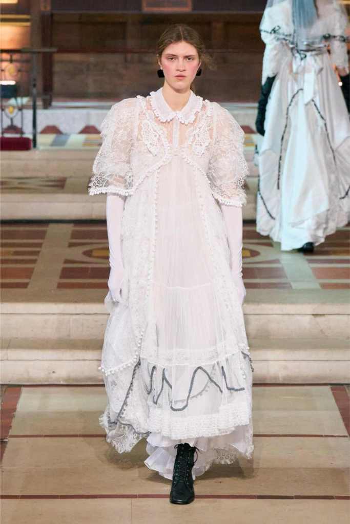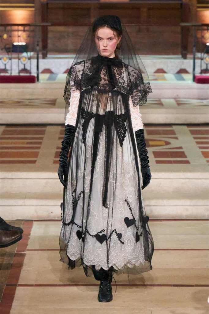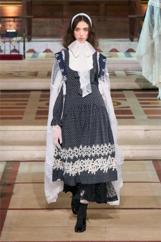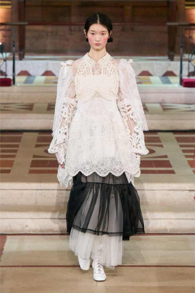 The collection played with this duality beautifully. Delicate, layered lace dresses and sheer tulle pieces created a sense of fragility, while the addition of black pom-poms and crocheted details hinted at something darker beneath the surface. Aksu’s signature romantic silhouettes took on an almost ghostly quality, as if Elisabeth’s legacy was haunting the runway. The black-and-white looks were especially striking—timeless, elegant, and full of quiet drama.