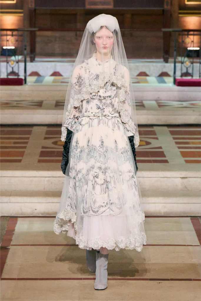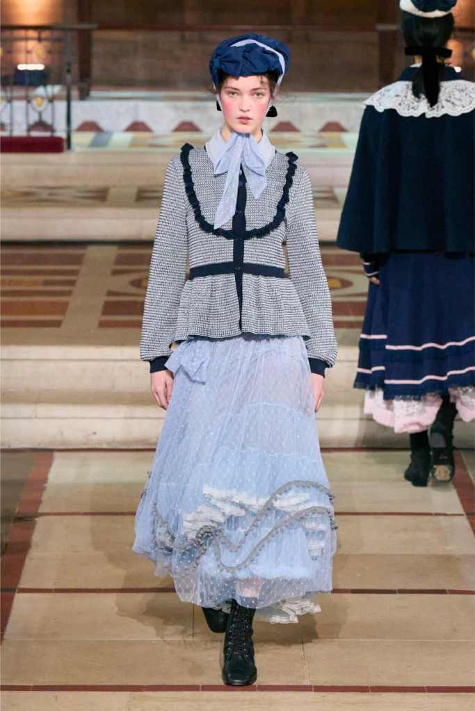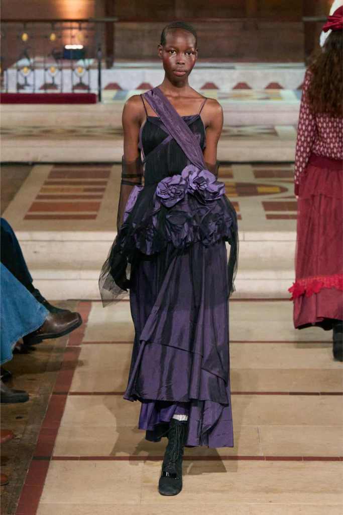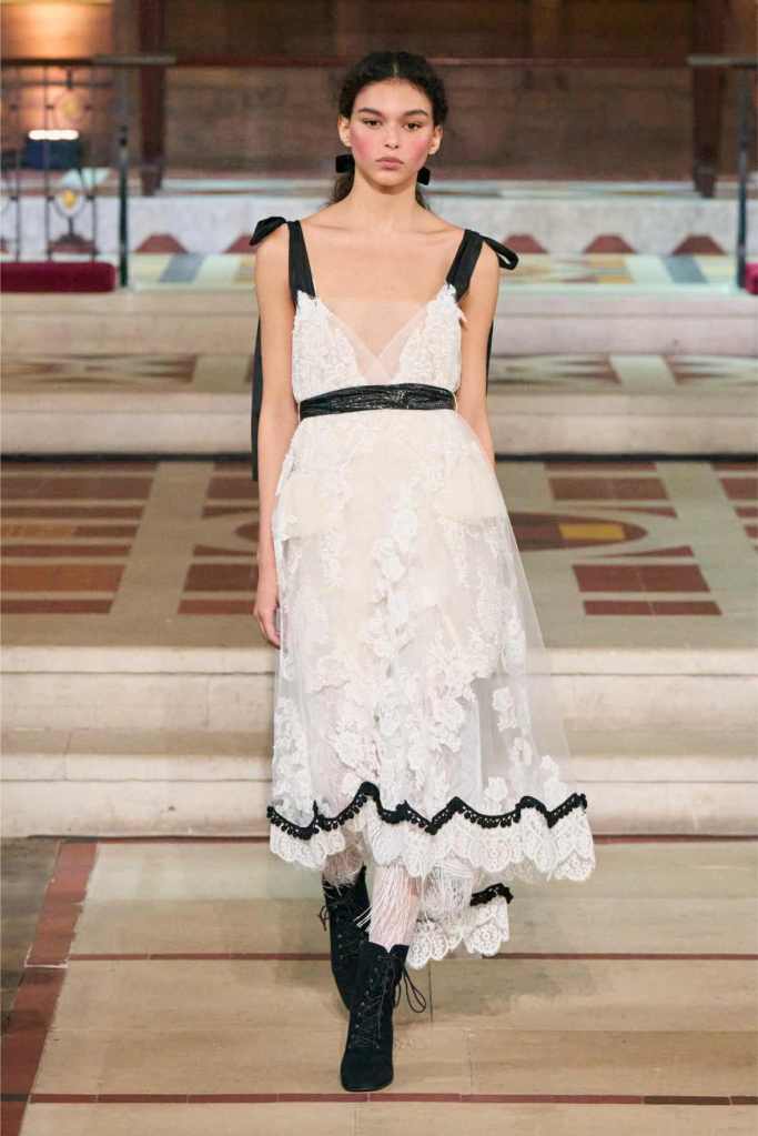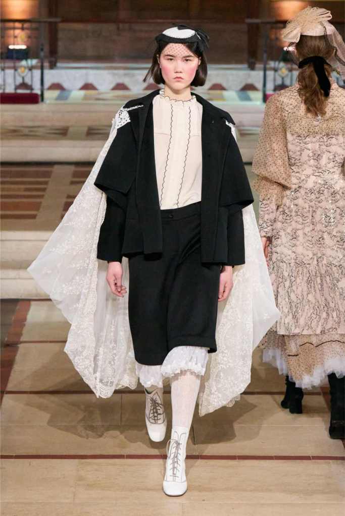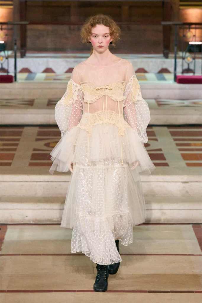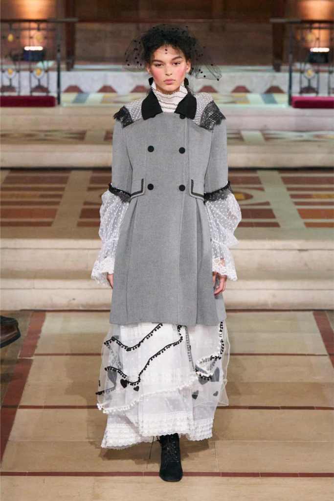 The collection played with this duality beautifully. Delicate, layered lace dresses and sheer tulle pieces created a sense of fragility, while the addition of black pom-poms and crocheted details hinted at something darker beneath the surface. Aksu’s signature romantic silhouettes took on an almost ghostly quality, as if Elisabeth’s legacy was haunting the runway. The black-and-white looks were especially striking—timeless, elegant, and full of quiet drama.