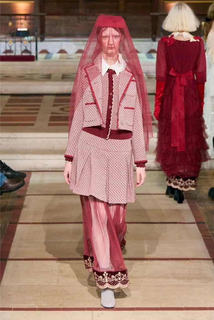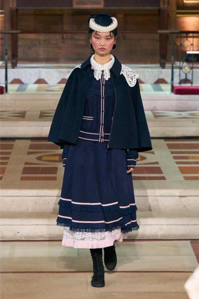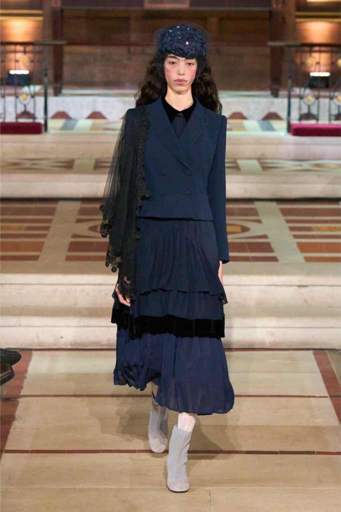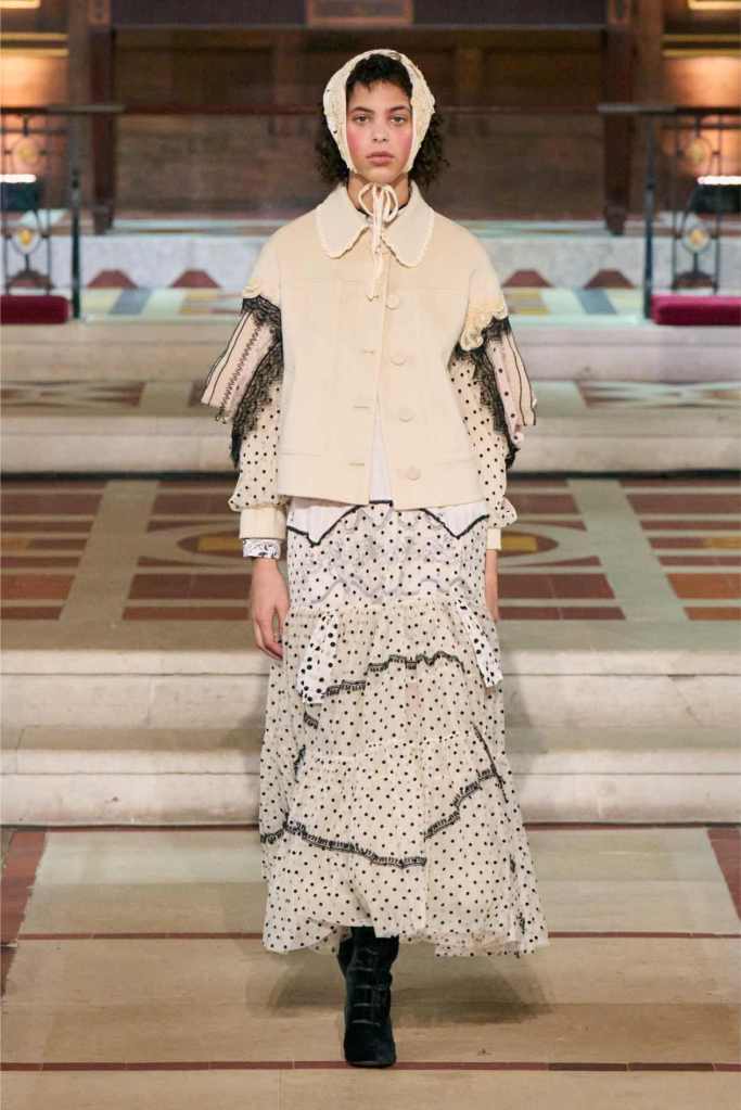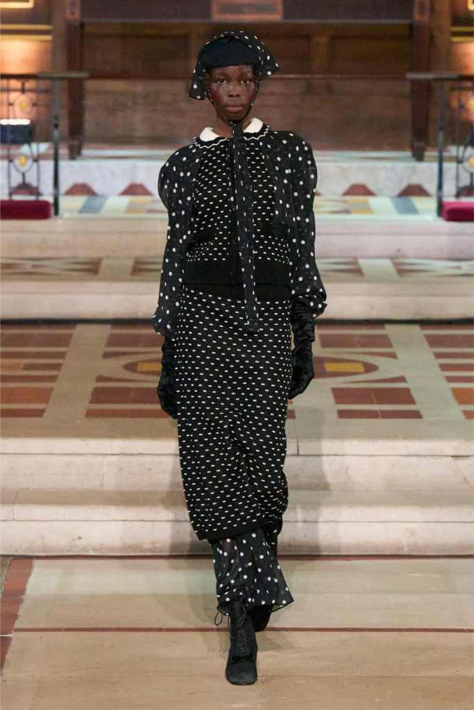 Adding another layer to the story, Aksu drew inspiration from Egon Schiele, the Austrian Expressionist painter known for his raw, distorted figures. The influence was clear in the pinstripe skirt suits and polka-dot lace dresses, which had an almost unsettling beauty to them.