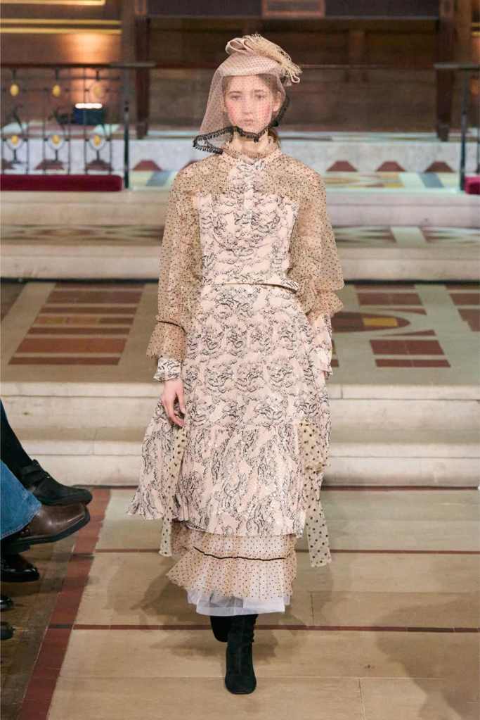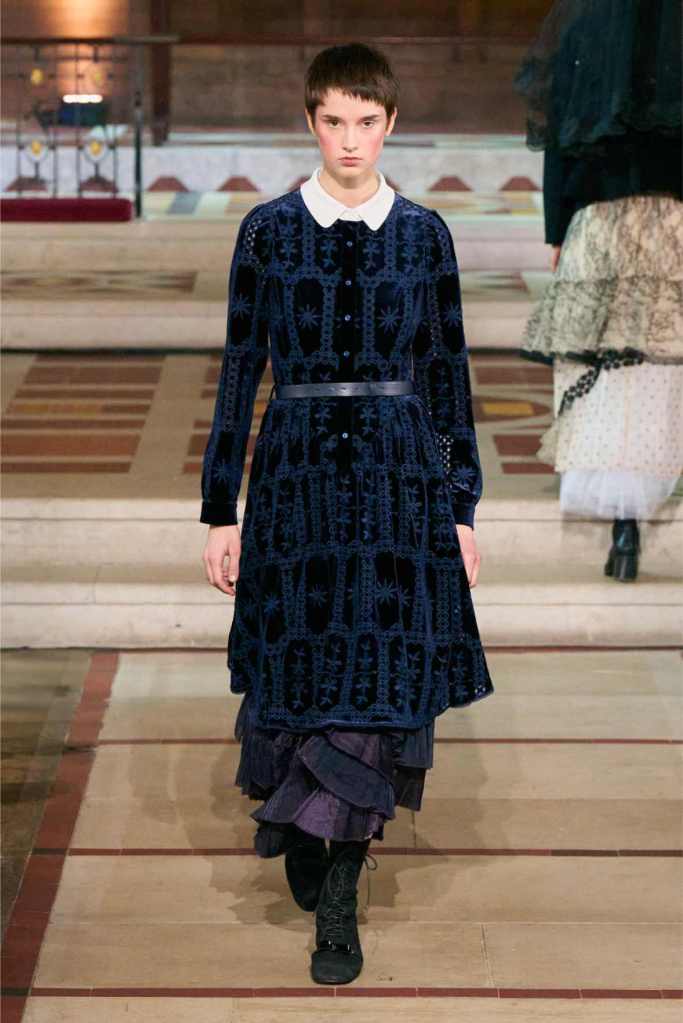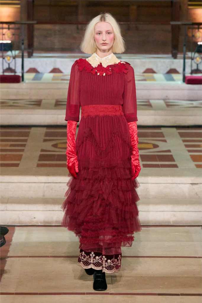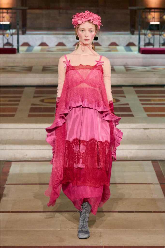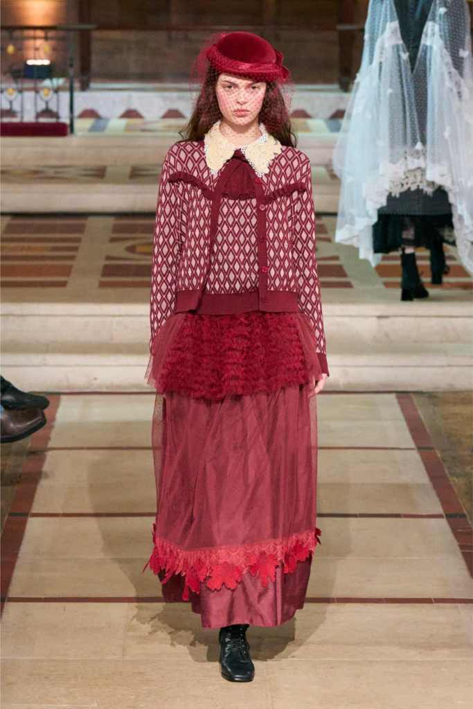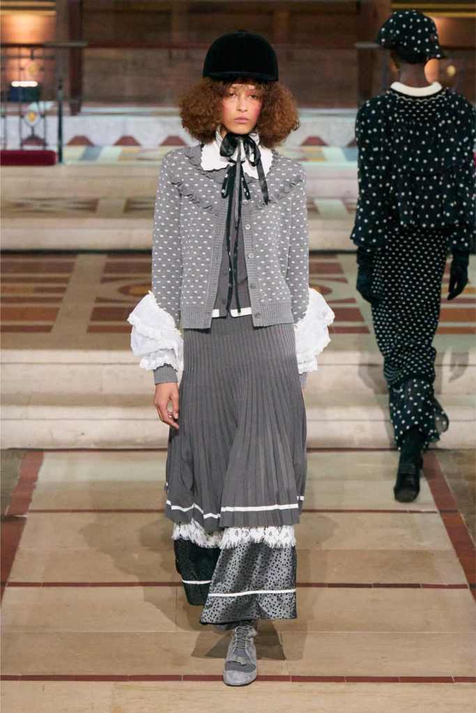 Adding another layer to the story, Aksu drew inspiration from Egon Schiele, the Austrian Expressionist painter known for his raw, distorted figures. The influence was clear in the pinstripe skirt suits and polka-dot lace dresses, which had an almost unsettling beauty to them.
