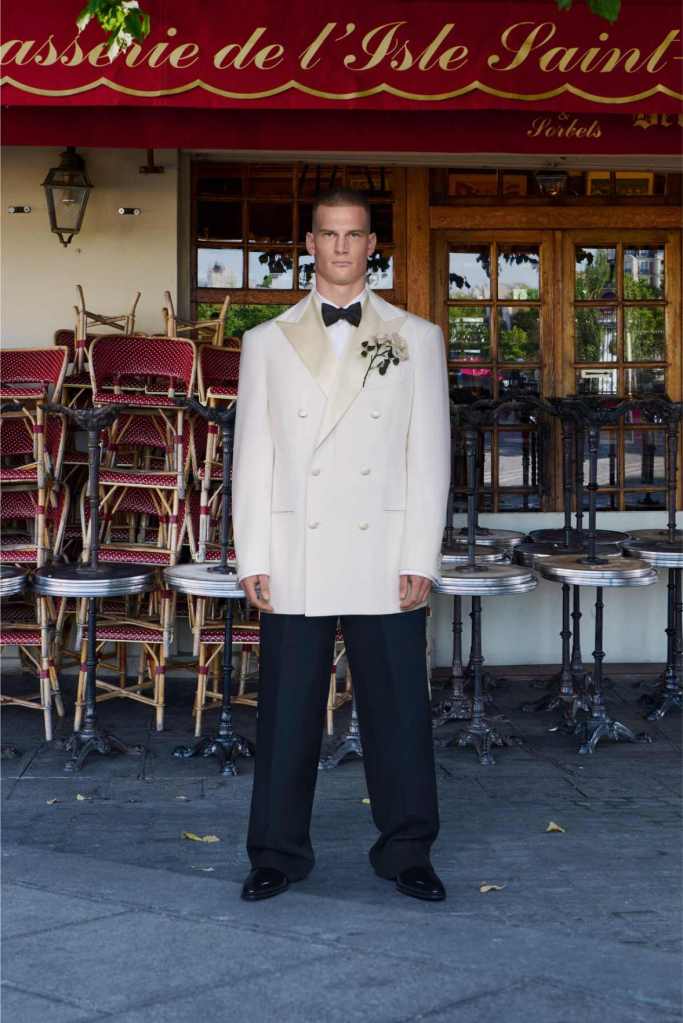 But beneath the star power and drama was a striking calmness. The collection was sculptural and stripped back, with gowns that stood stiff without boning and suits that fit like second skins or in the case of his husband’s, comically oversized skins. It was couture, yes, but filtered through classic Demna eye: sharp shoulders, twisted satins, and silhouettes that blurred elegance with edge.