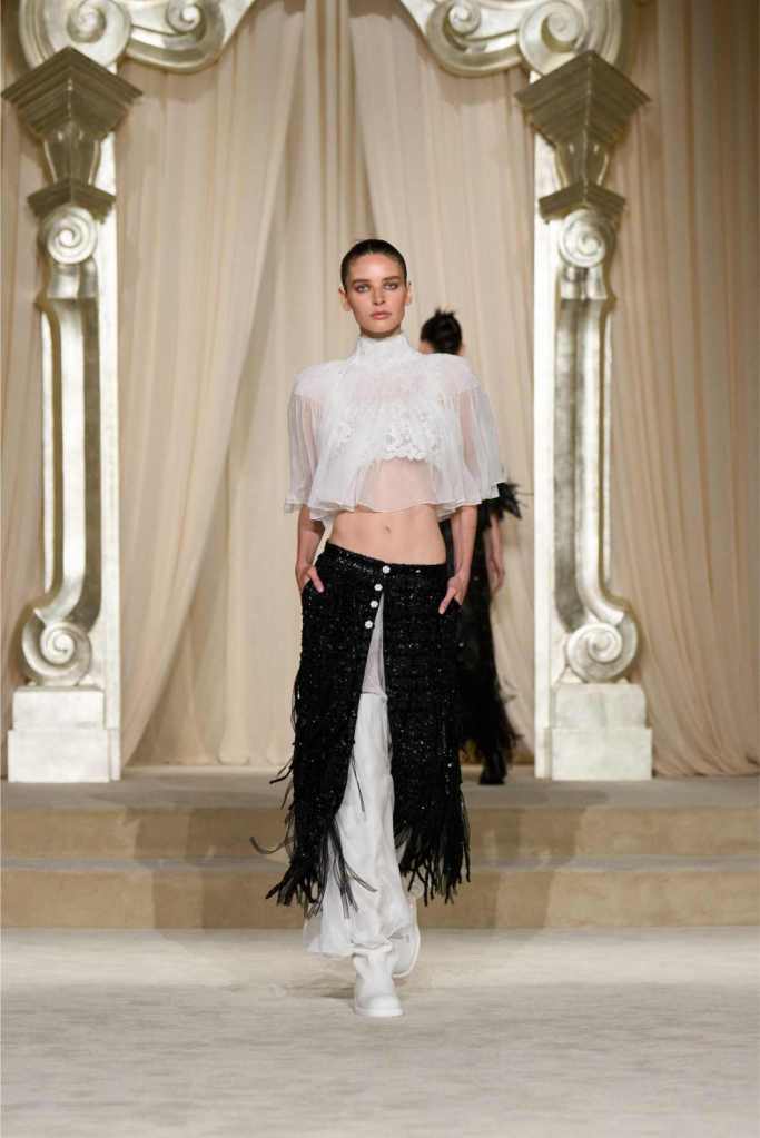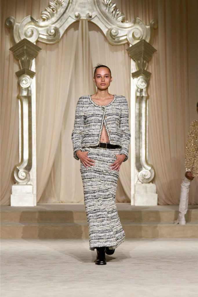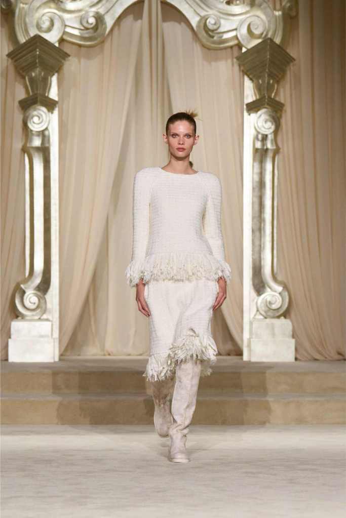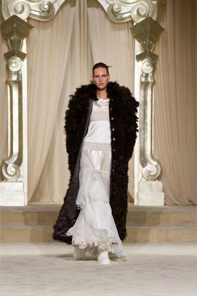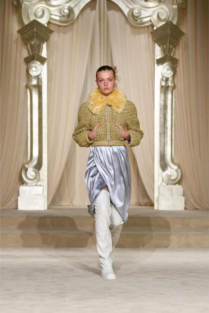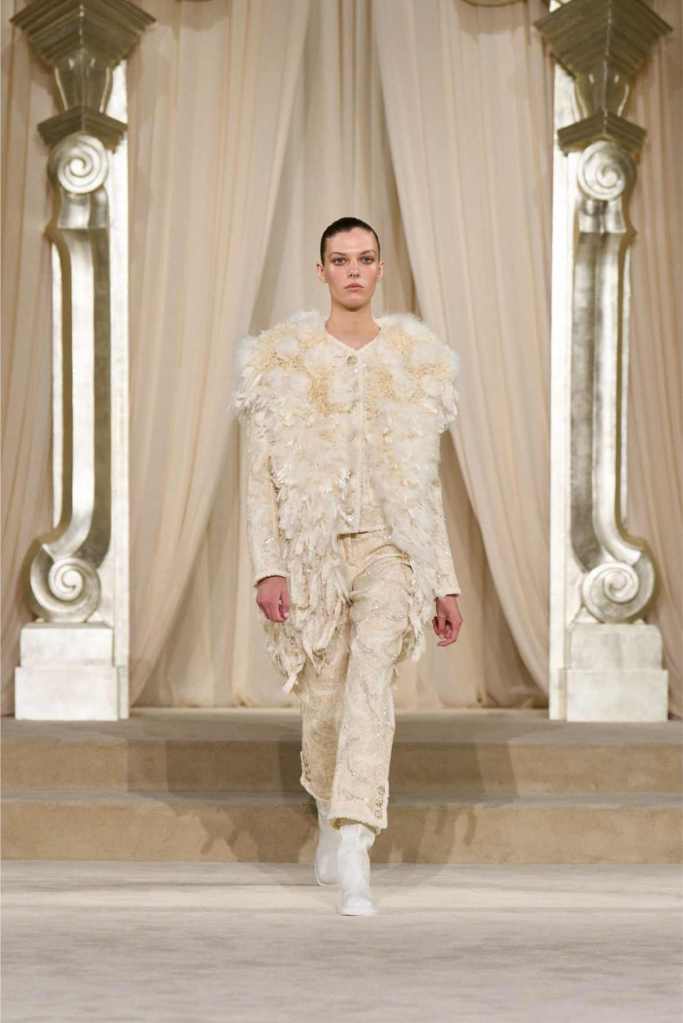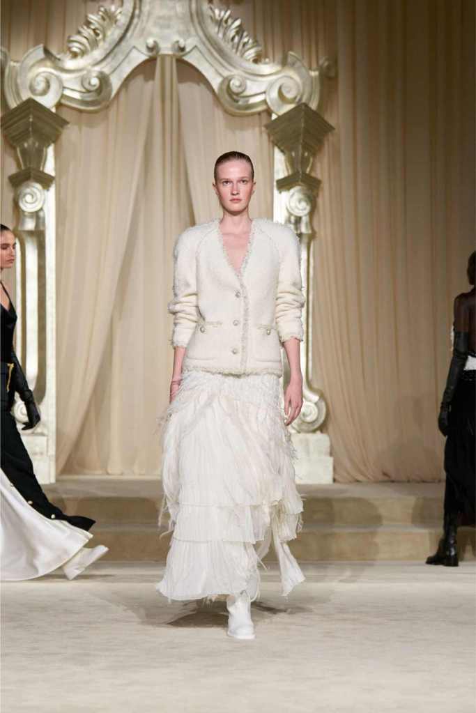 Wheat ears, one of Coco’s favorite symbols, showed up embroidered on dresses, embossed on buttons, and carried in the hands of the finale bride. Tweed was everywhere, but reimagined—layered with feathers, brushed to look like fur, or paired with mohair and chiffon for unexpected softness. Light chiffon blouses, shredded tulle skirts, and intricate lace underpinnings offered contrast to the heavy outerwear.
