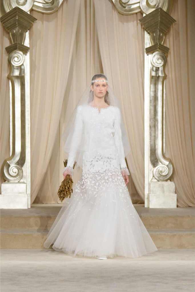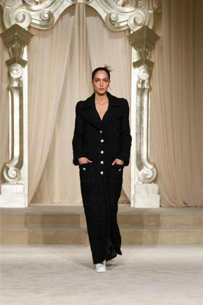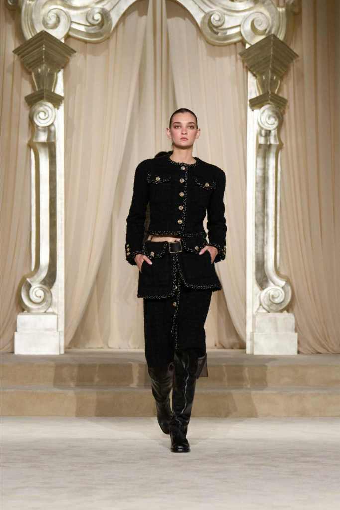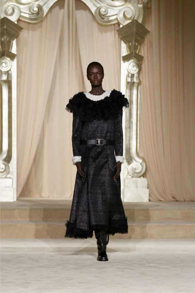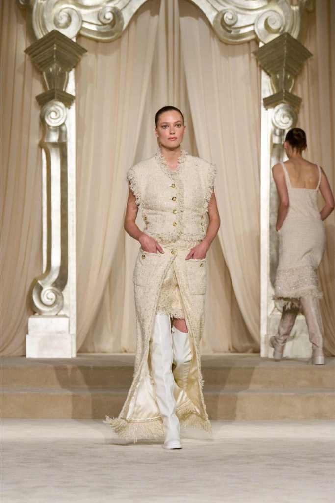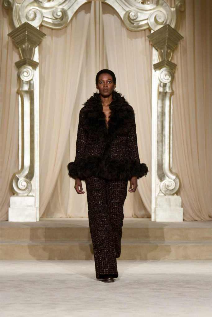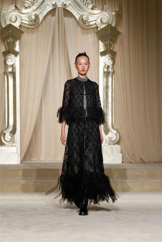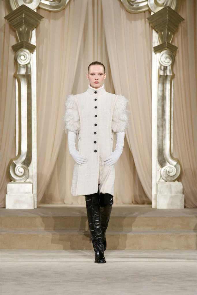 Wheat ears, one of Coco’s favorite symbols, showed up embroidered on dresses, embossed on buttons, and carried in the hands of the finale bride. Tweed was everywhere, but reimagined—layered with feathers, brushed to look like fur, or paired with mohair and chiffon for unexpected softness. Light chiffon blouses, shredded tulle skirts, and intricate lace underpinnings offered contrast to the heavy outerwear.