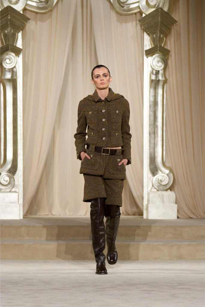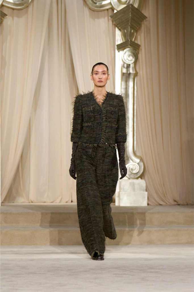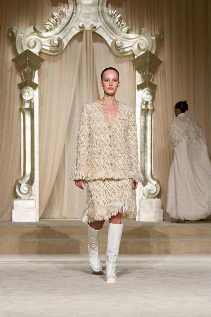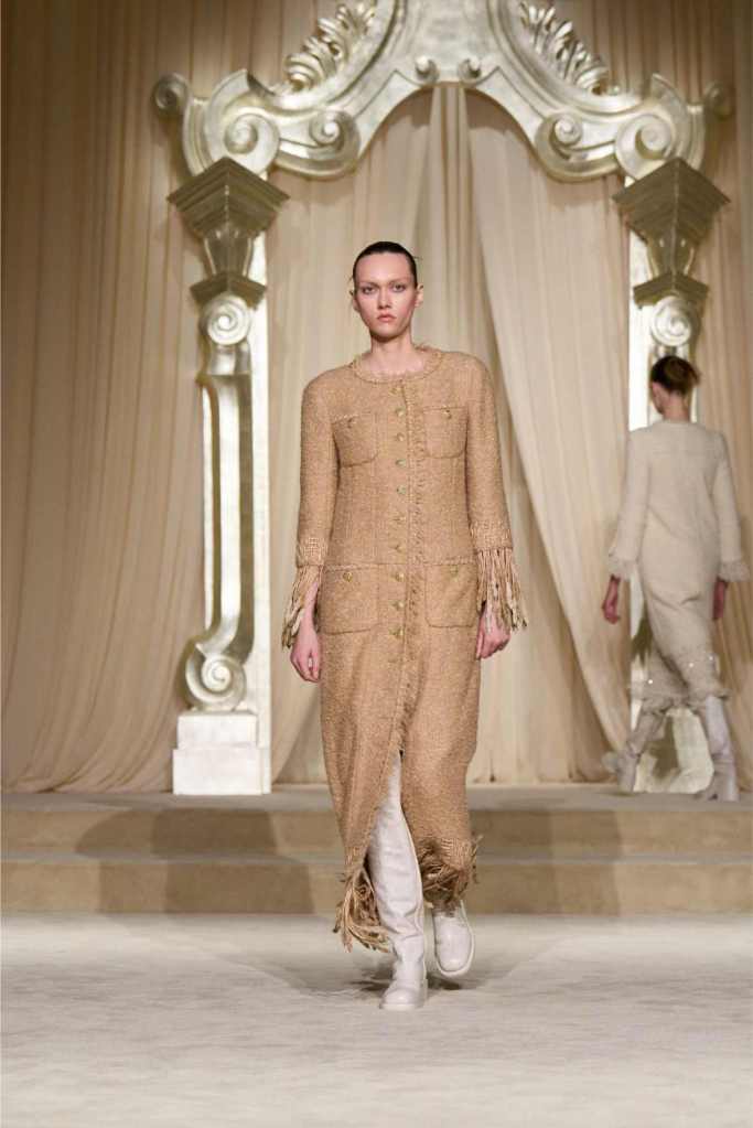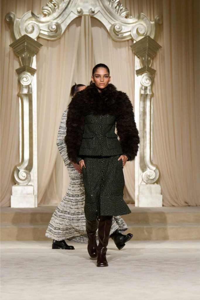 With white carpet underfoot, mirrored walls, and beige banquettes, the space recreated the original salons of 31 rue Cambon. The collection leaned into that same spirit of restraint and reverence. Designed by the in-house team, it drew from Coco Chanel’s love of the Scottish Highlands. Think chunky knits, long-line tweed coats, and capes edged in feathery fringe. The palette was rich and earthy—ivory, deep green, dark plum, and flashes of burnished gold. It wasn’t flashy, but it was deeply textured, showing off the meticulous craftsmanship of Chanel’s ateliers.