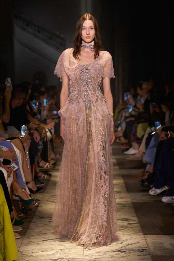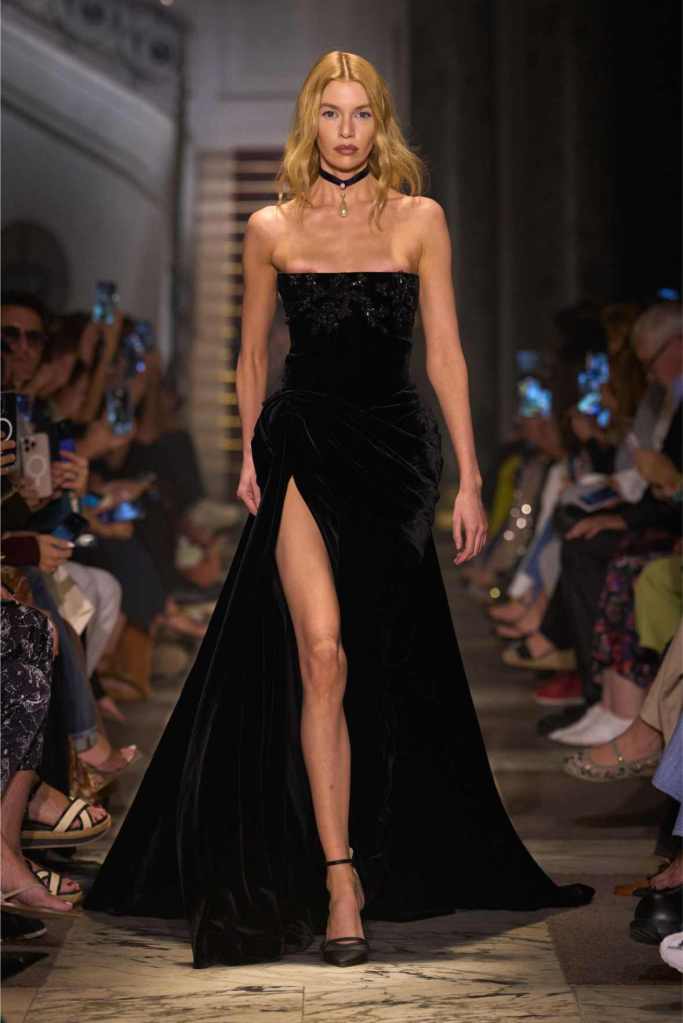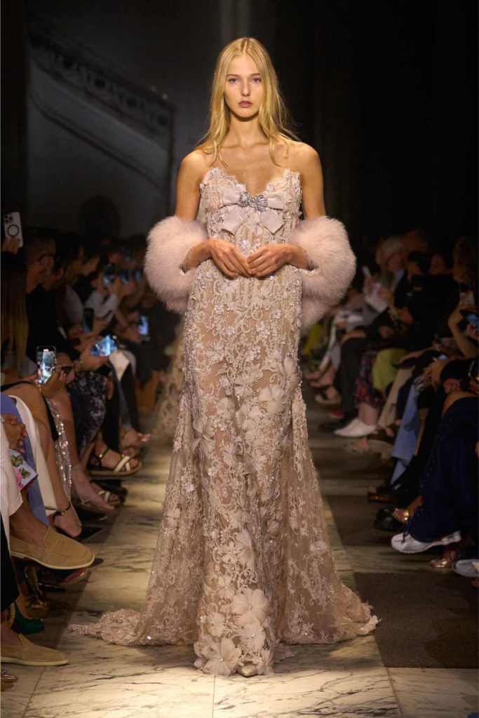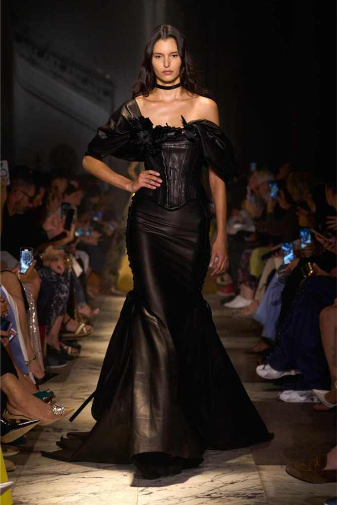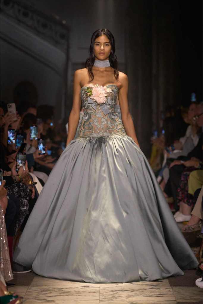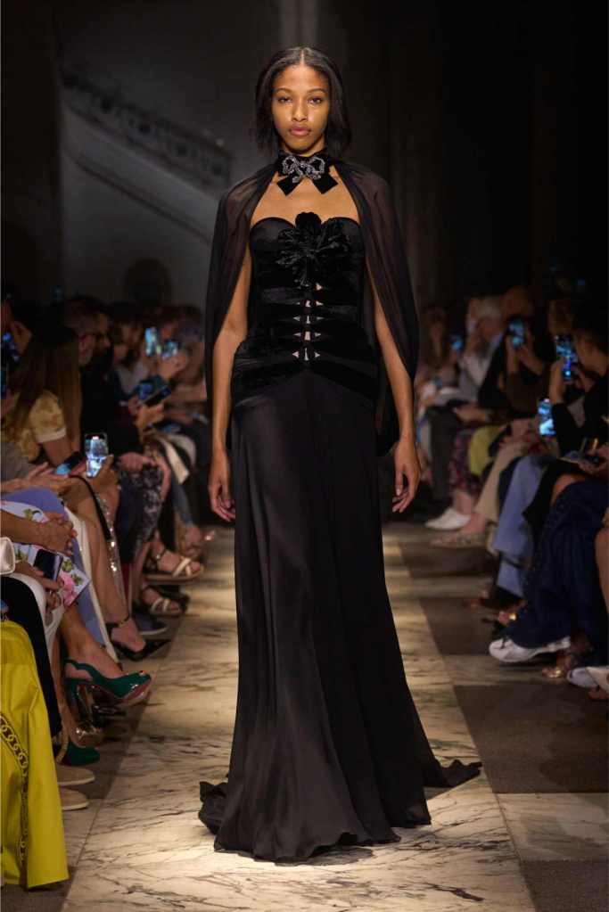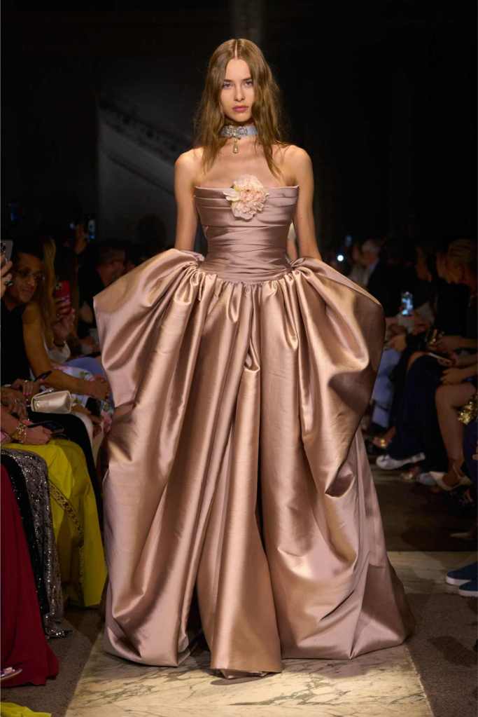 Set inside the ornate Pavillon Cambon in Paris, the show opened with a sultry twist. Lara Stone, Sasha Pivovarova, and Isabeli Fontana strutted down the staircase in corseted black velvet gowns—seductive, sculptural, and surprisingly minimal. It was a bold contrast to what followed: a sugary explosion of macaron hues like rose pink, mint, pistachio, and baby blue.