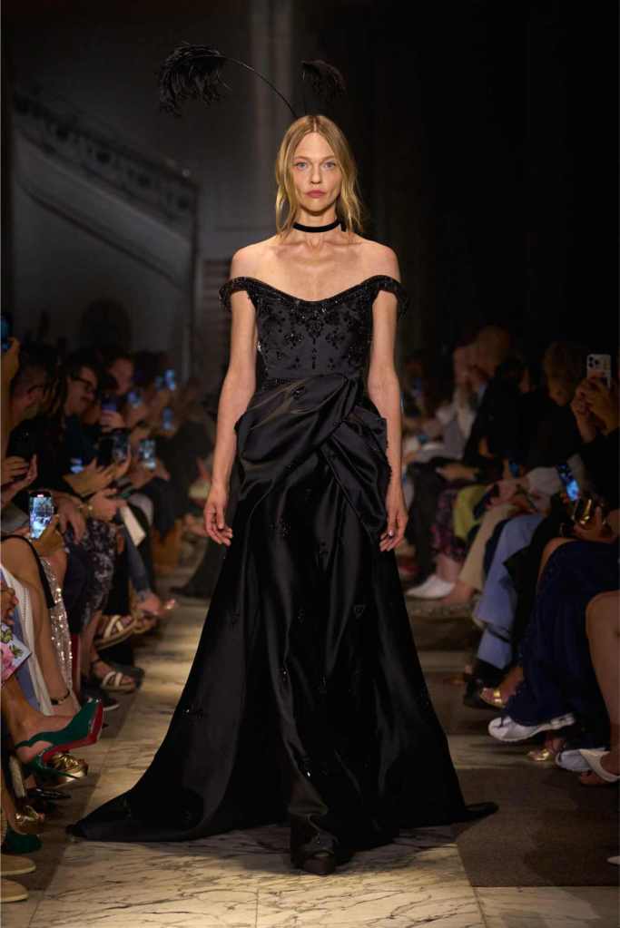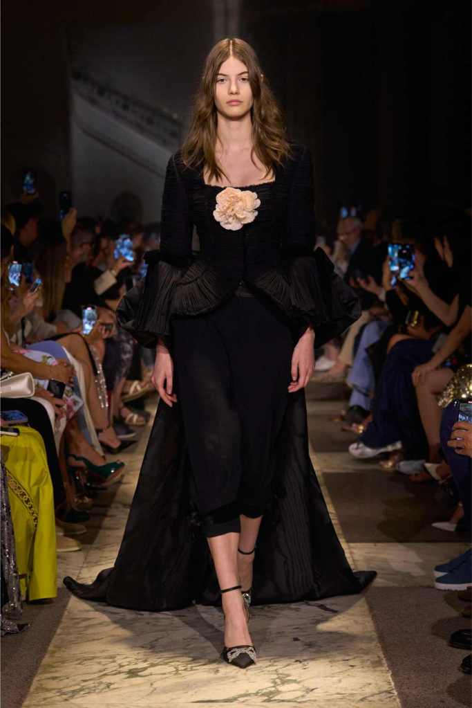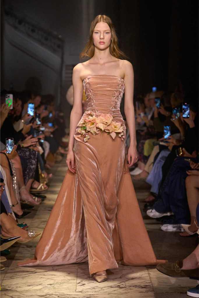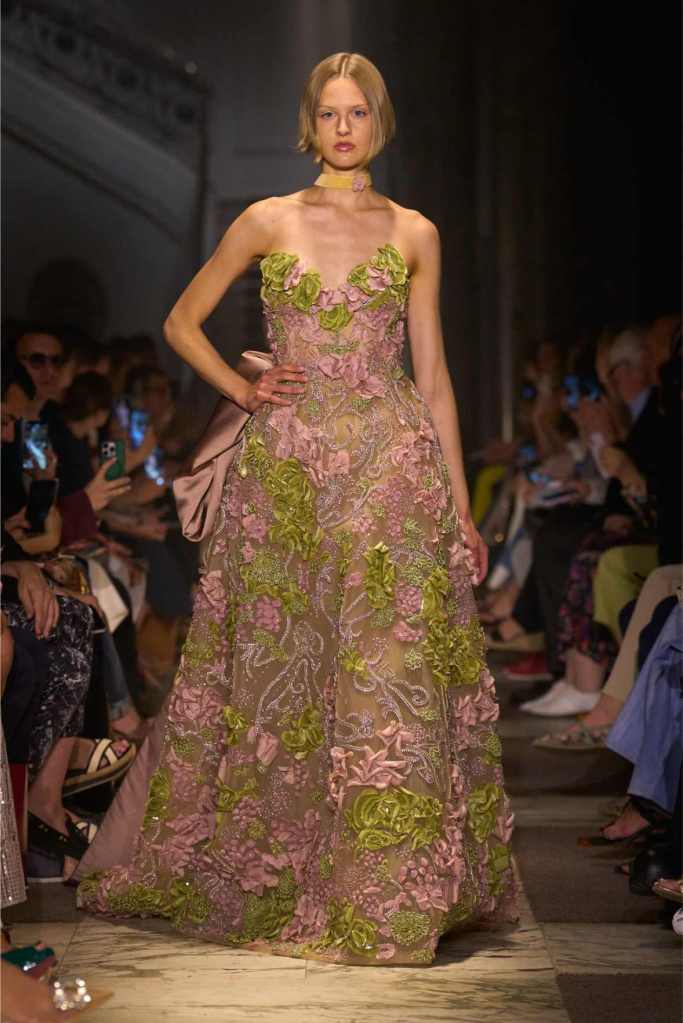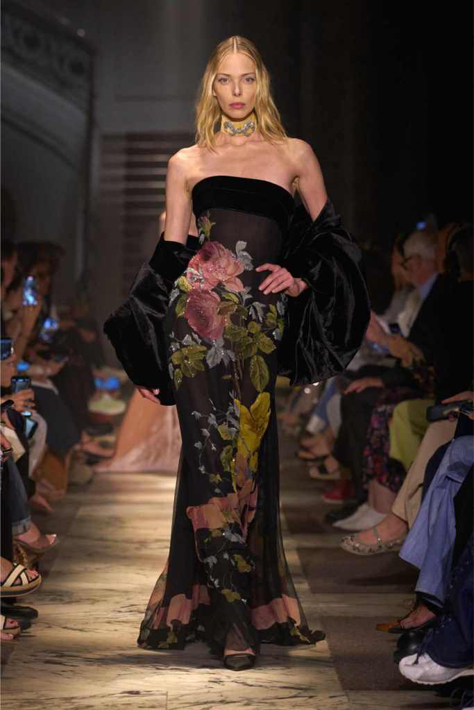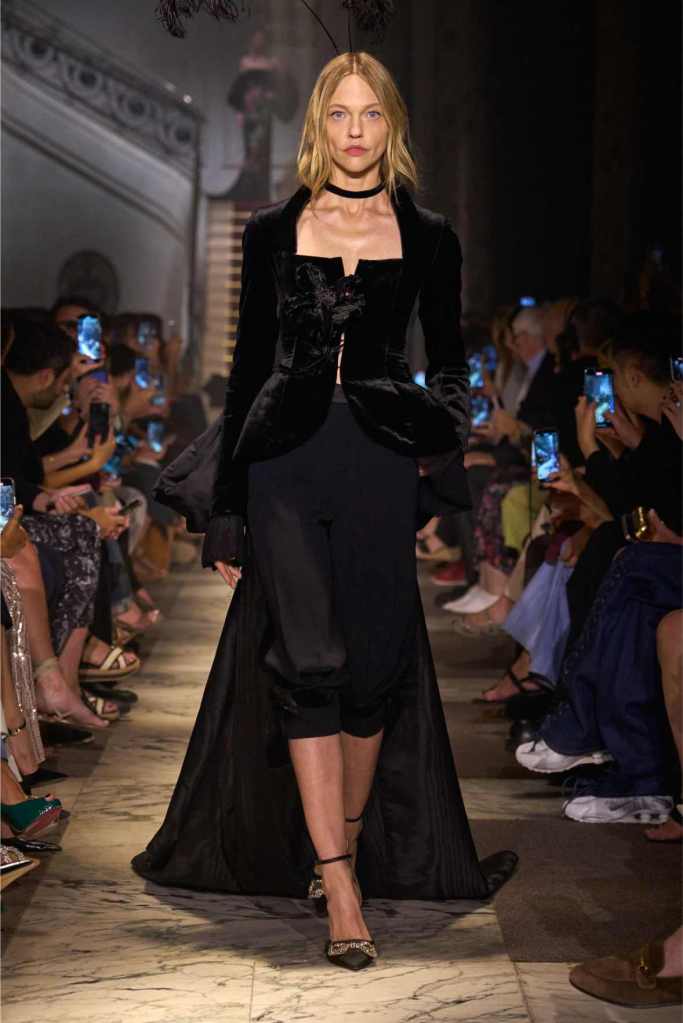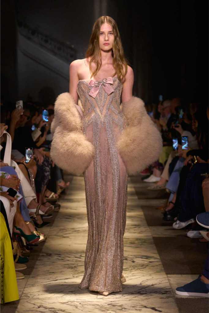 Set inside the ornate Pavillon Cambon in Paris, the show opened with a sultry twist. Lara Stone, Sasha Pivovarova, and Isabeli Fontana strutted down the staircase in corseted black velvet gowns—seductive, sculptural, and surprisingly minimal. It was a bold contrast to what followed: a sugary explosion of macaron hues like rose pink, mint, pistachio, and baby blue.