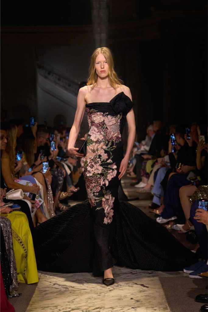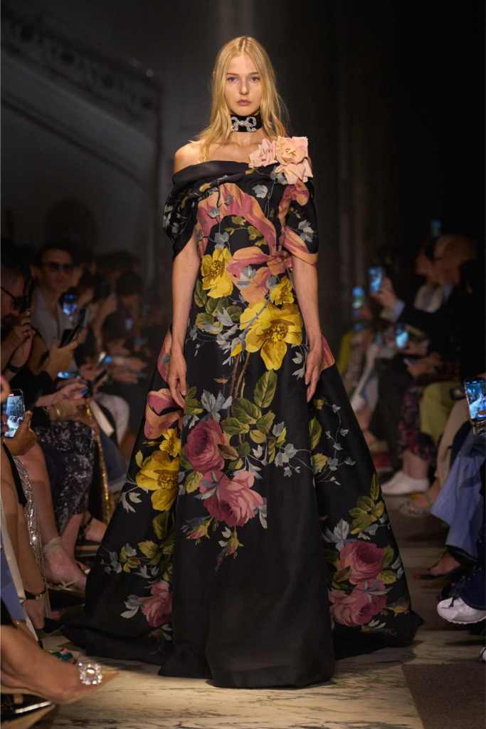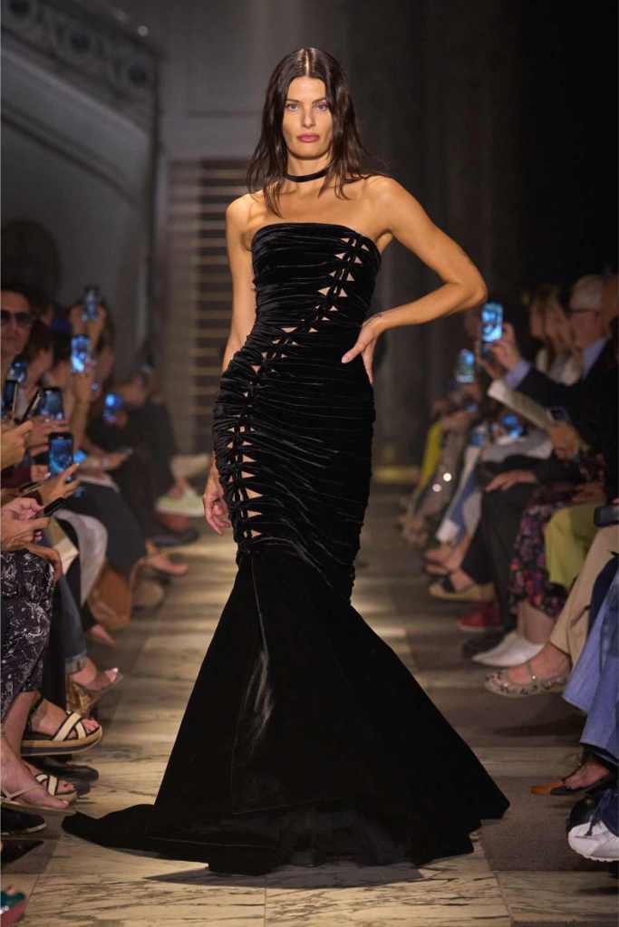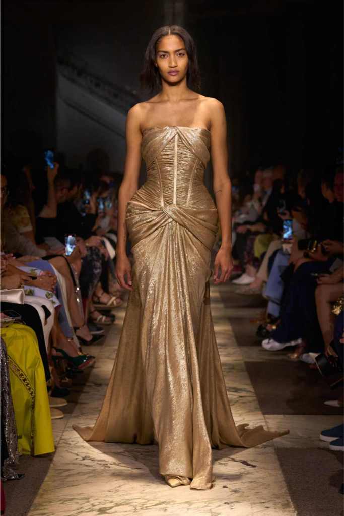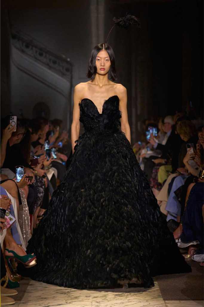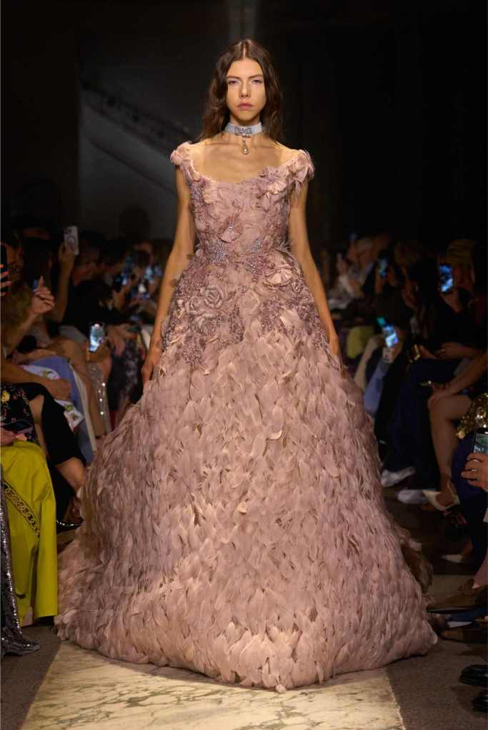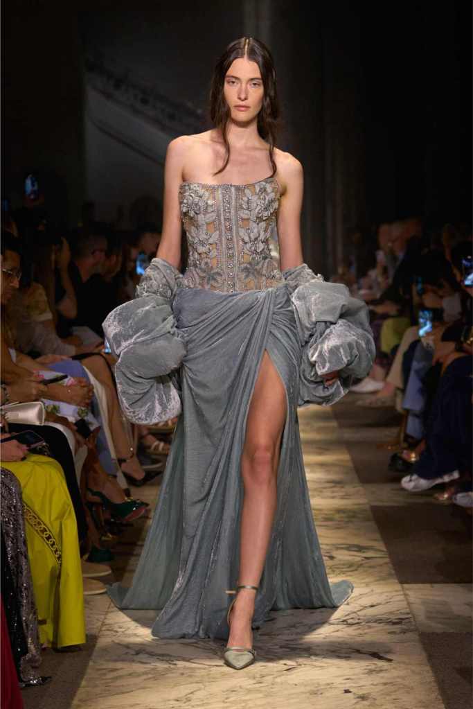 Set inside the ornate Pavillon Cambon in Paris, the show opened with a sultry twist. Lara Stone, Sasha Pivovarova, and Isabeli Fontana strutted down the staircase in corseted black velvet gowns—seductive, sculptural, and surprisingly minimal. It was a bold contrast to what followed: a sugary explosion of macaron hues like rose pink, mint, pistachio, and baby blue.