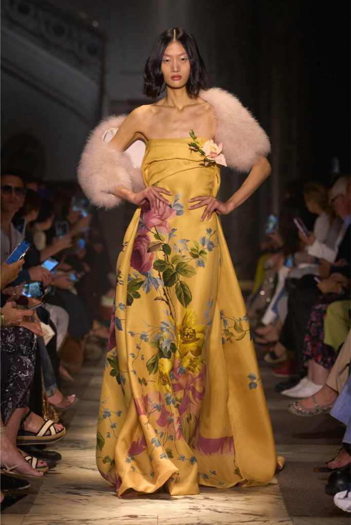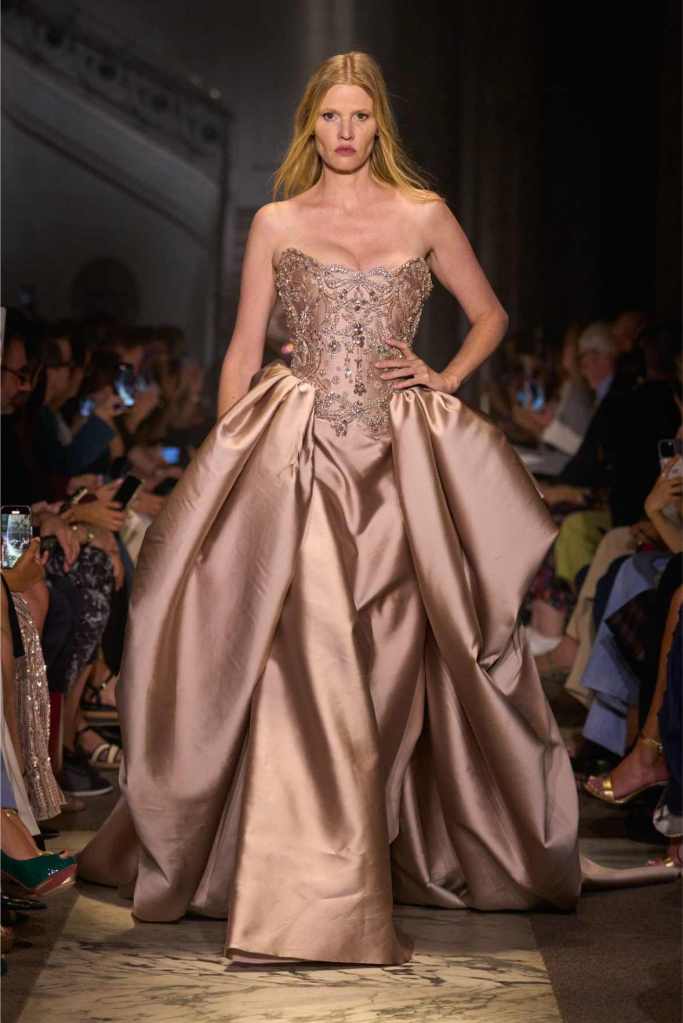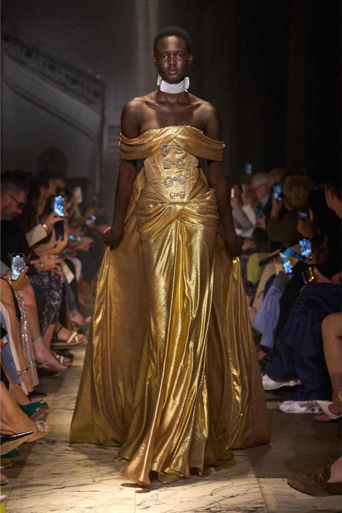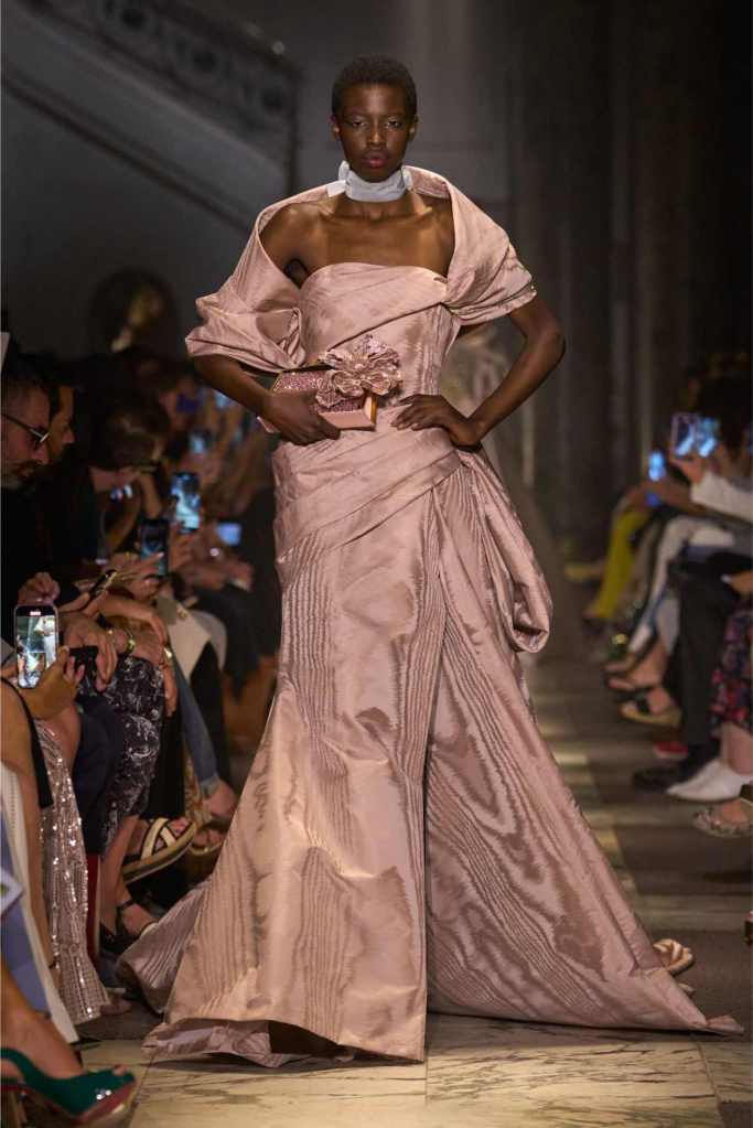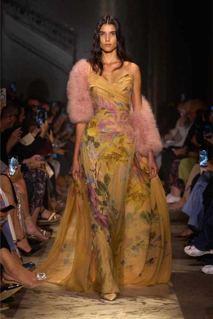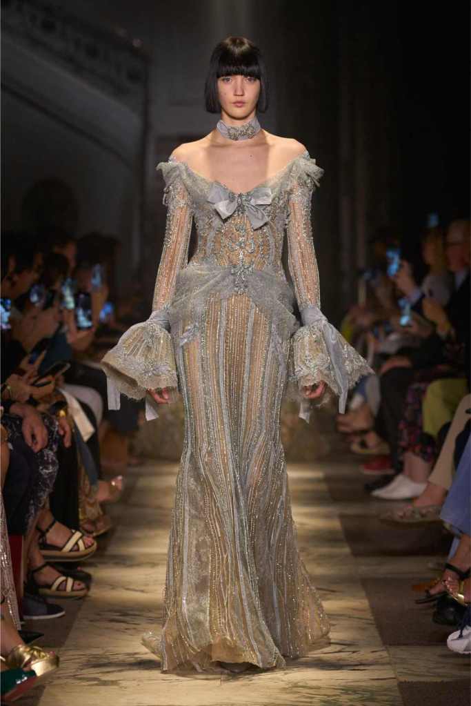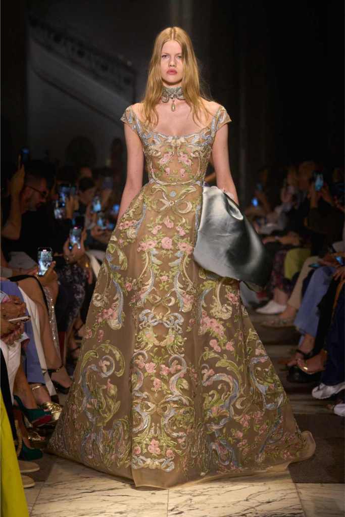 Set inside the ornate Pavillon Cambon in Paris, the show opened with a sultry twist. Lara Stone, Sasha Pivovarova, and Isabeli Fontana strutted down the staircase in corseted black velvet gowns—seductive, sculptural, and surprisingly minimal. It was a bold contrast to what followed: a sugary explosion of macaron hues like rose pink, mint, pistachio, and baby blue.