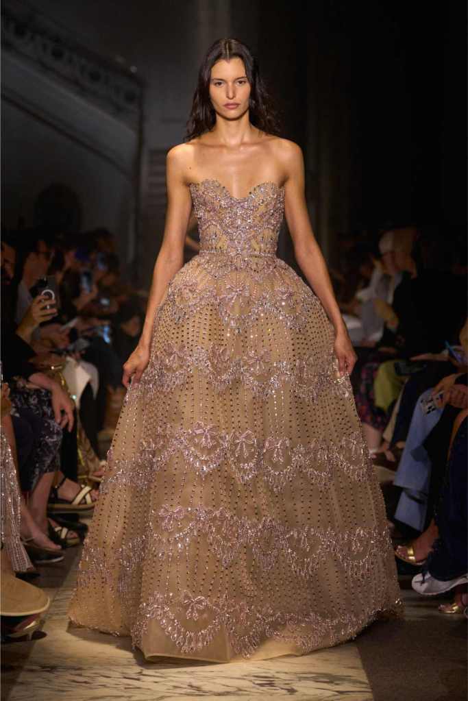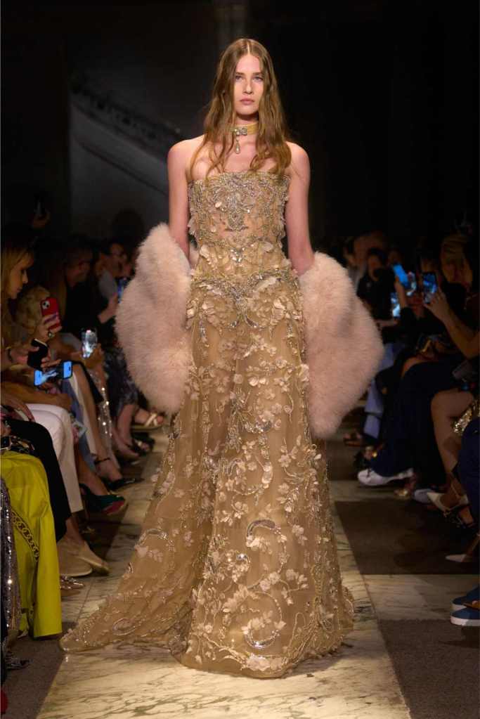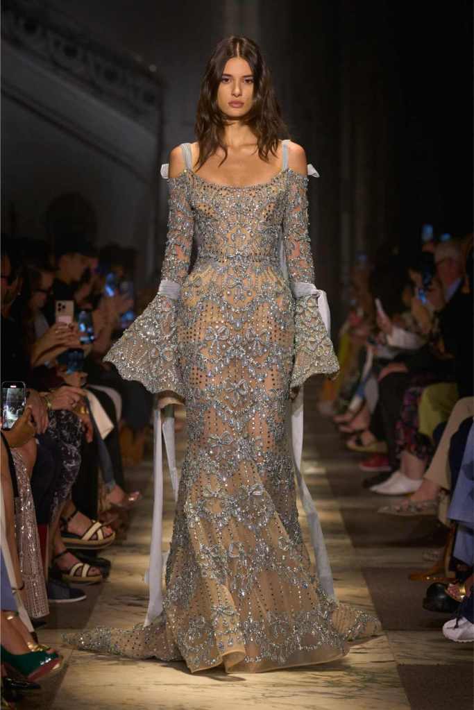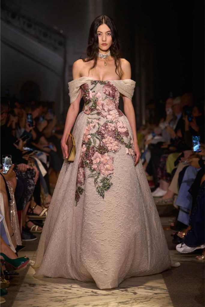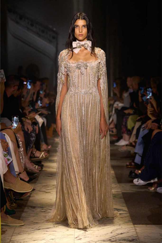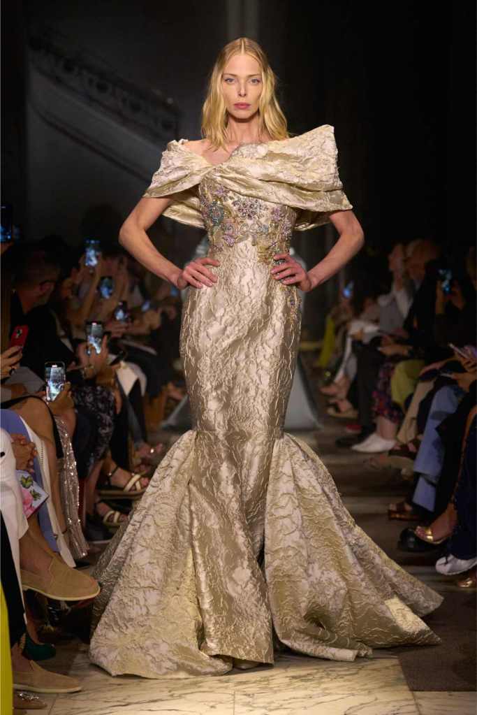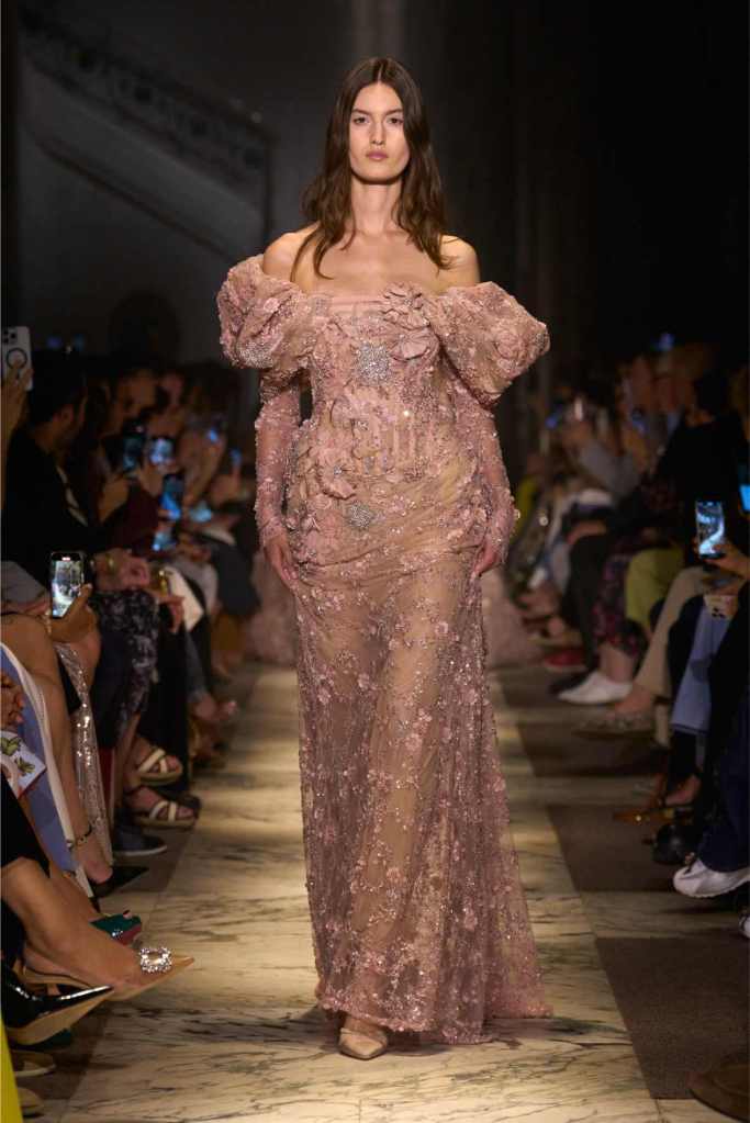 Inspired in part by a rewatch of Sofia Coppola’s Marie Antoinette, the show felt playful and cinematic—underscored by the soundtrack’s cheeky use of “I Want Candy.” And candy it was. Think flowing capes, poufed skirts, delicate lace, and bugle-beaded florals—all crafted with Saab’s signature finesse. Every detail was meticulous, from knotted duchess satin to feathered pyramid gowns. French fabrics, antique techniques, and light padding gave volume without stiffness—showcasing just how far Saab’s craftsmanship can go. It’s not everyday errands Saab dresses for—it’s the moments that call for a little magic.