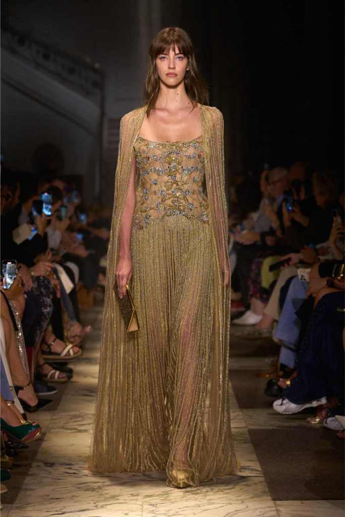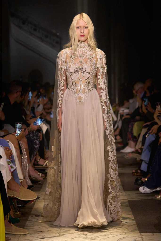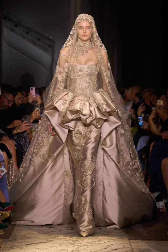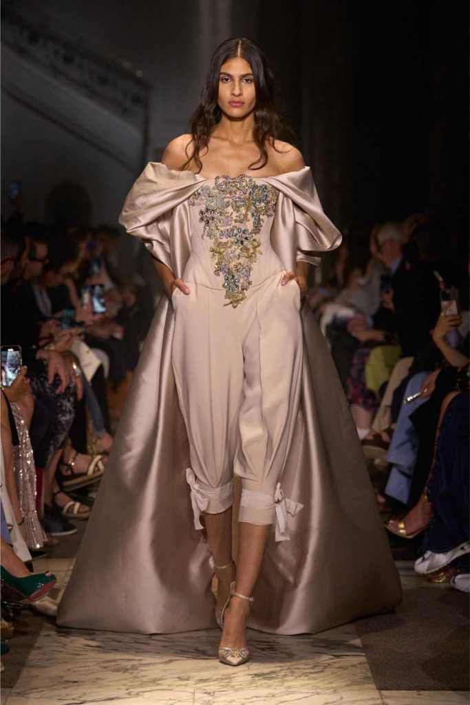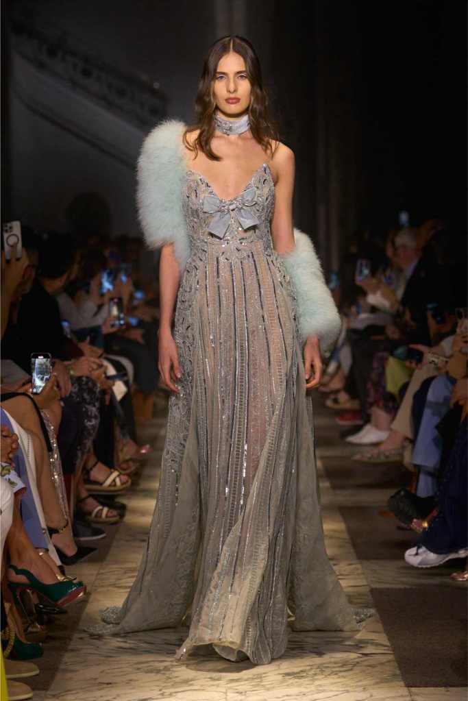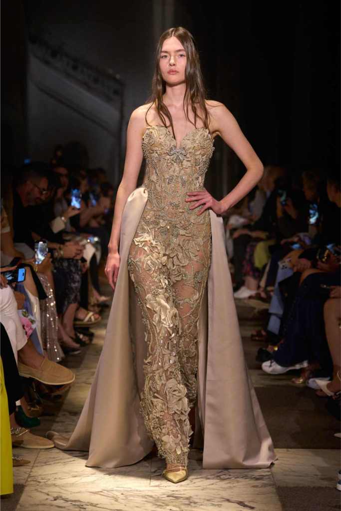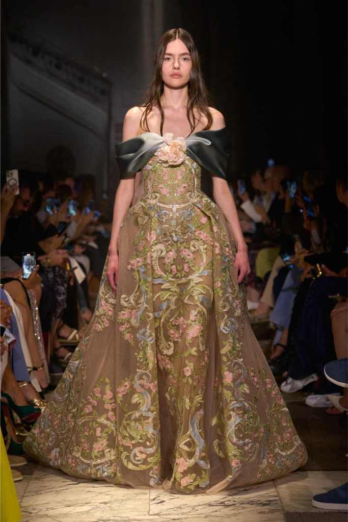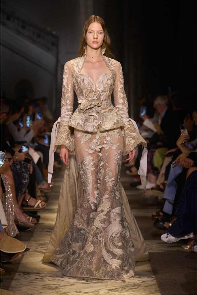 Inspired in part by a rewatch of Sofia Coppola’s Marie Antoinette, the show felt playful and cinematic—underscored by the soundtrack’s cheeky use of “I Want Candy.” And candy it was. Think flowing capes, poufed skirts, delicate lace, and bugle-beaded florals—all crafted with Saab’s signature finesse. Every detail was meticulous, from knotted duchess satin to feathered pyramid gowns. French fabrics, antique techniques, and light padding gave volume without stiffness—showcasing just how far Saab’s craftsmanship can go. It’s not everyday errands Saab dresses for—it’s the moments that call for a little magic.