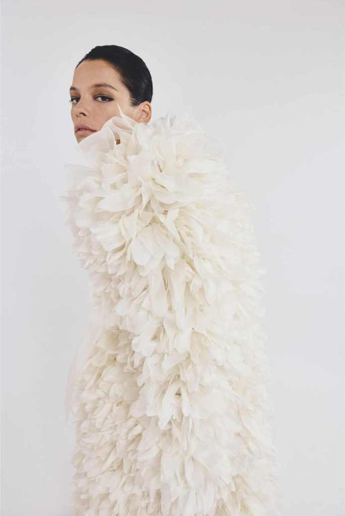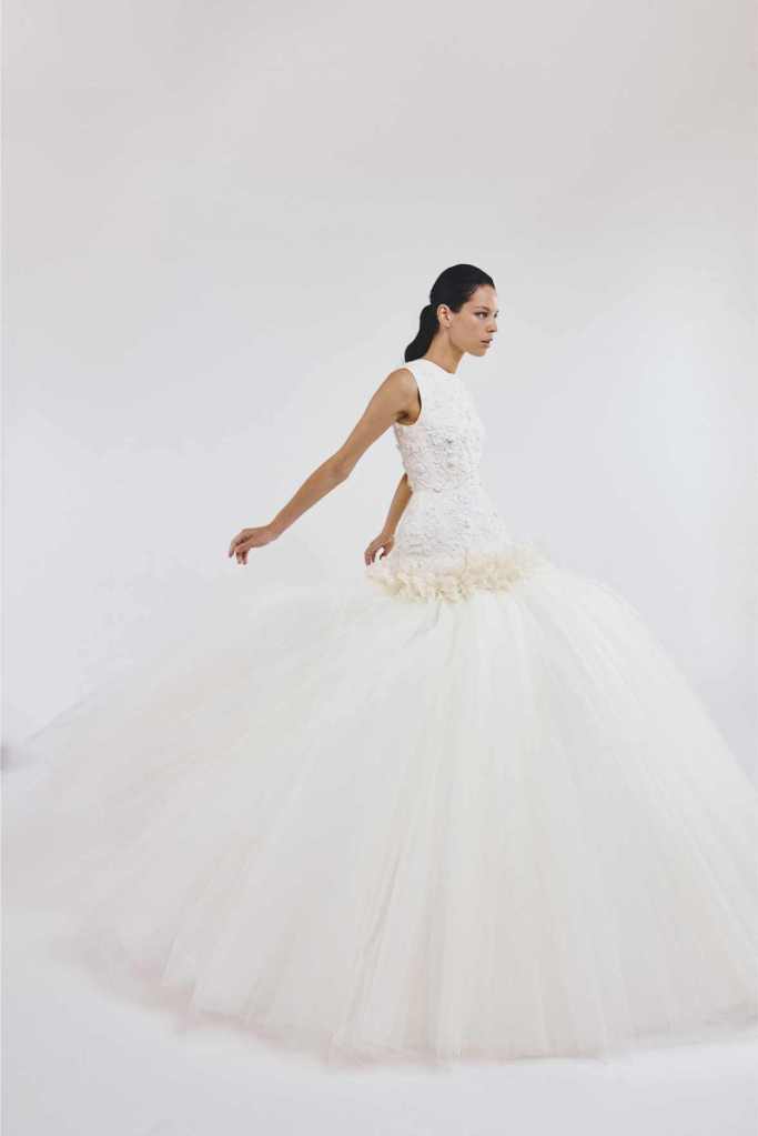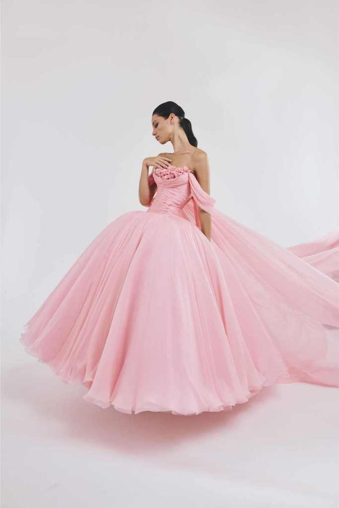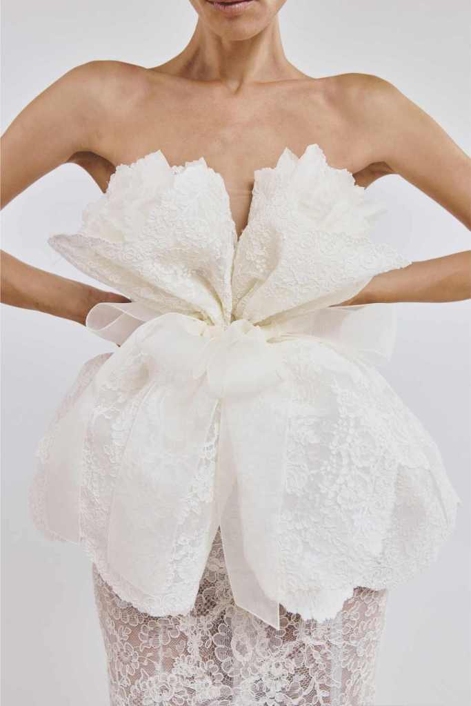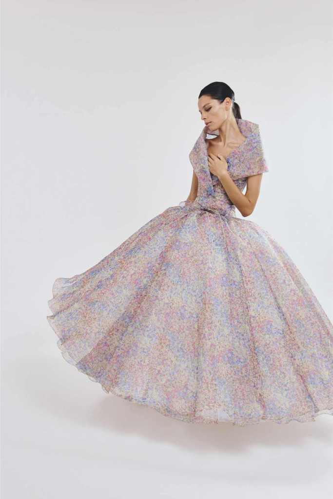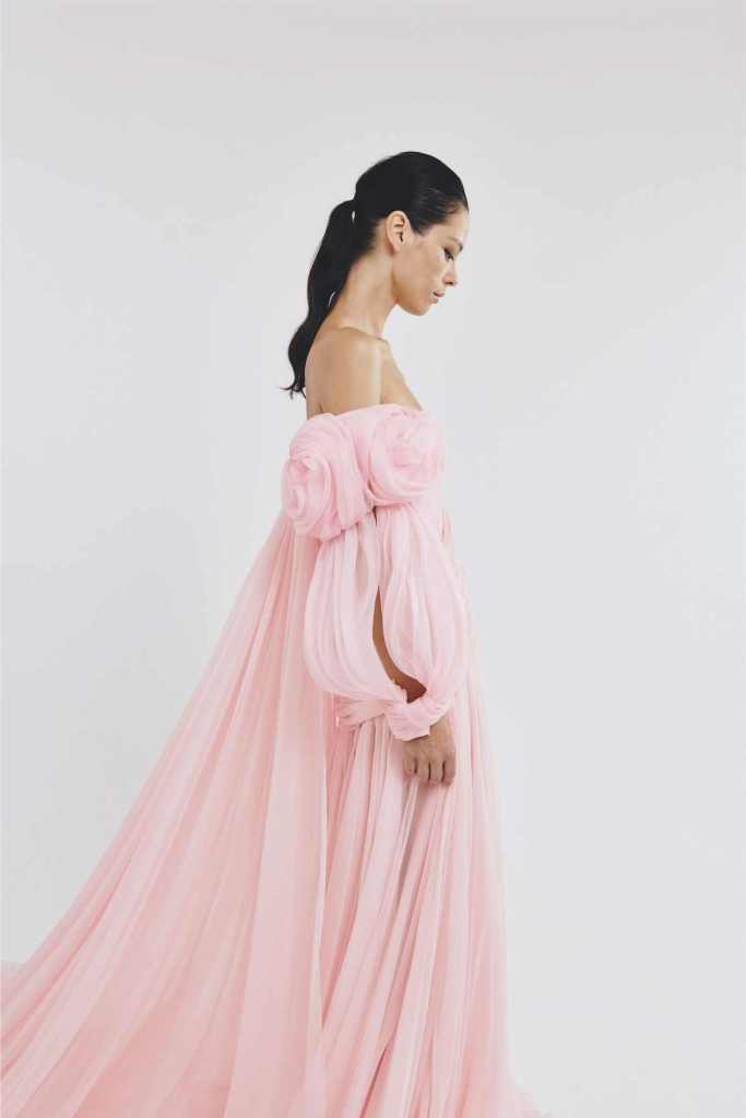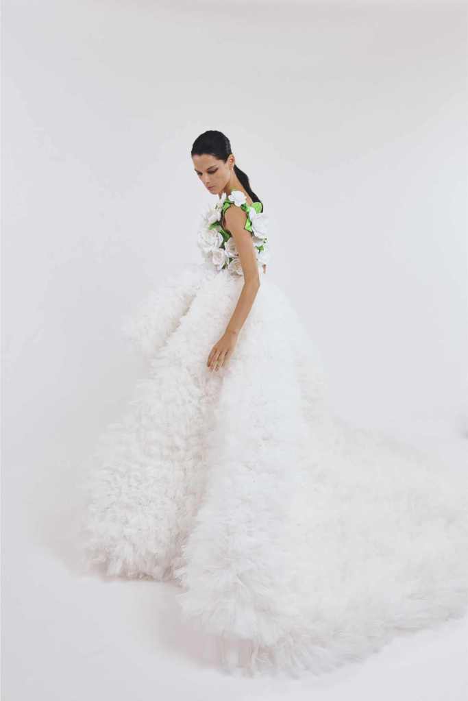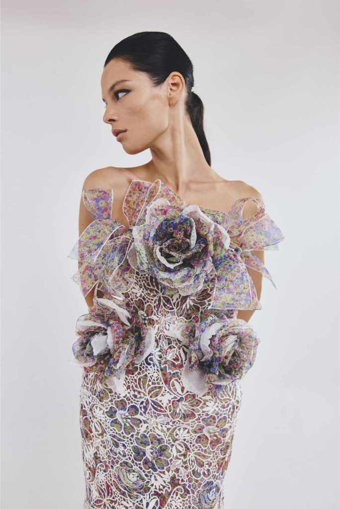 Instead of a traditional runway show, Valli displayed his creations on mannequins so guests could really take in every detail. And honestly, it was worth the pause. The pieces were full of what Valli does best—romance, elegance, and those floaty, feminine shapes that feel like a breath of fresh air. There were layers of soft tulle, delicate pleats, and floral touches so intricate they looked like they were plucked straight from a garden. One bodice had tiny flowers that looked like feathers—but surprise, it was actually silk organza.