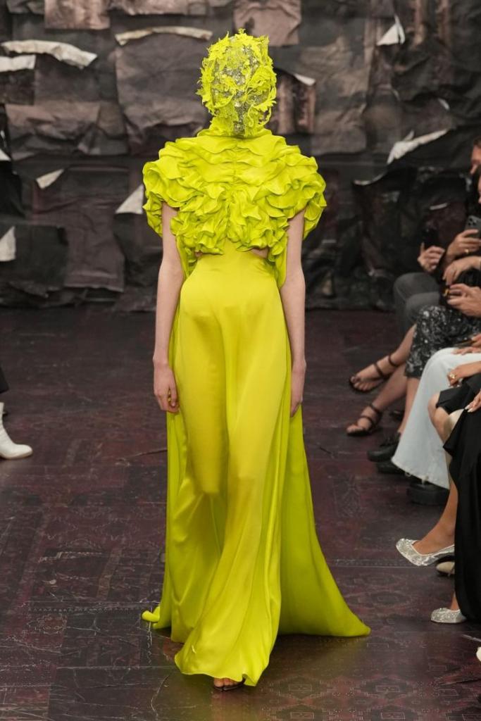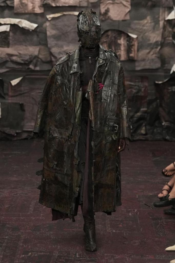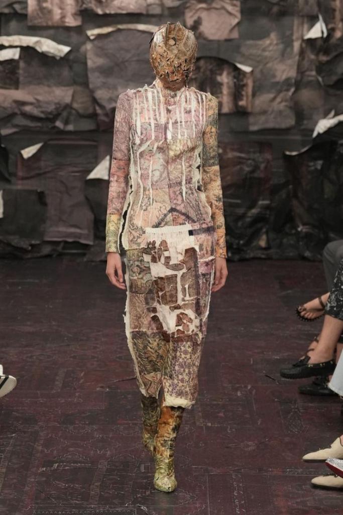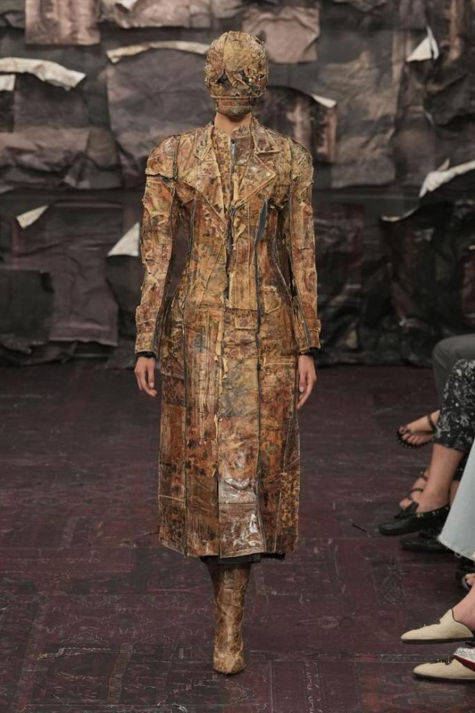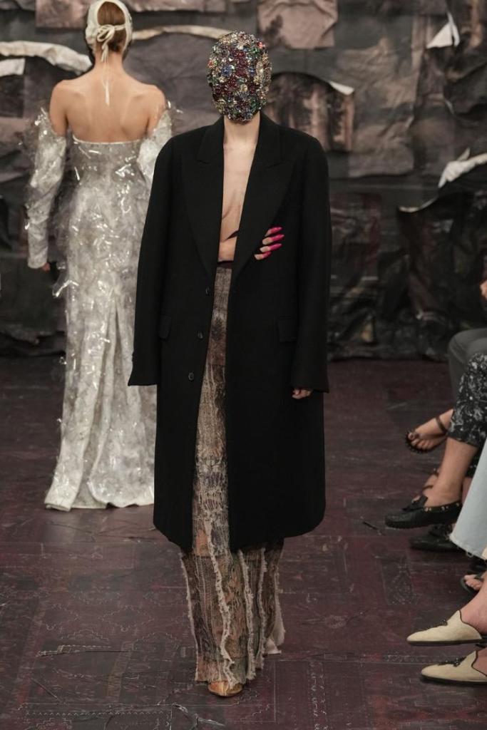 Martens, a proud Belgian like Margiela himself, didn’t shy away from the house’s legacy—he dove headfirst into it. His signature wit and weirdness showed up in clever touches: boots with no heels, knit dresses made entirely of beads, even tin plates turned into headpieces. It was couture, but make it twisted, textured, and deeply poetic.
