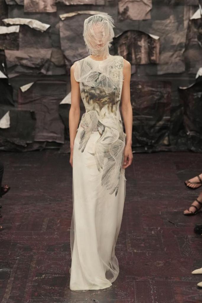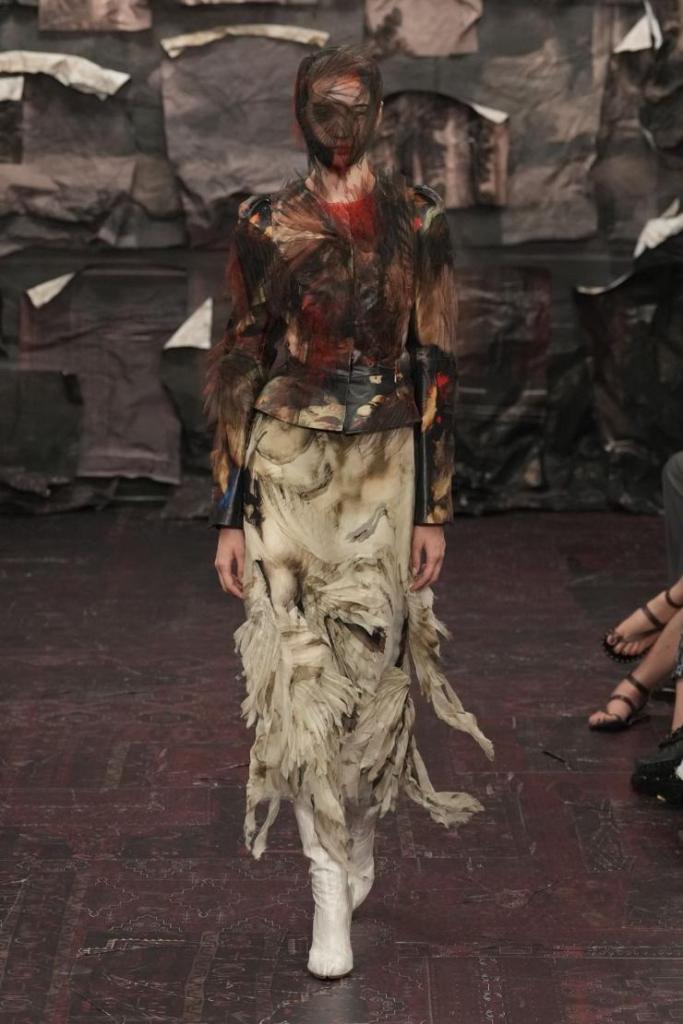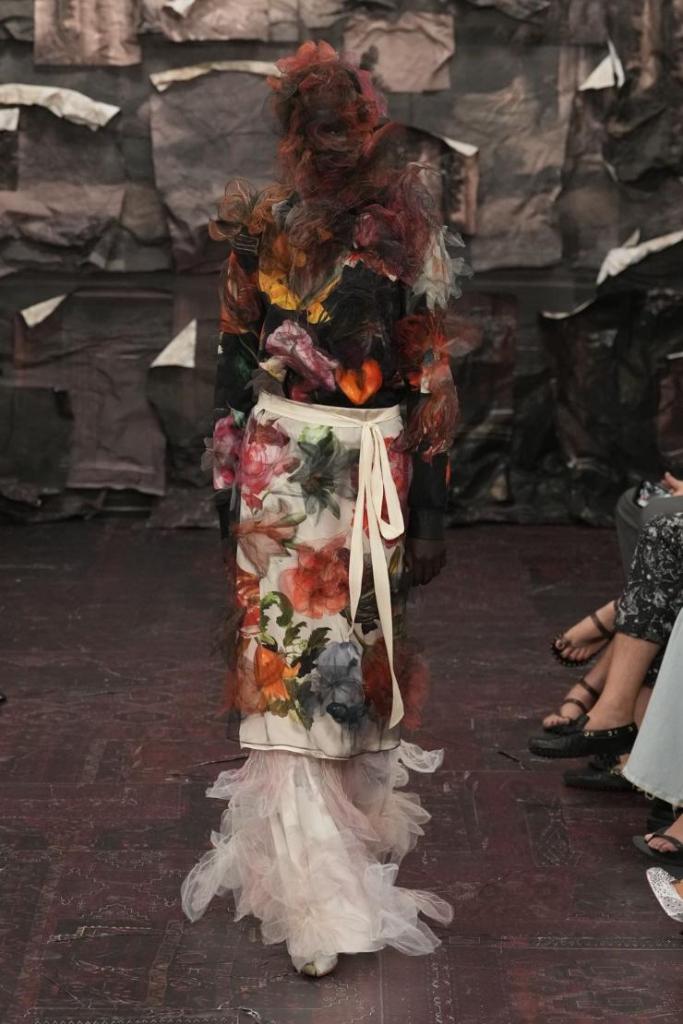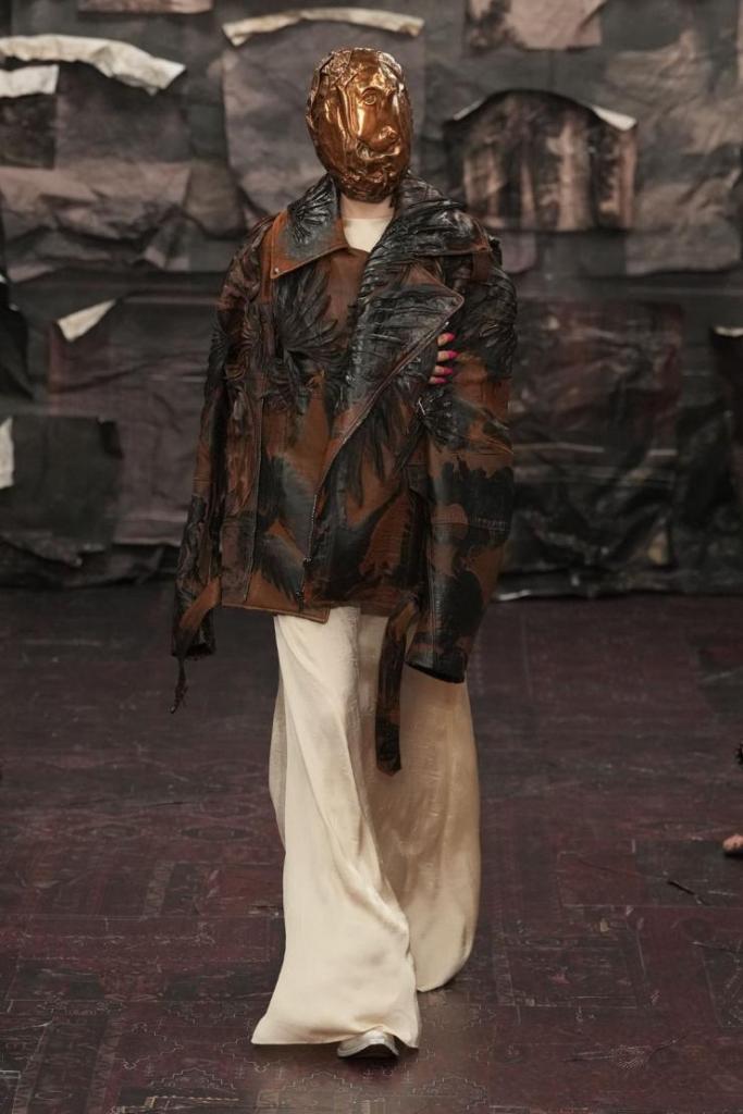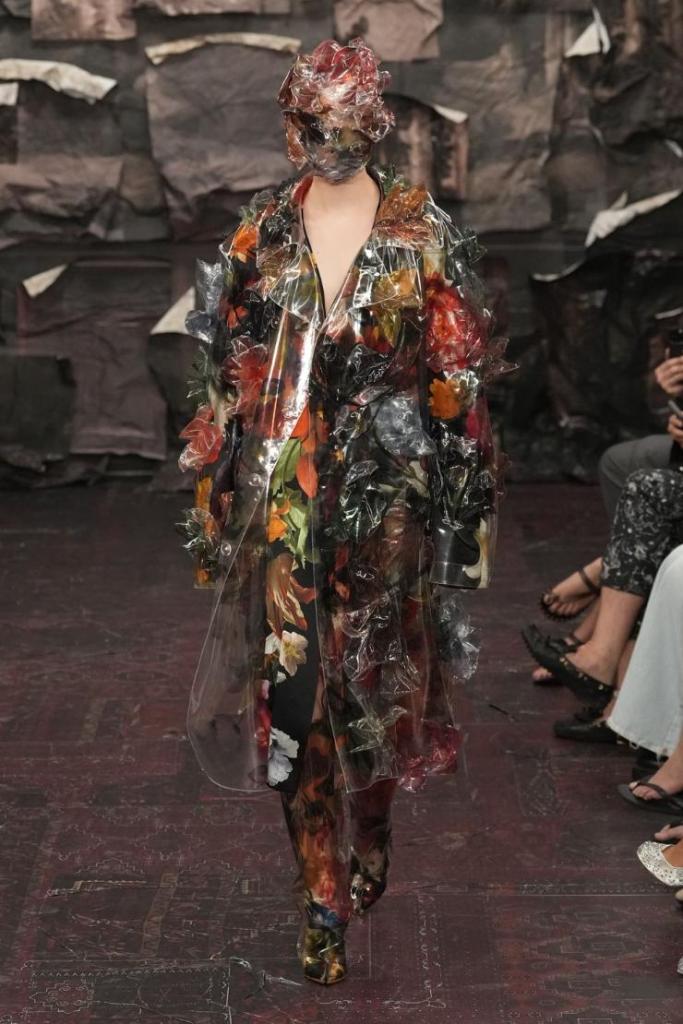 The show opened in near darkness, unfolding in rooms lined with peeling wallpaper and decaying textures—a literal stage set for the beauty and chaos to come. Models floated in masks—some glittering, some ghostly—wearing everything from plastic-wrapped gowns to velvet drapes, all laced with historical references and surreal detail. Think: 17th-century Flemish wallpaper, Dutch nature paintings, and punk-era rebellion stitched into one fantastical vision.
