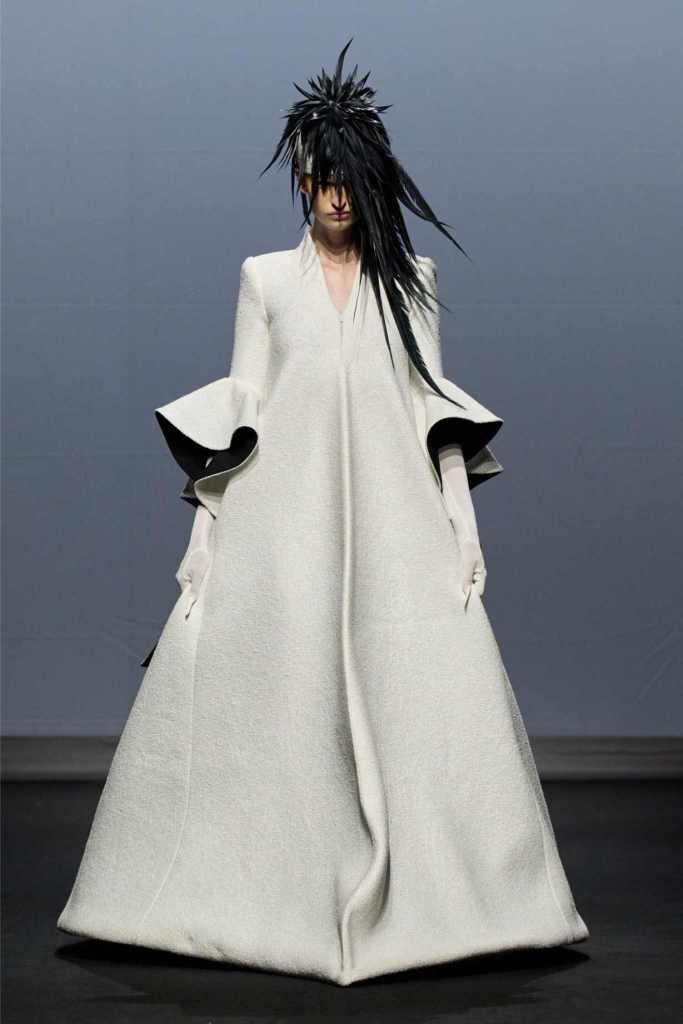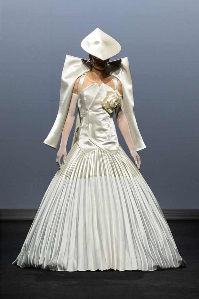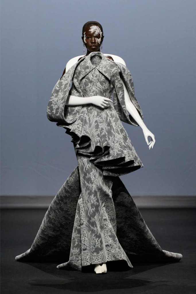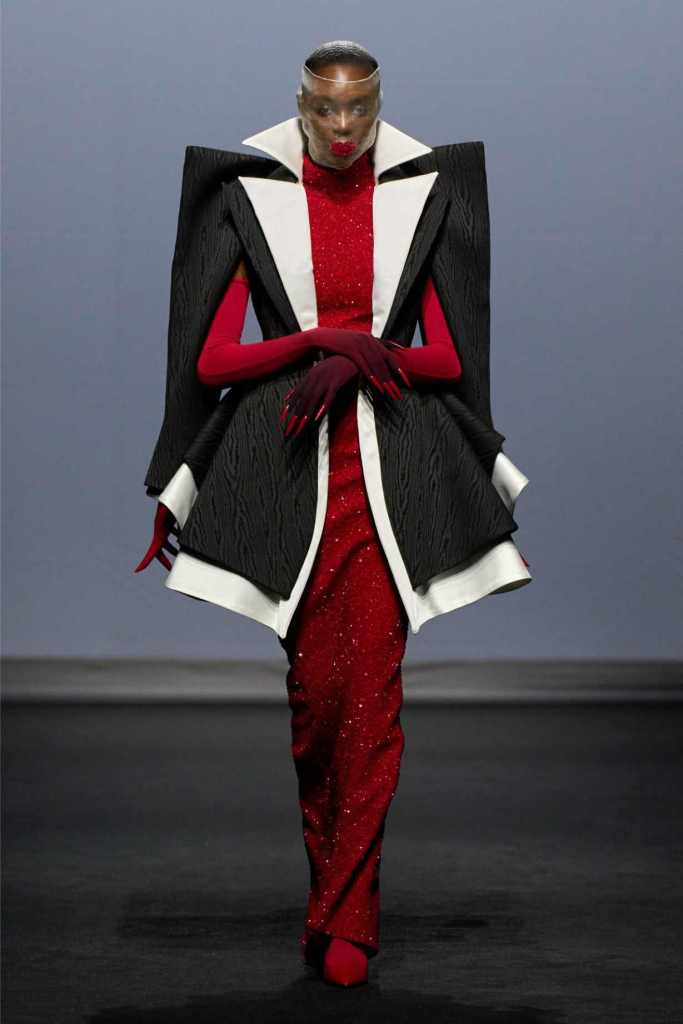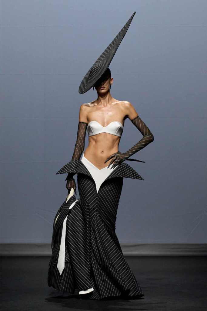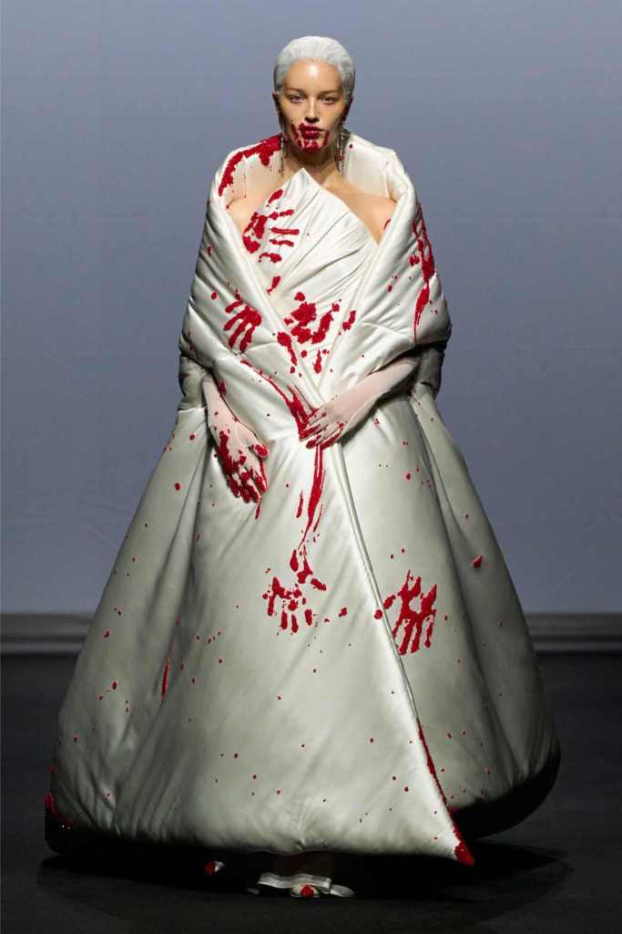 From the first look—a white quilted gown stamped with blood-red handprints—it was clear we weren’t in for a clean or quiet evolution. This was fashion as catharsis. Tailoring was twisted, deconstructed, and sometimes almost monstrous: jackets with extra arms, corsets with blown-up collars, and suit jackets carried like rigid ghosts. Every silhouette seemed caught between falling apart and becoming something new.