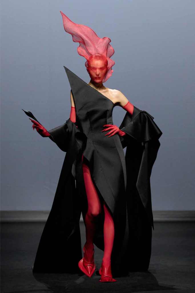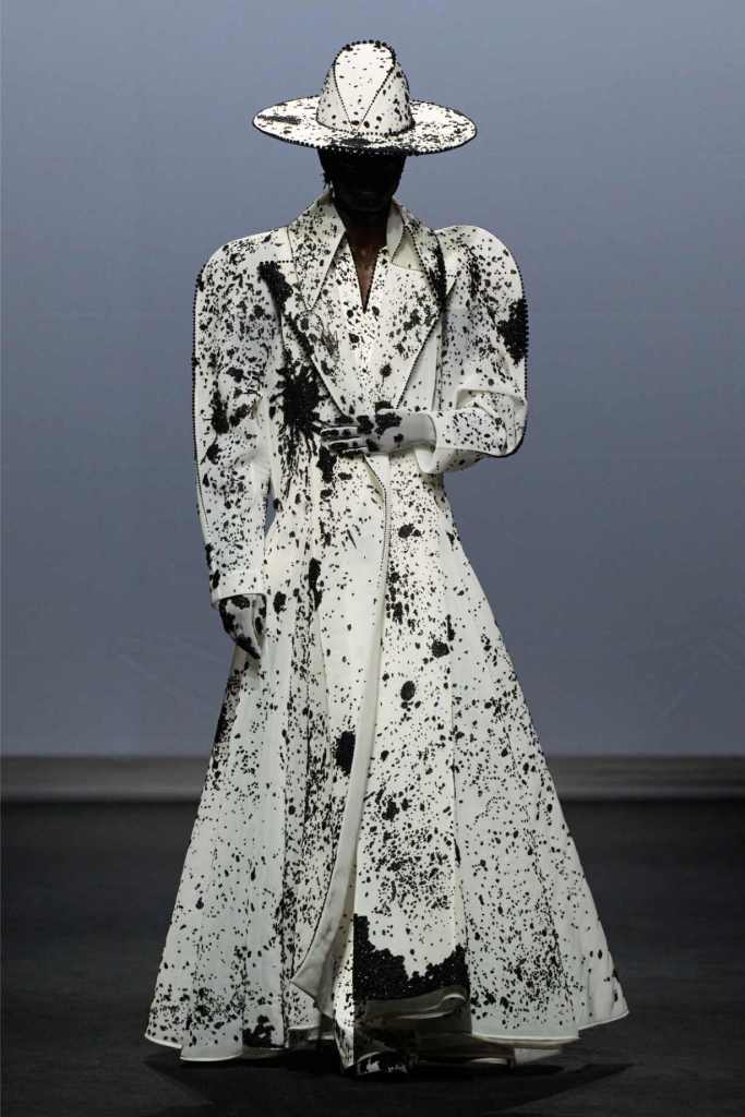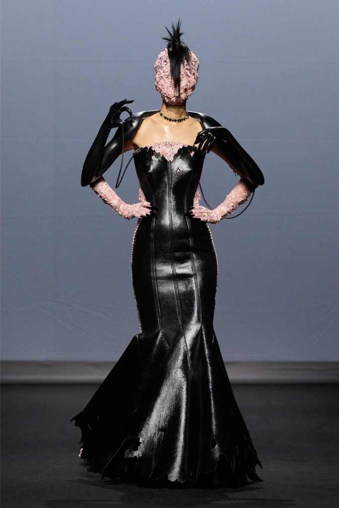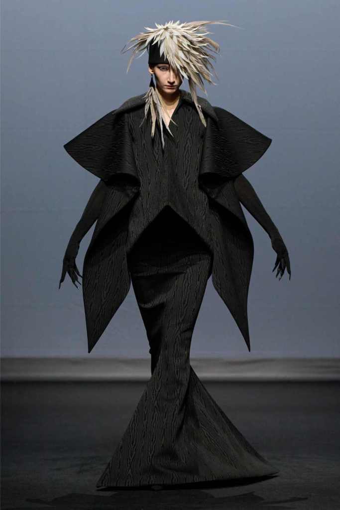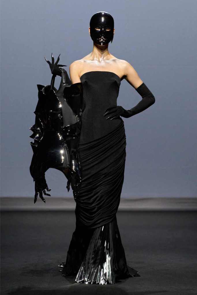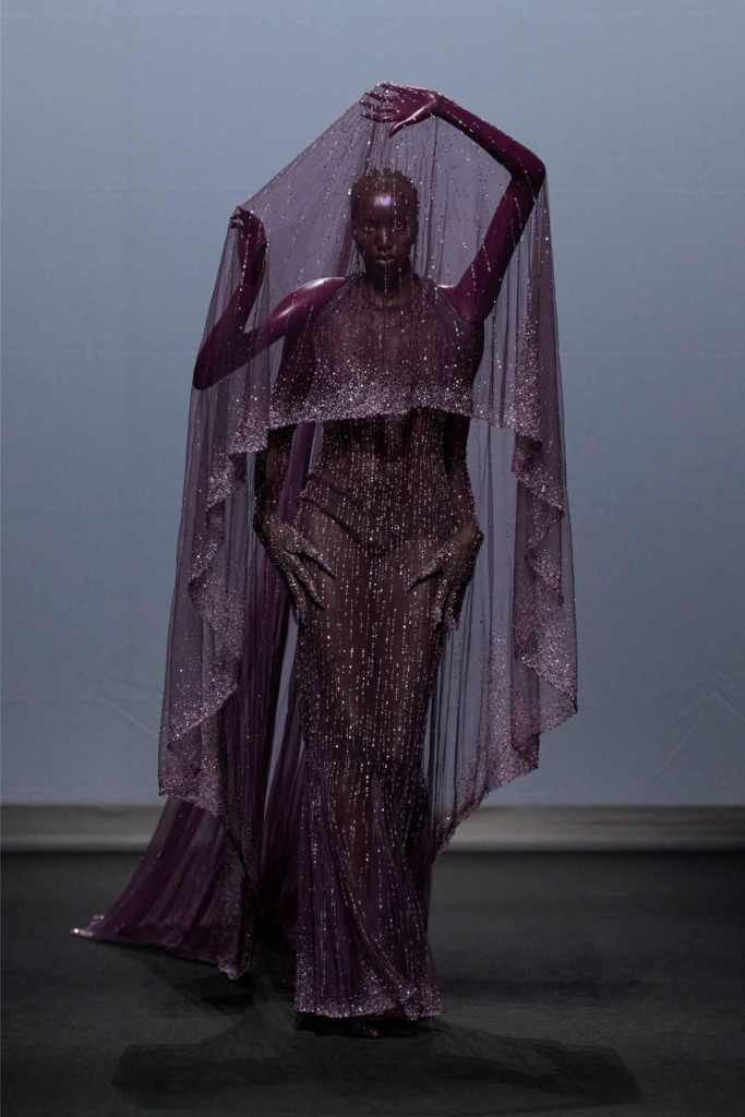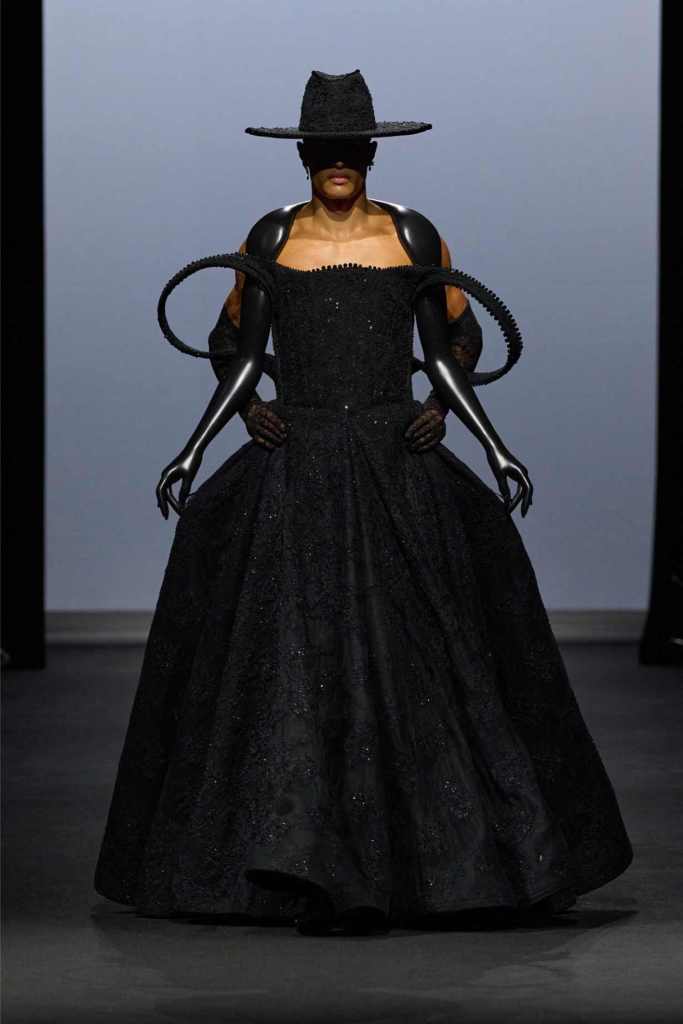 Accessories were equally surreal, bags in tiny tuxedos, gloves with crystal nails, veils dripping like rain or tears. Colours stayed moody and theatrical: inky blacks, bruised purples, flashes of blood and blush. It wasn’t just dramatic for the sake of it—every piece hinted at life’s big moments: weddings, losses, reinventions, breakdowns.