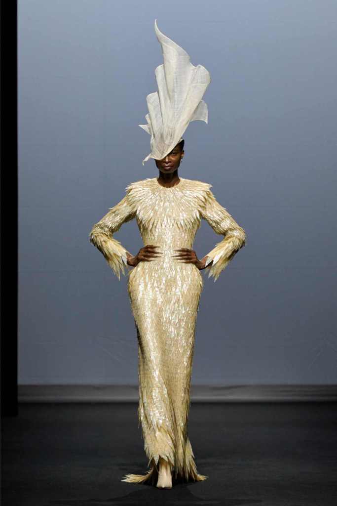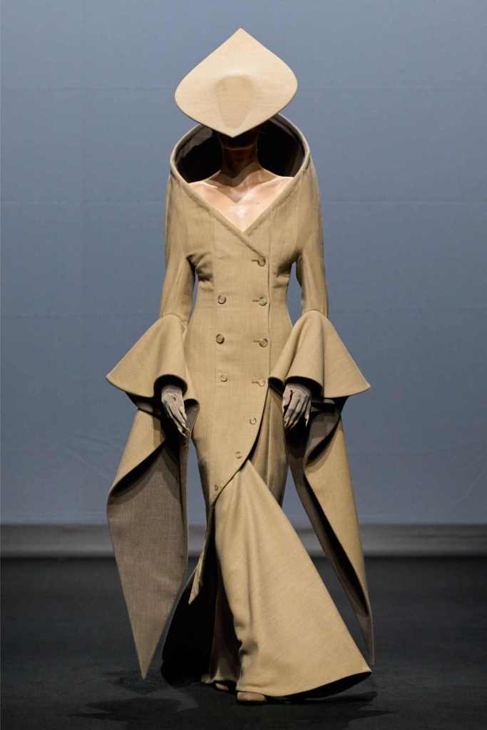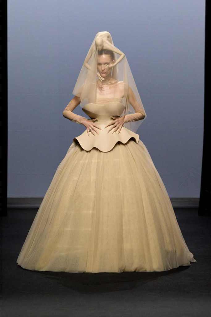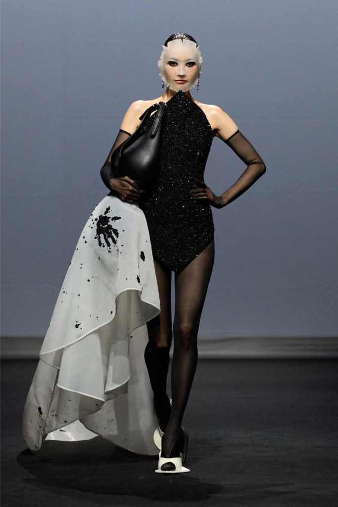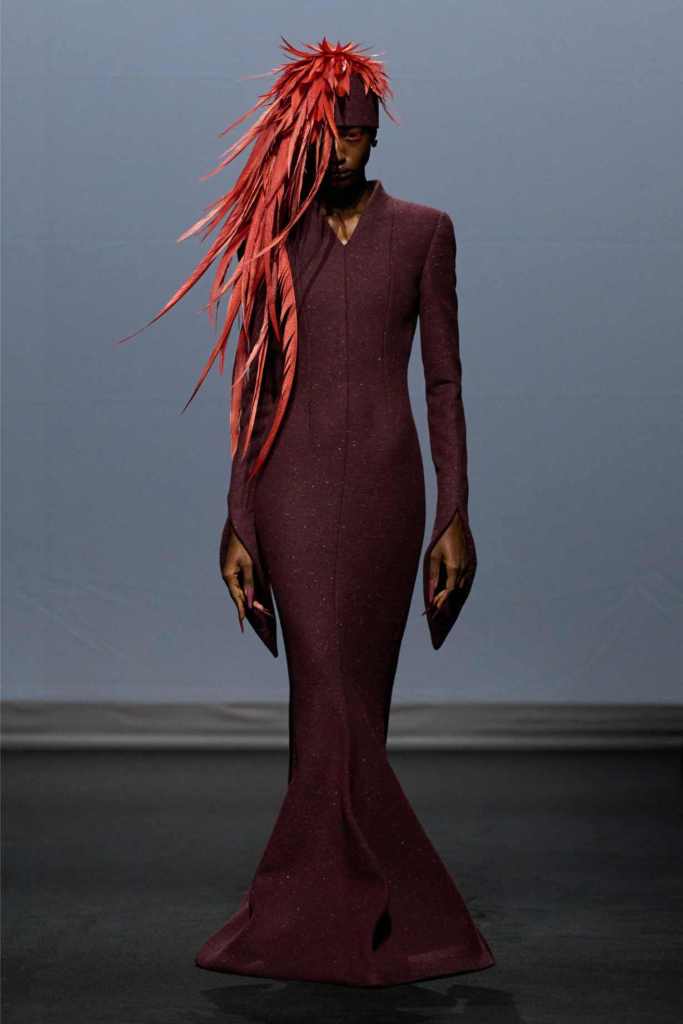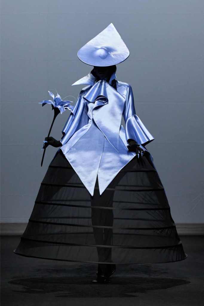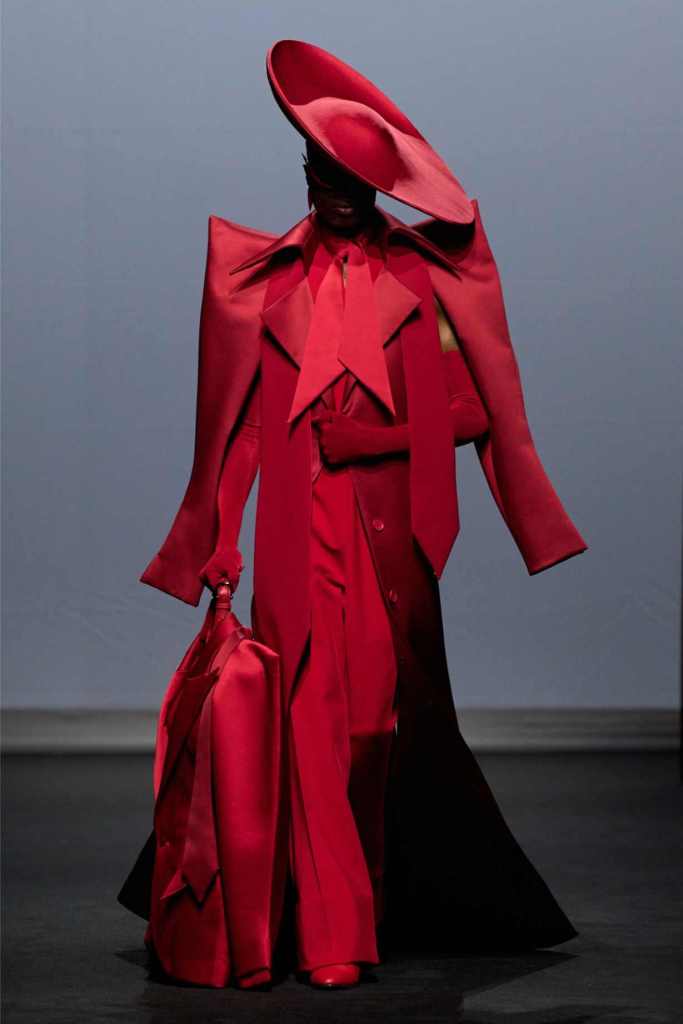 Accessories were equally surreal, bags in tiny tuxedos, gloves with crystal nails, veils dripping like rain or tears. Colours stayed moody and theatrical: inky blacks, bruised purples, flashes of blood and blush. It wasn’t just dramatic for the sake of it—every piece hinted at life’s big moments: weddings, losses, reinventions, breakdowns.
