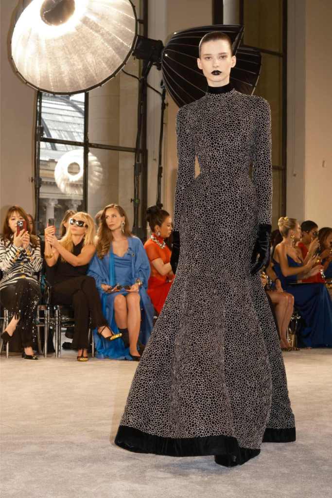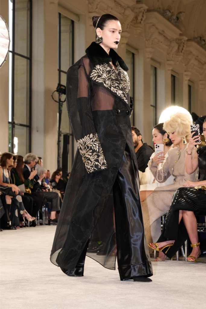 “Back to the Future” by Schiaparelli is a masterclass in reinterpreting history for tomorrow. Inspired by Elsa Schiaparelli’s revolutionary 1930s work and early black-and-white photographs, Roseberry stripped away color, focusing almost entirely on a stark palette of black, white, and silver, with powerful hints of red and metallics. The result? A collection that feels both deeply rooted in the past and strikingly futuristic.