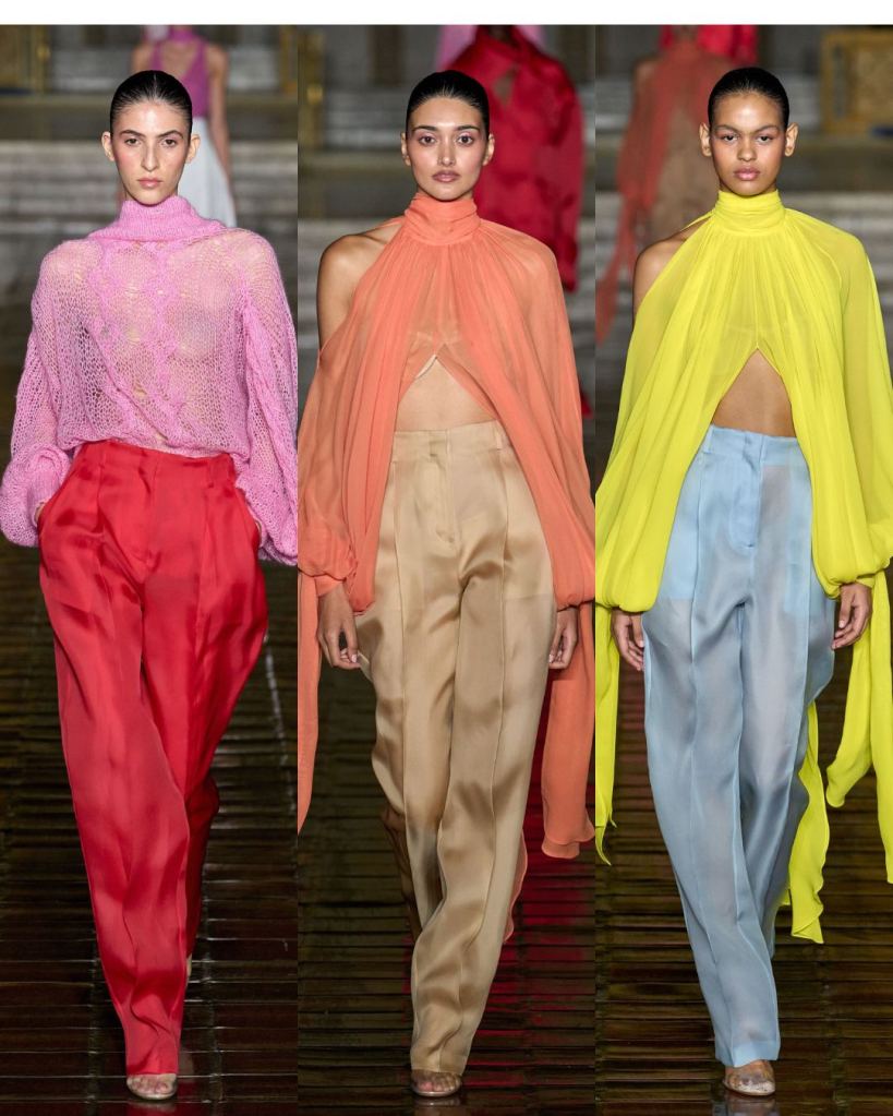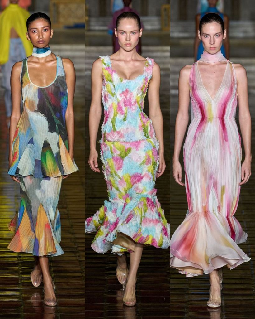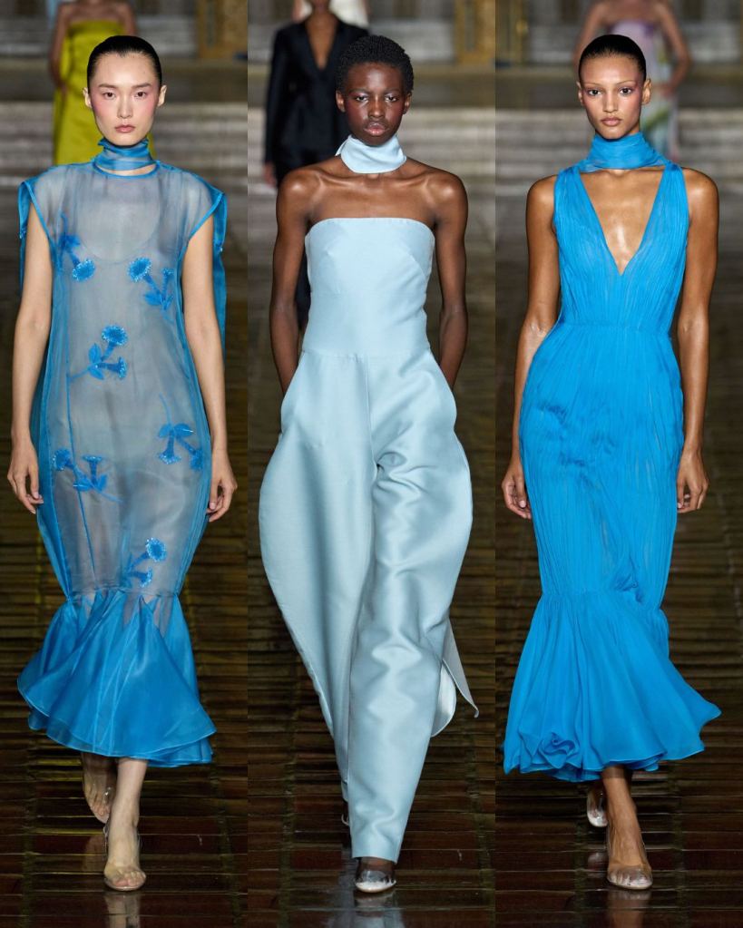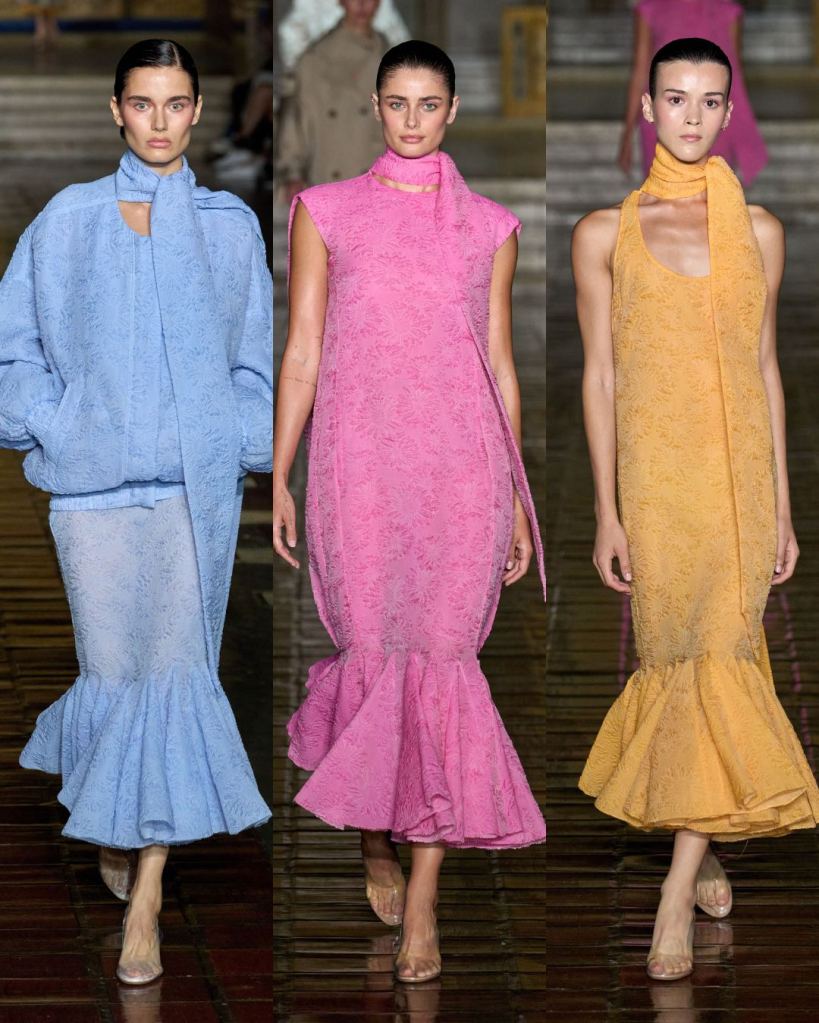 The collection was filled with femininity but carried a sense of maturity. Dresses moved with ease, from trumpet-hemmed whites that looked almost ethereal to evening gowns in vivid jewel tones. The fabrics—brocade, taffeta, cloqué—looked sumptuous but never heavy, and the color palette sang with hot pinks, corals, yellows, and blues. It felt girly but grounded.