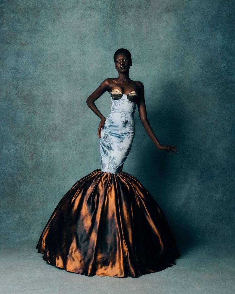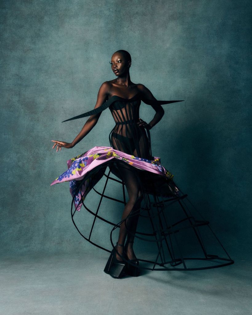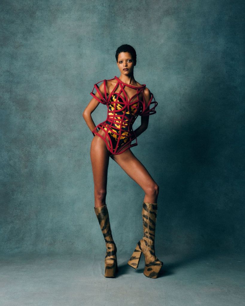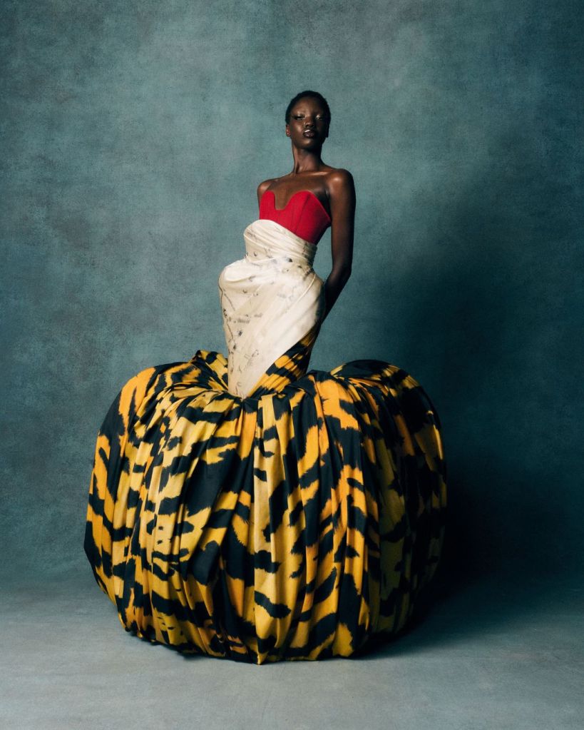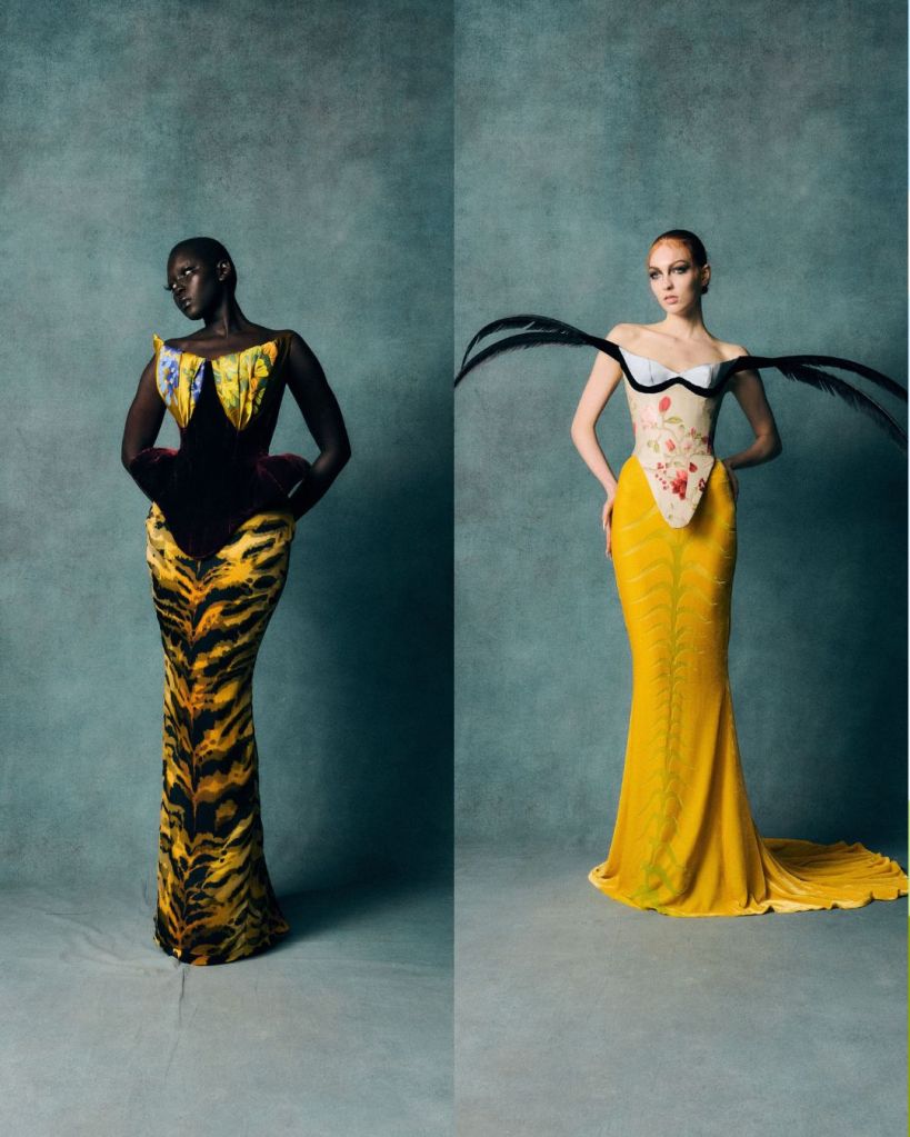 Staged in the moody Gothic Bar at the St. Pancras Hotel, the show leaned into a mix of fantasy and nostalgia, drawing on 70s London nightlife, animal prints, and Reed’s signature sense of theatrical excess. Leopard and tiger patterns brushed up against duchess satins, frothy tulles, feathers, and gilded wallpapers, the kind of textures that make you lean closer just to take it all in. The title “The Aviary” was fitting, with cage-like structures and winged silhouettes suggesting both confinement and freedom, making the models feel like rare birds in motion.