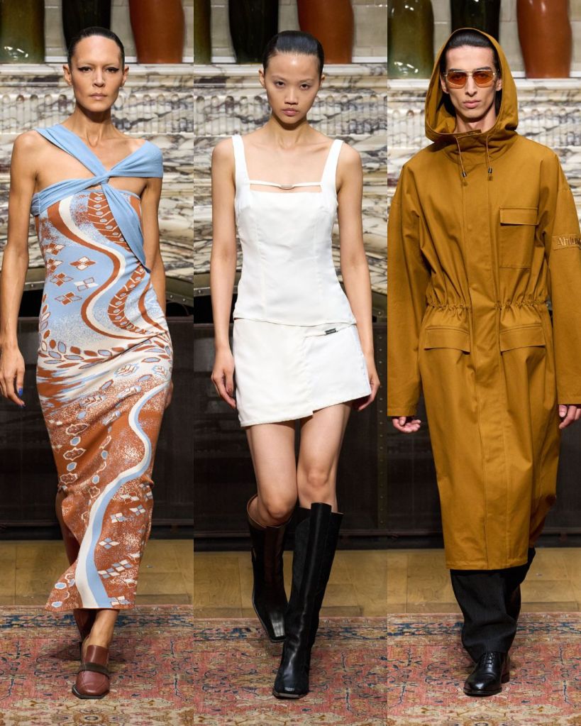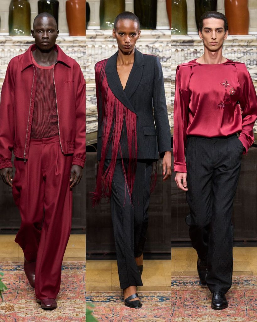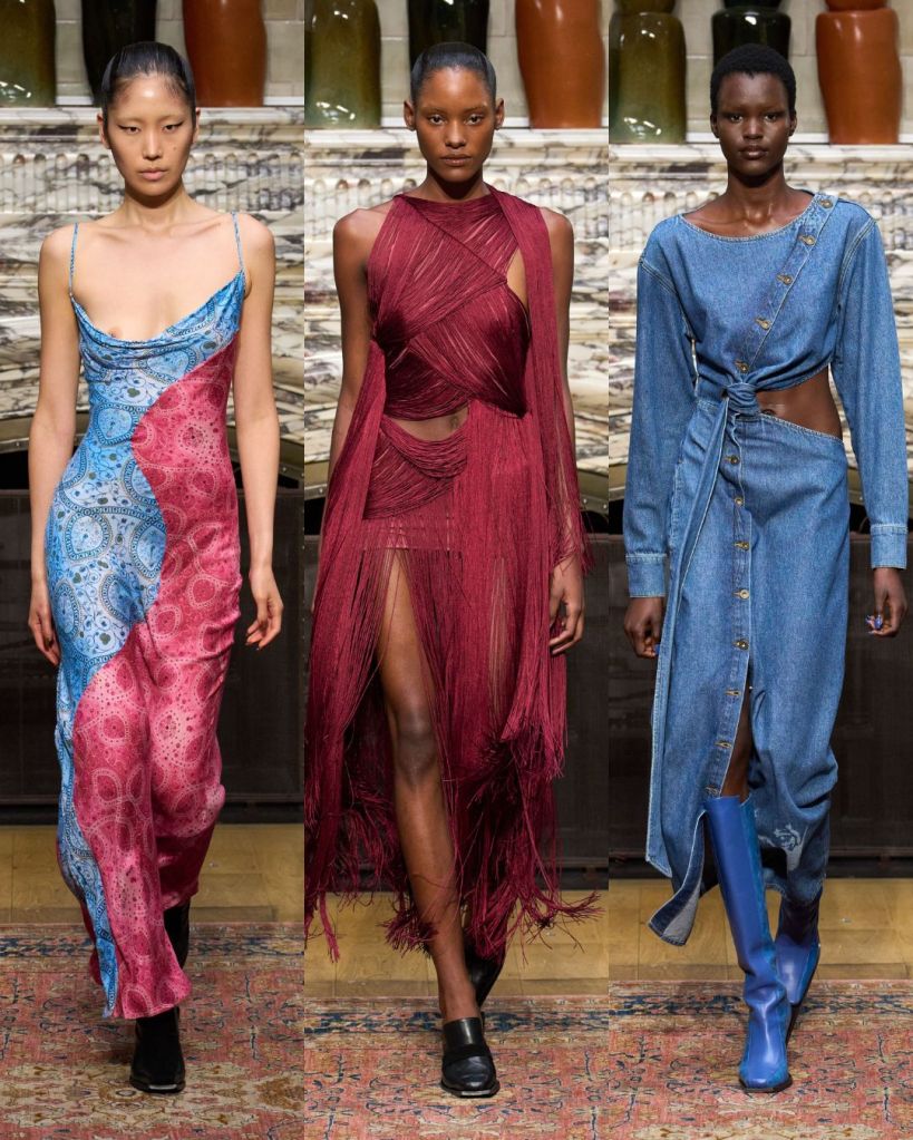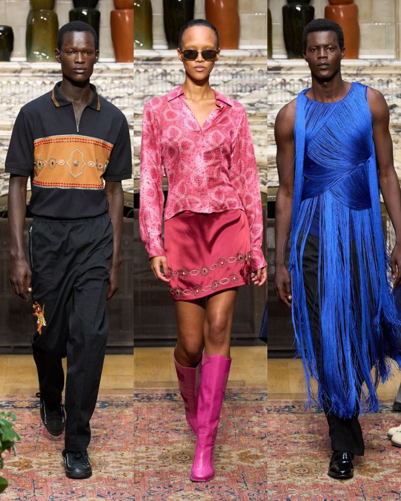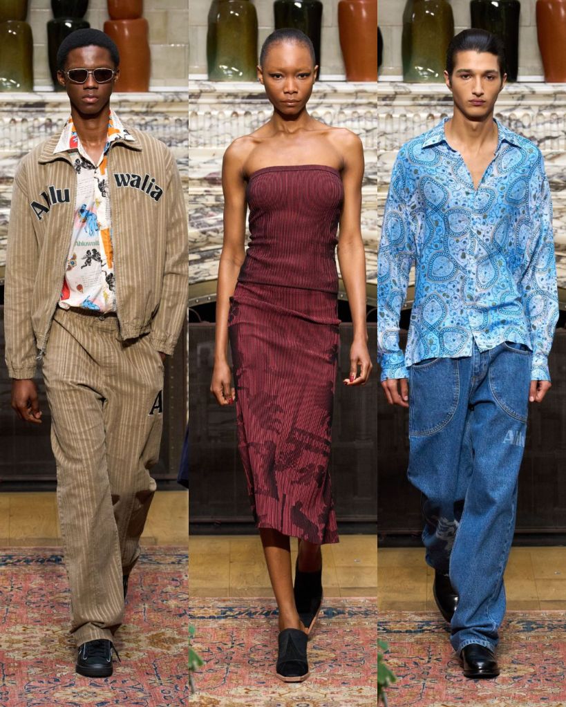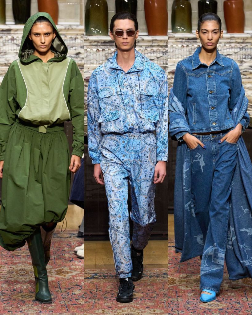 The palette was lush and emotional, ranging from jewel greens and sapphire blues to scarlets, rubies, and soft pinks. Textures amplified the storytelling: satins whispered with sensuality, while plaited knits suggested intimacy and embrace. True to Ahluwalia’s ethos, sustainability was woven throughout, from recycled fabrics and laser-printed denim to partnerships supporting circular fashion initiatives.