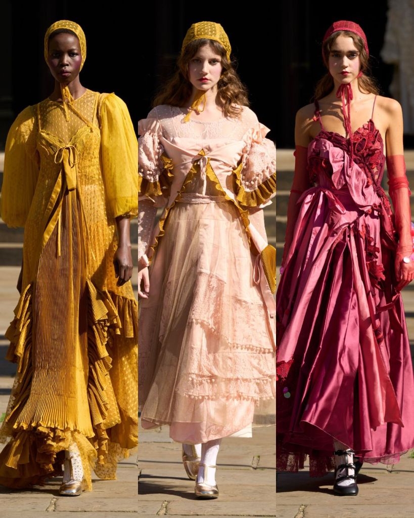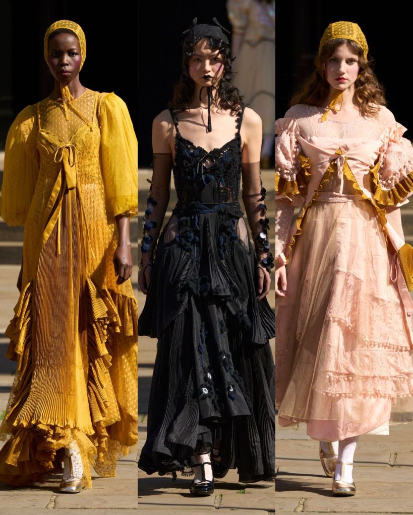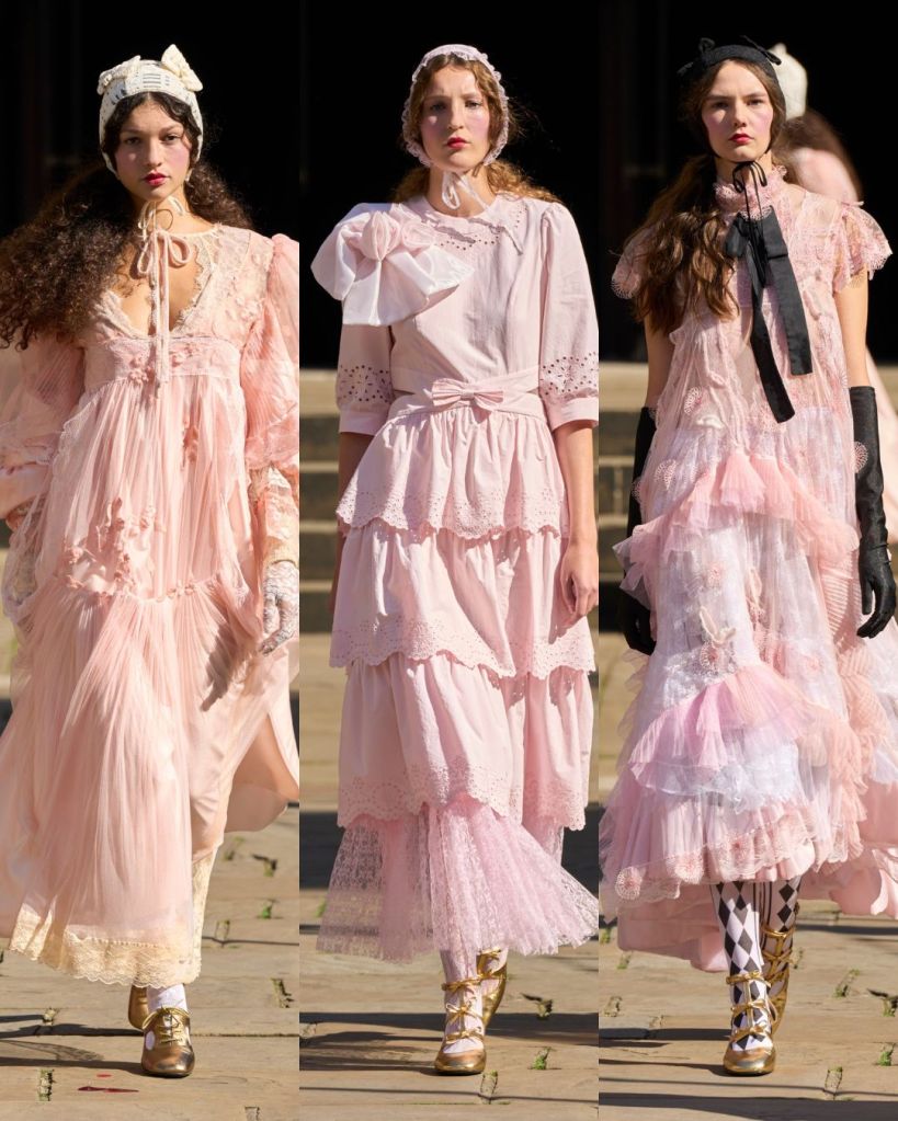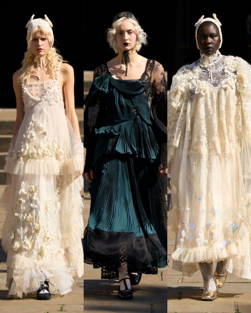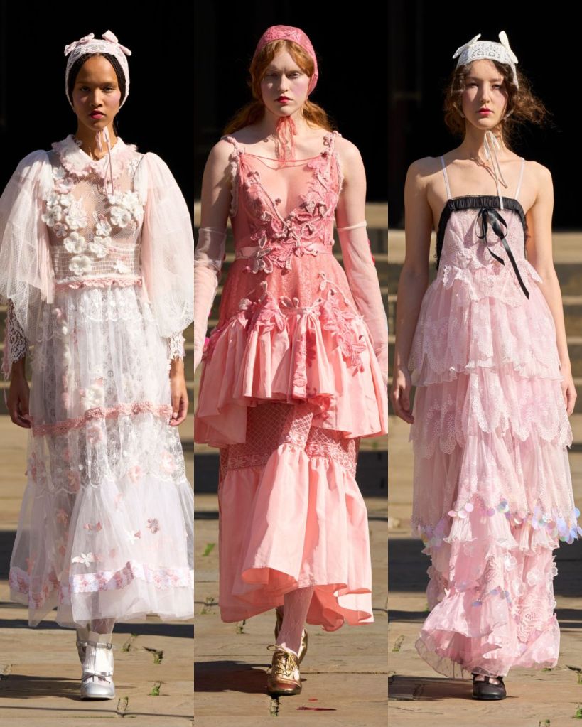 Set in a sunny Covent Garden garden, the atmosphere felt almost like a dream. Models floated in dresses layered with tulle, lace, and crochet, echoing the dolls’ frilled nightgowns and faded frocks. There was an iridescent lace gown, frothy prairie dresses in pale pink, and semi-sheer tulle pieces that revealed layers instead of hiding them. It was as if Aksu was peeling back the surface to show the beauty inside.