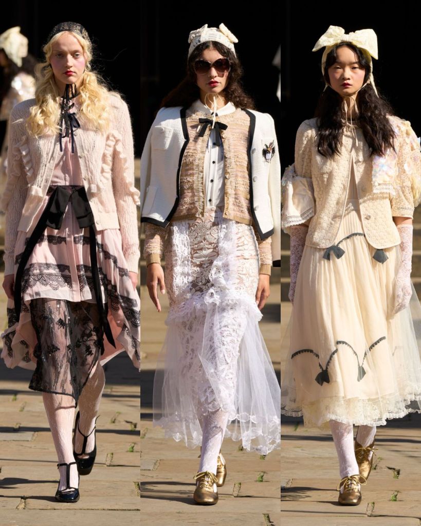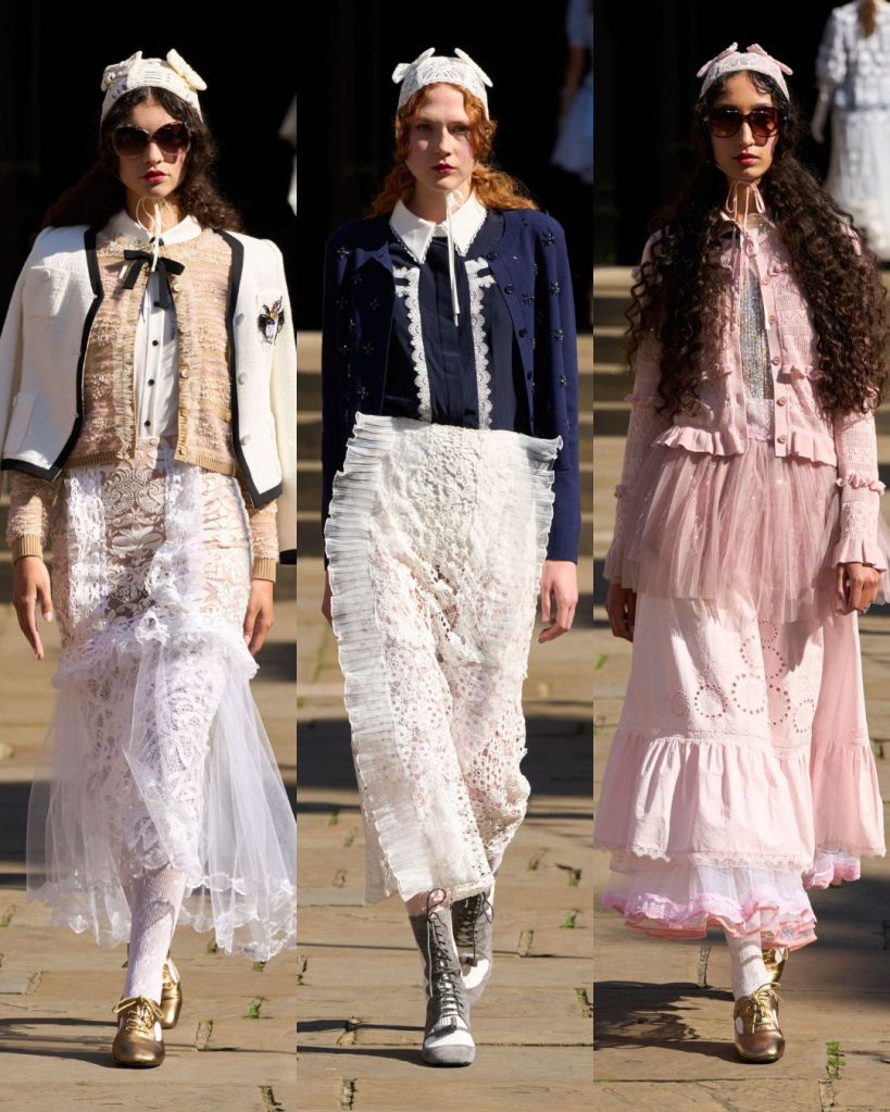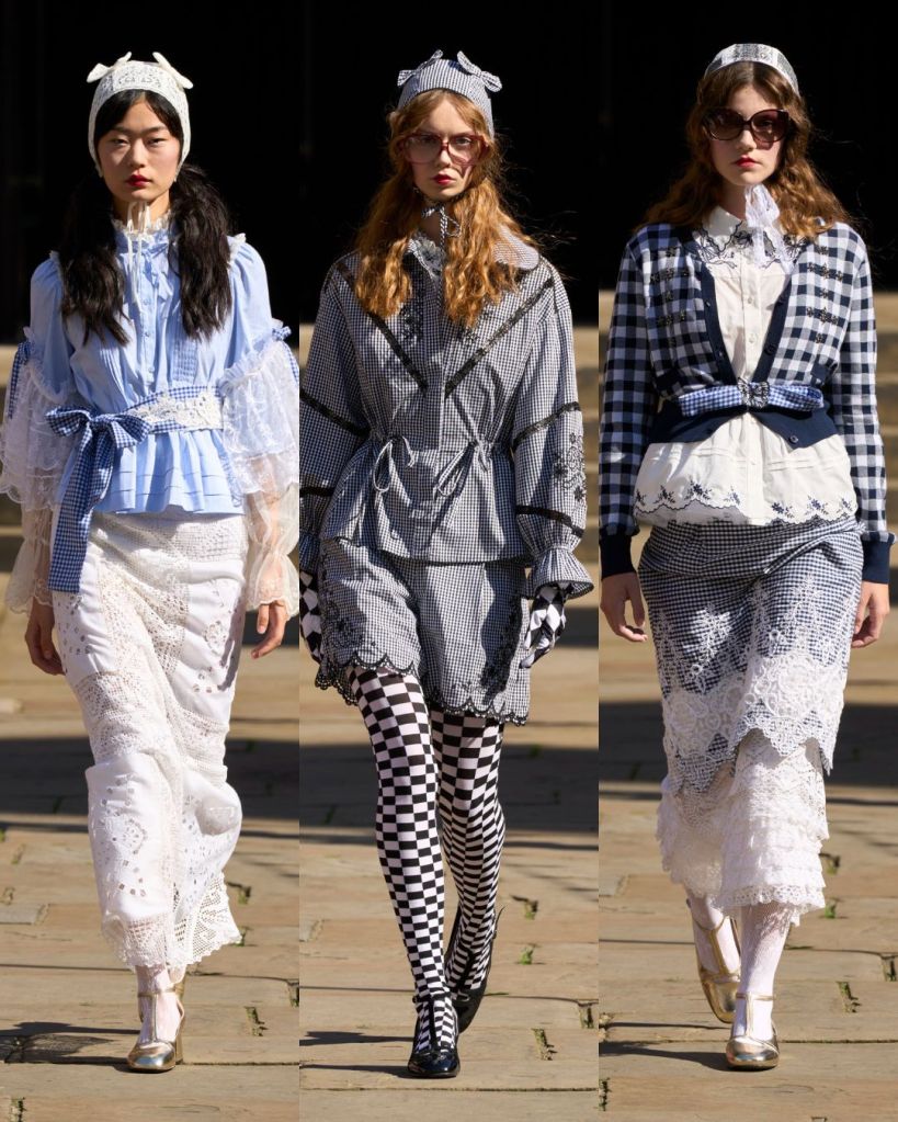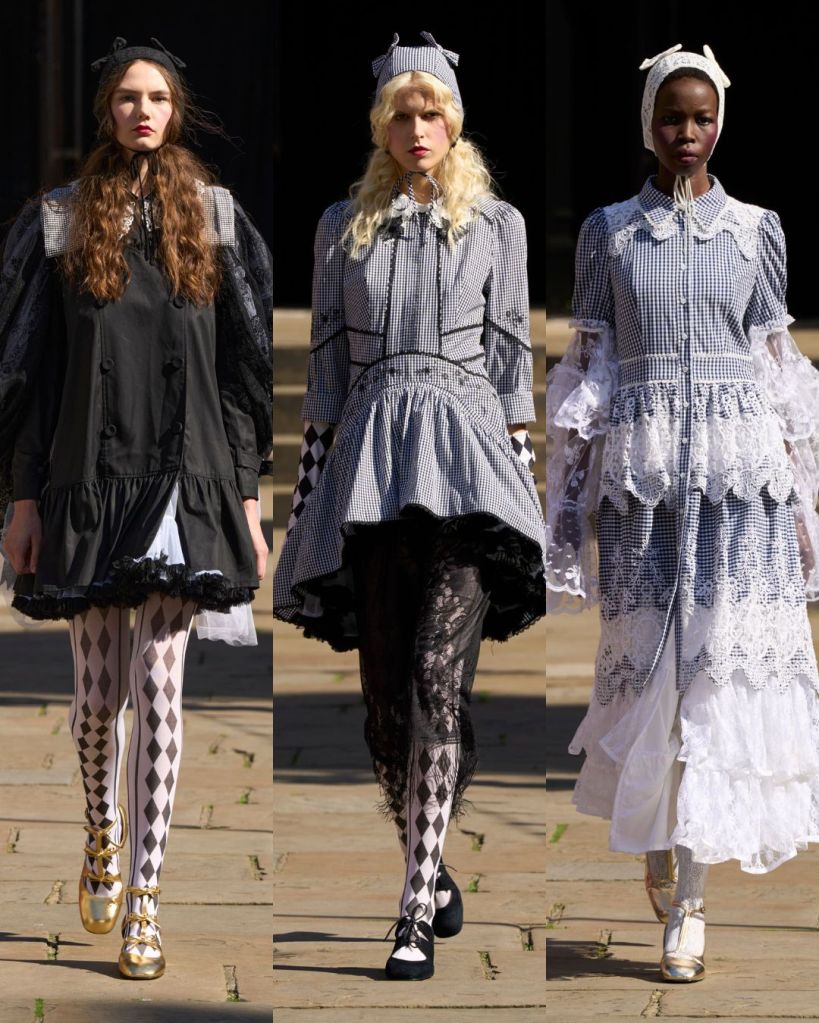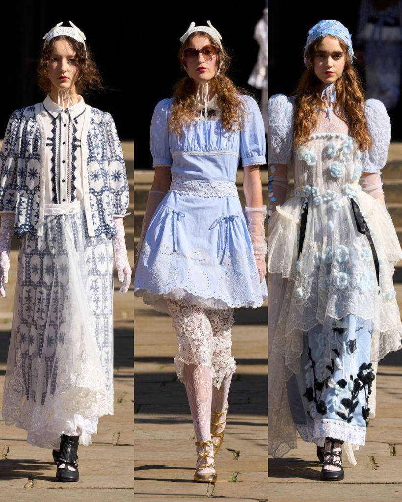 Set in a sunny Covent Garden garden, the atmosphere felt almost like a dream. Models floated in dresses layered with tulle, lace, and crochet, echoing the dolls’ frilled nightgowns and faded frocks. There was an iridescent lace gown, frothy prairie dresses in pale pink, and semi-sheer tulle pieces that revealed layers instead of hiding them. It was as if Aksu was peeling back the surface to show the beauty inside.