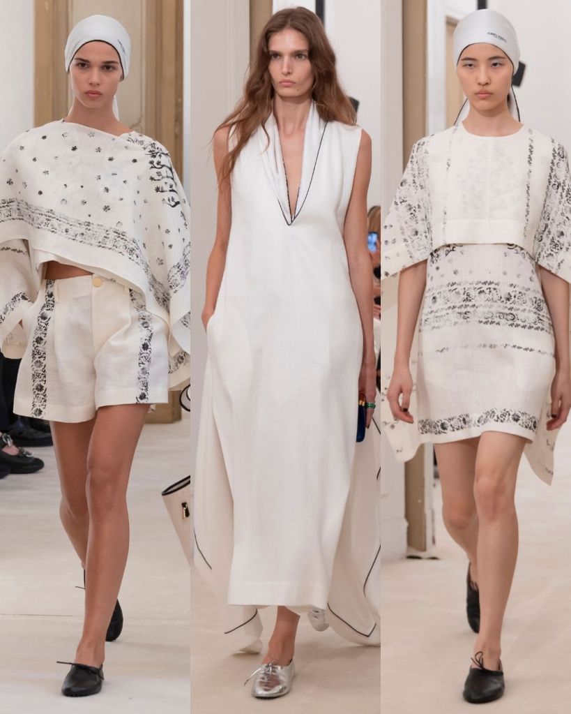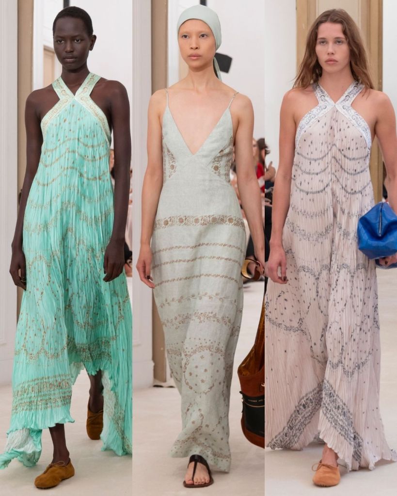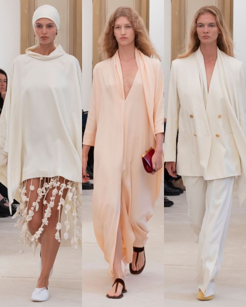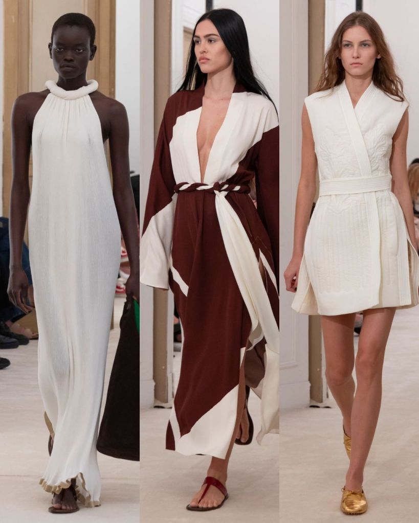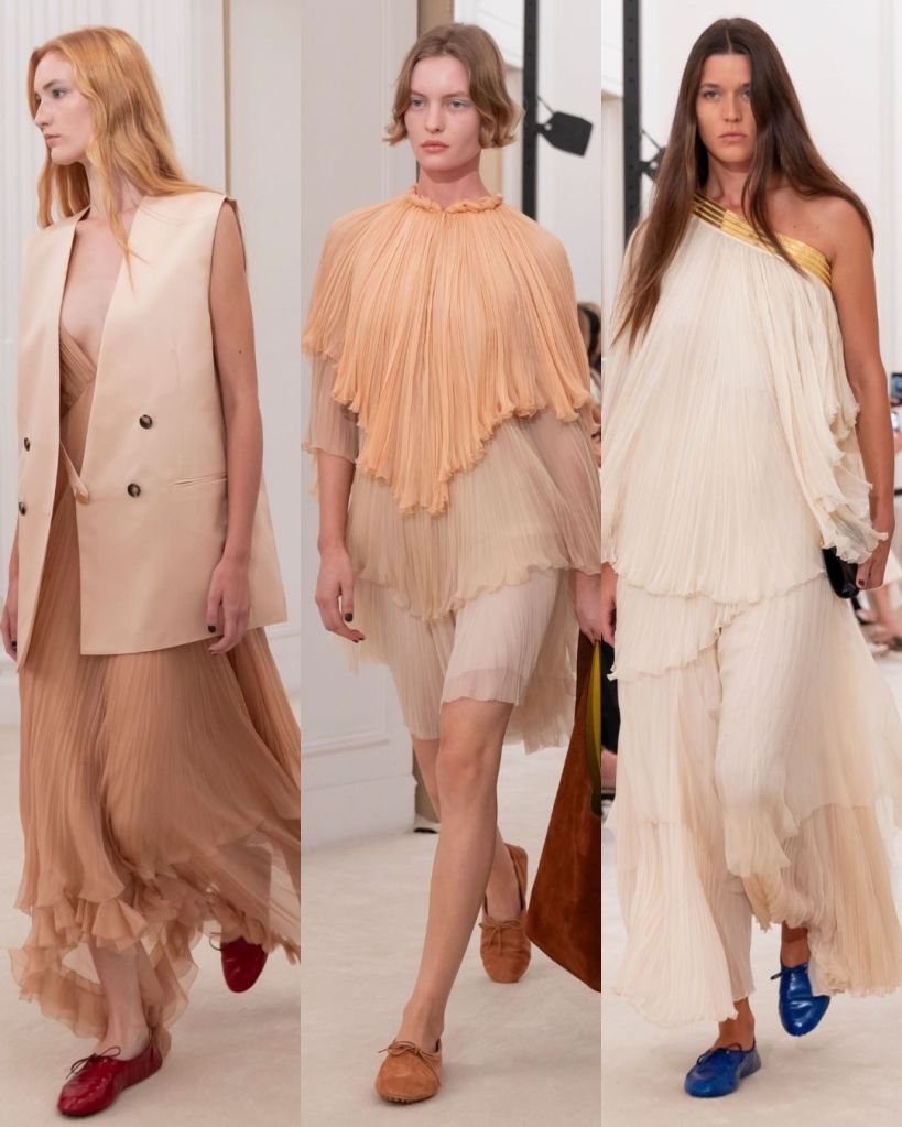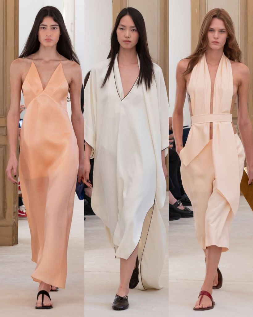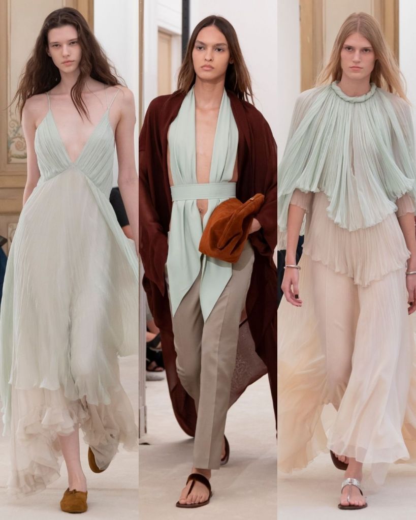 Lorenzo Serafini imagined a wardrobe for a private life, for women who favor discretion over display, intimacy over exhibition. It wasn’t the romantic, emotional Ferretti I usually connect with. The clothes were objectively beautiful—fluid caftans, kimono-inspired dresses, and pajama-like trousers in airy fabrics—but somehow the collection didn’t fully resonate. The cream-carpeted runway, soft hues of blush, mint, and neutrals, and airy silhouettes all evoked a serene domestic elegance. The collection was grounded in ease and comfort, with loose sleeves, handkerchief hems, and Fortuny-style pleating flowing effortlessly. Accessories, like pebble-studded moccasins, suggested a life of casual sophistication, always ready for the next quiet errand or gathering.