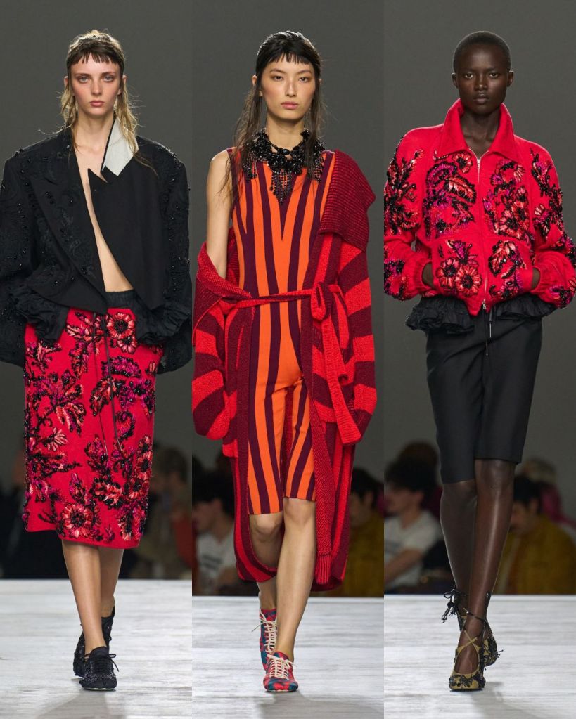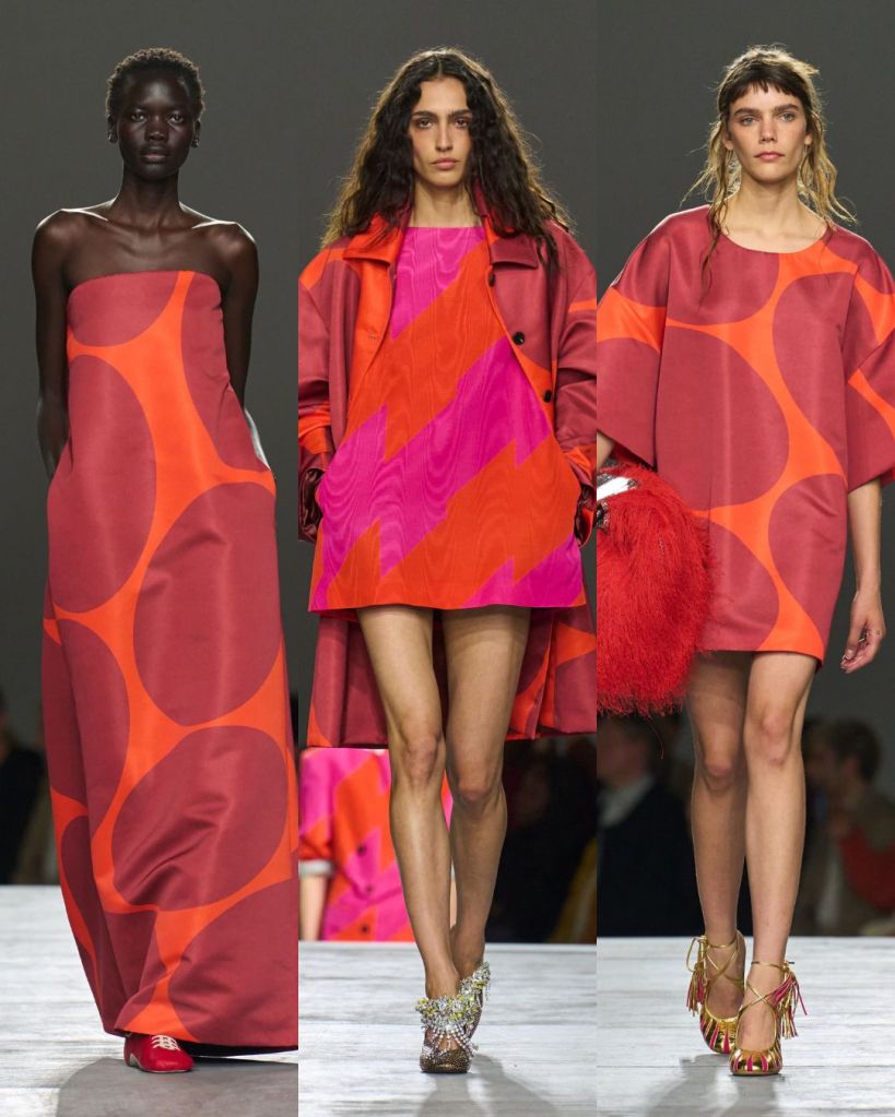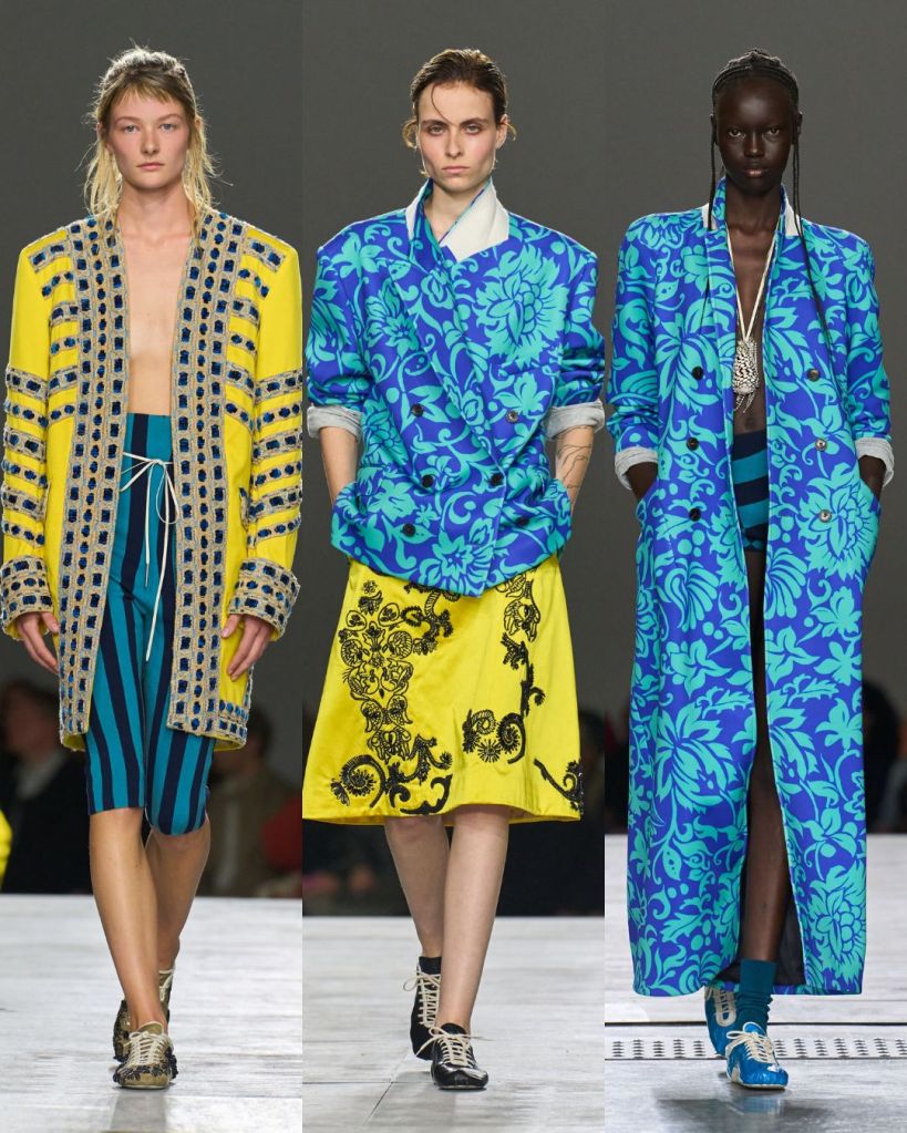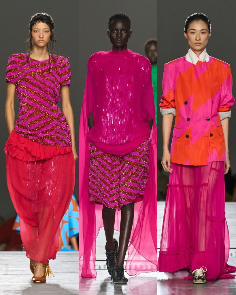 The palette is electric: hot pinks, lime greens, vivid blues, tangerine, and coral dominate, sometimes clashing in ways that somehow just work. Accessories and sneakers echo this playful energy, while jewelry clusters like shells on the beach add small, whimsical touches. Even the tailoring featured in bombers, jacquard jackets, satin cummerbunds, they all carry a sense of relaxed precision.