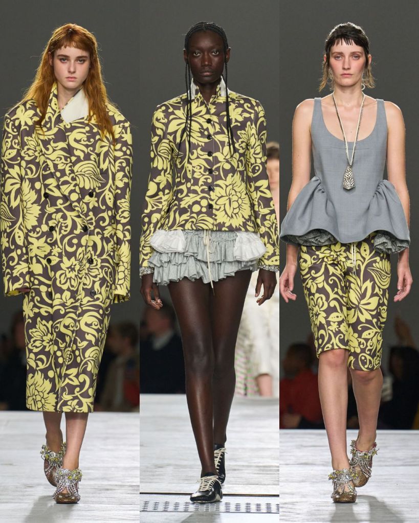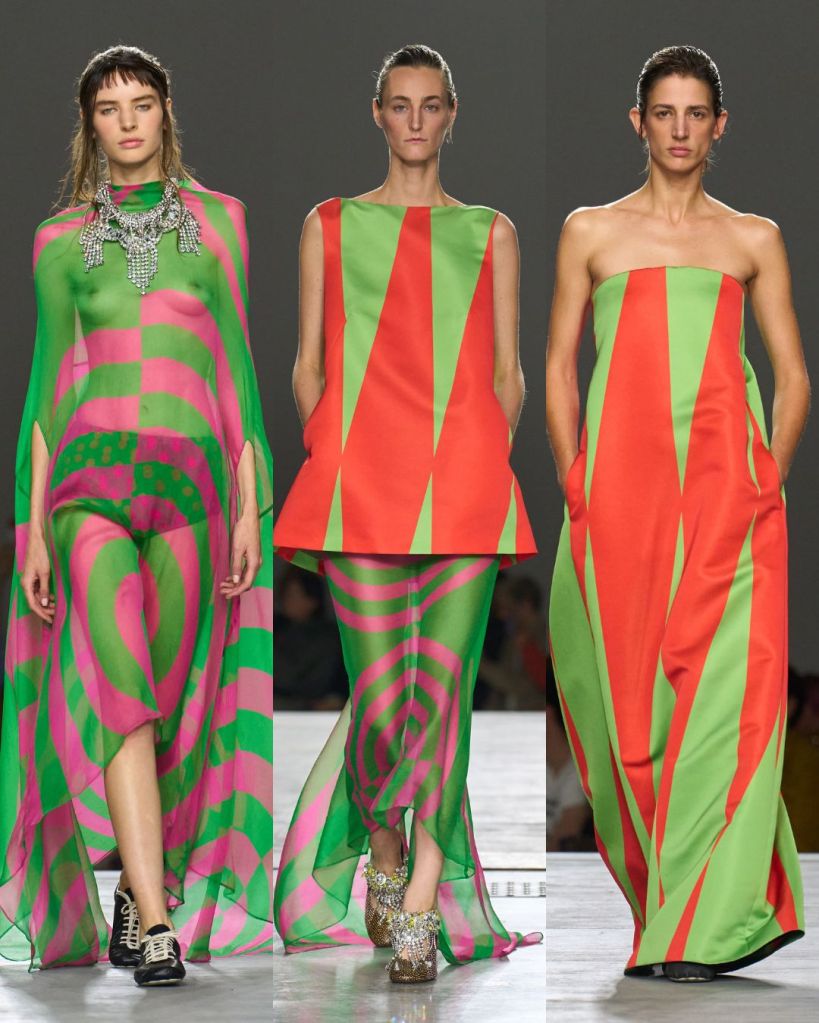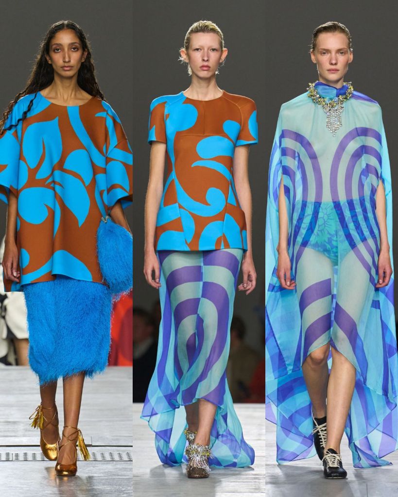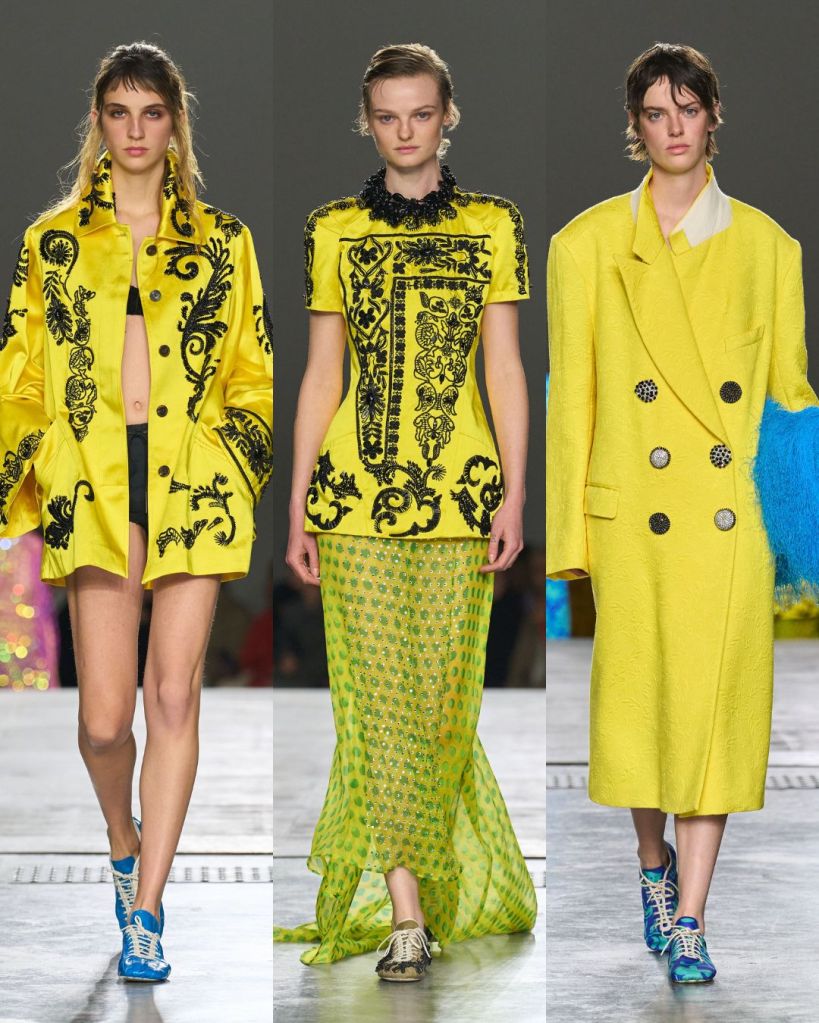 The palette is electric: hot pinks, lime greens, vivid blues, tangerine, and coral dominate, sometimes clashing in ways that somehow just work. Accessories and sneakers echo this playful energy, while jewelry clusters like shells on the beach add small, whimsical touches. Even the tailoring featured in bombers, jacquard jackets, satin cummerbunds, they all carry a sense of relaxed precision.