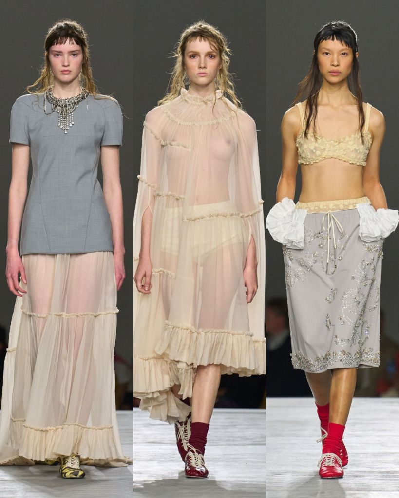 The collection was inspired by the elegance of surfers and the simple majesty of waves. Klausner translated that into clothes that balance structure and fluidity: narrow Bermudas paired with raglan-shouldered tops, tailored jackets with diaphanous skirts, and lace or beaded skirts layered over casual basics. He plays with contrasts everywhere — stiff versus soft, historical references versus modern cuts, restrained shapes against bold graphic prints. The result feels rarely fresh.