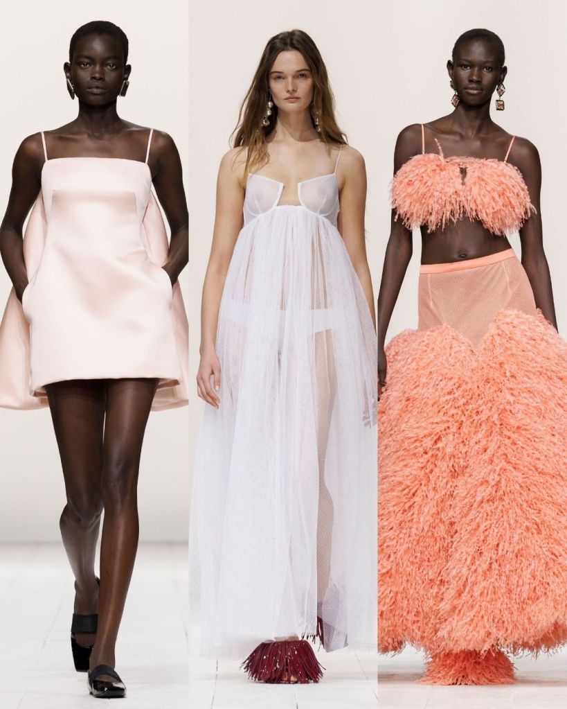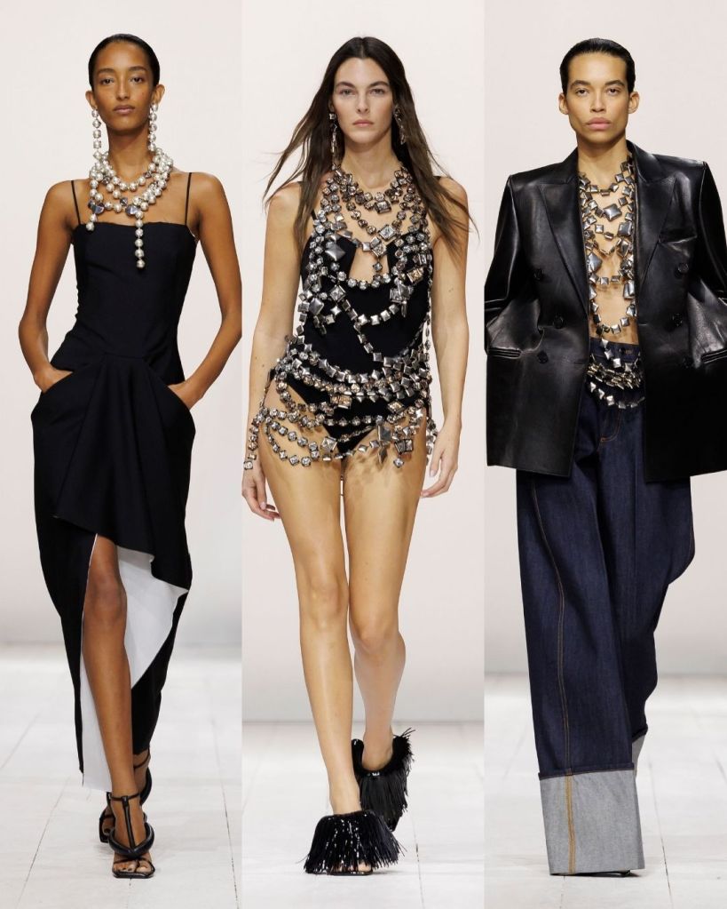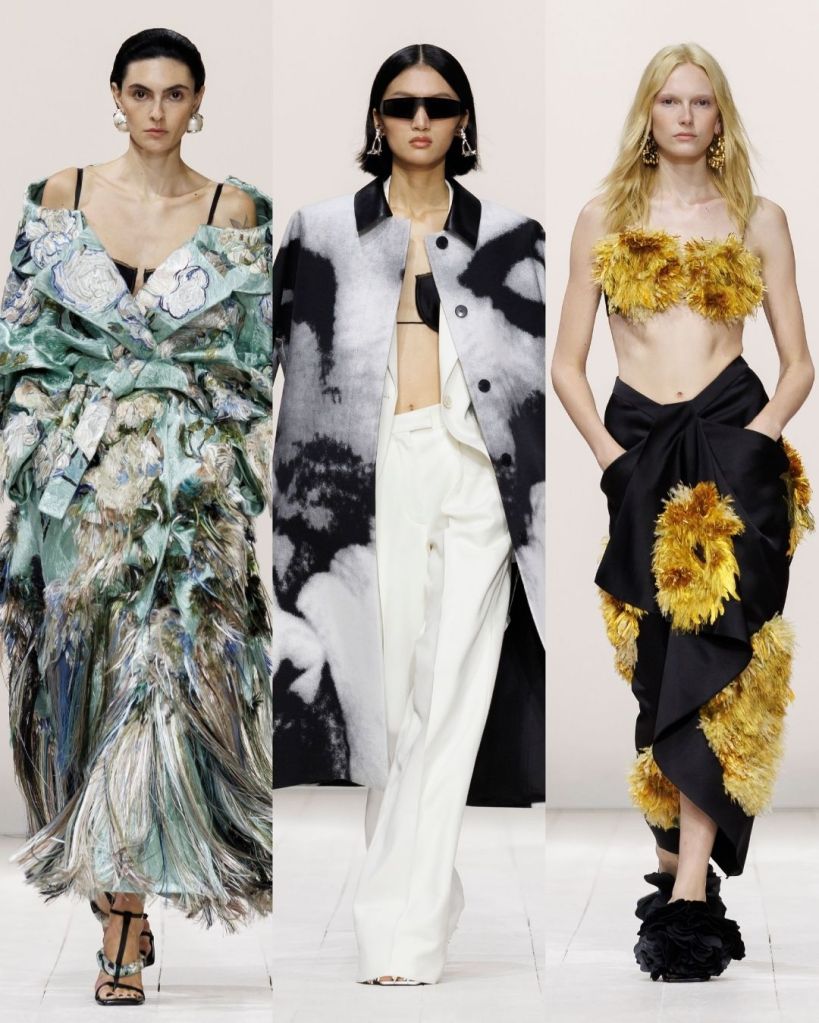 Burton’s skill at cutting and construction is unmatched. Jackets slide off shoulders with ease, collars dip to reveal necklaces, and bodysuits, sheer mesh dresses, and mini skirts suggest a quiet sexual pulse without ever shouting. Volume is exaggerated yet softened; leather, duchesse satin, and delicate chiffon work together to elongate the body and highlight femininity. Embellishments are meticulous with beads, feathers (or shredded chiffon imitating them), and embroidery create movement and dimension, while retaining control.