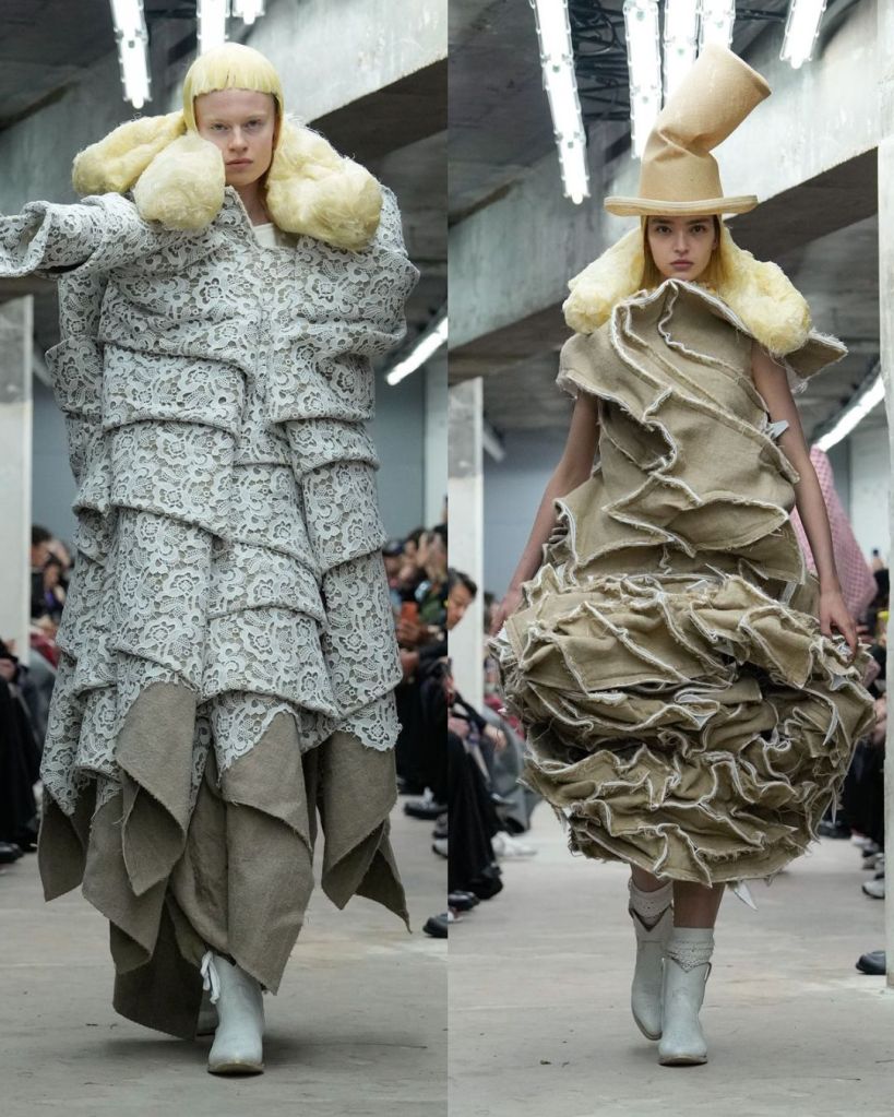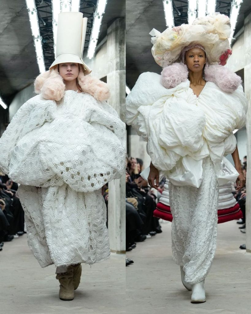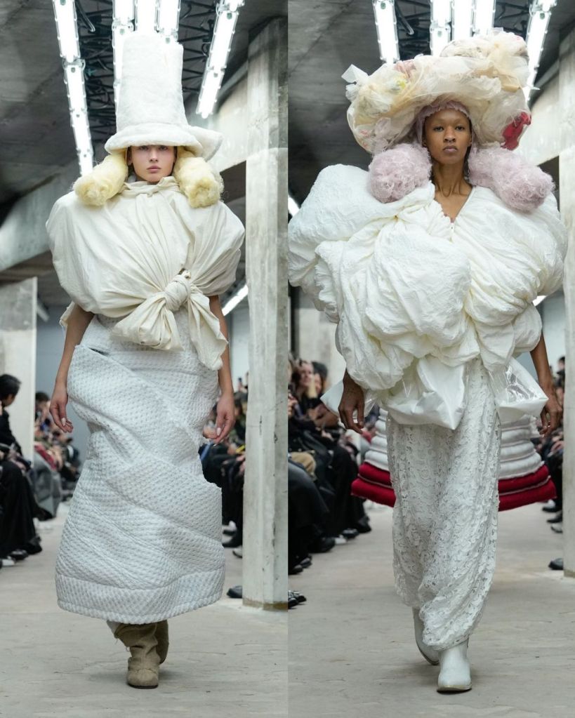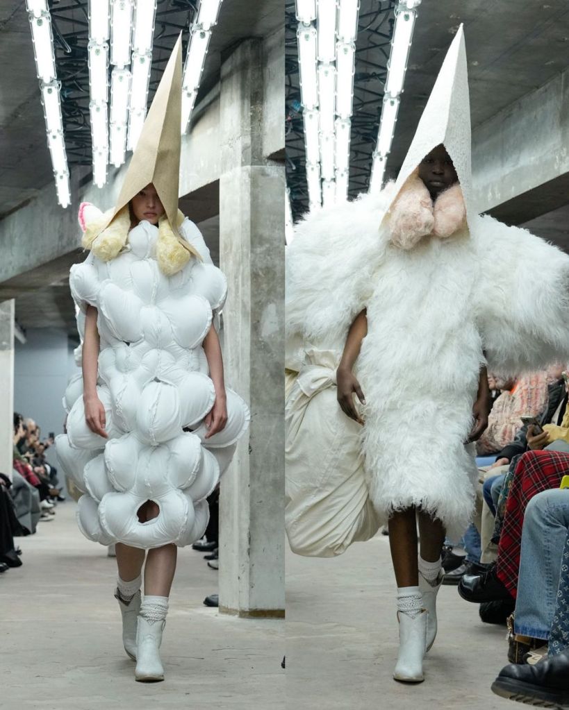 There was something almost emotional about watching those strange, bulbous shapes move, like they carried stories of survival and renewal. The humor of oversized hats brushing the ceiling only added to the humanity of it all. This collection wasn’t about clothes in the ordinary sense. It was about transformation, about turning what’s been broken or discarded into something poetic.