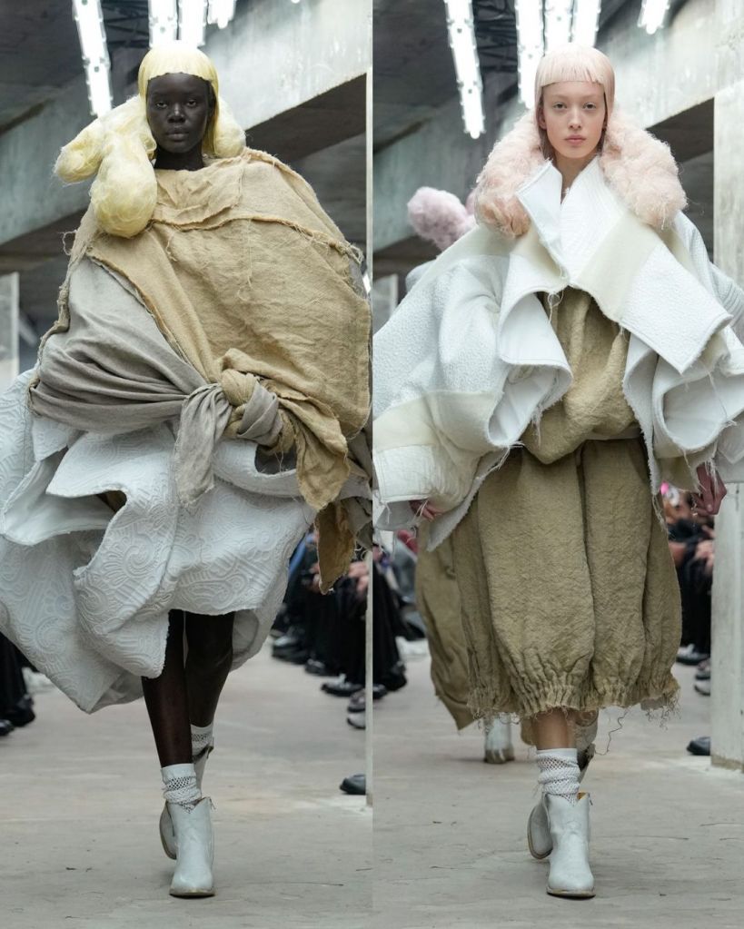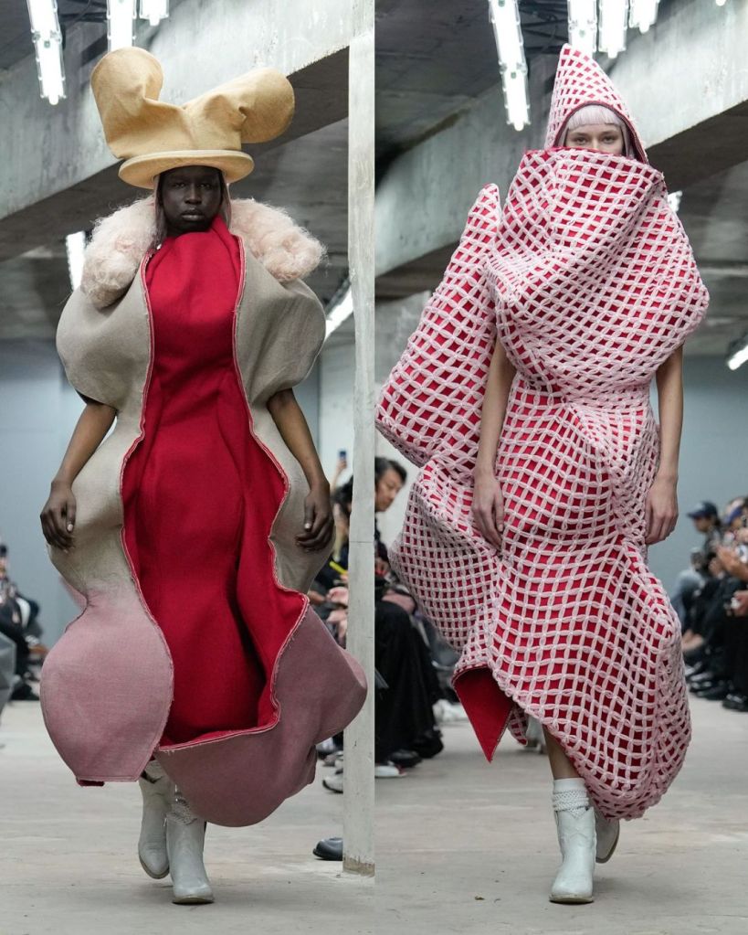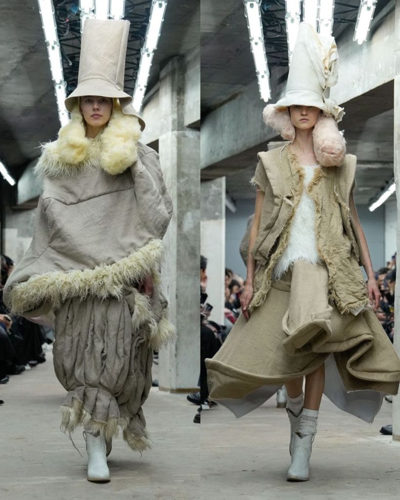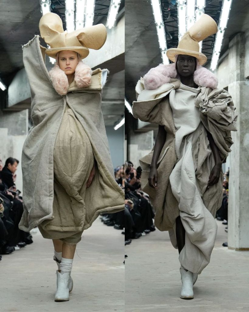 There was something almost emotional about watching those strange, bulbous shapes move, like they carried stories of survival and renewal. The humor of oversized hats brushing the ceiling only added to the humanity of it all. This collection wasn’t about clothes in the ordinary sense. It was about transformation, about turning what’s been broken or discarded into something poetic.