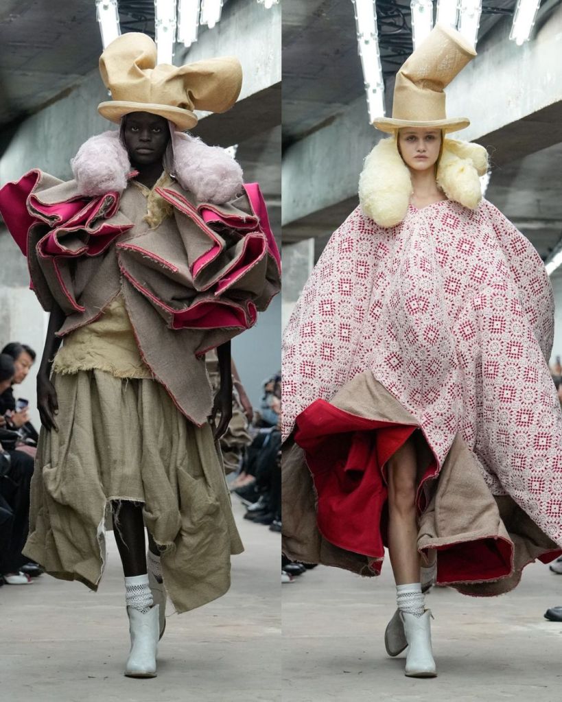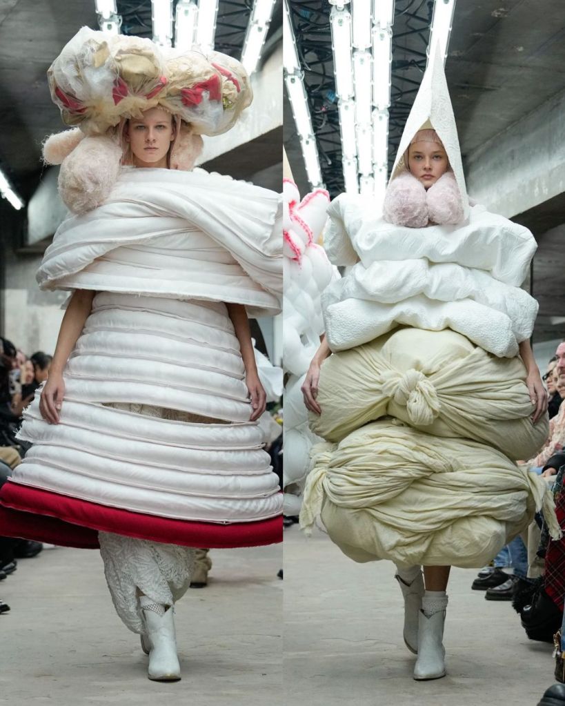 Kawakubo’s show opened with cotton shells and scarlet satin interiors that looked almost alive, like cocooned forms breaking open. Every piece felt like a question about what “perfect” even means. Layers of burlap, jute, lace, and calico were bundled and reshaped into abstract silhouettes. Some looked like sculptures, others like fragments of memory stitched together. Her note, “I believe in the positiveness and the value that can be born from the damaging of perfect things,” set the tone completely.