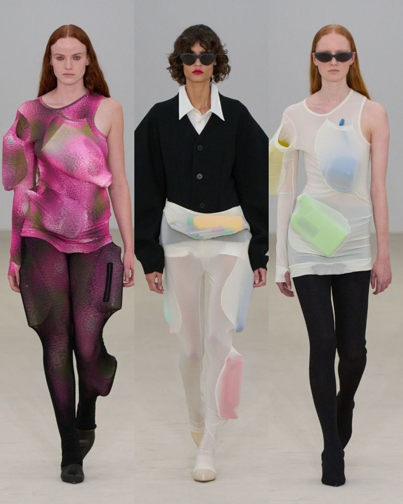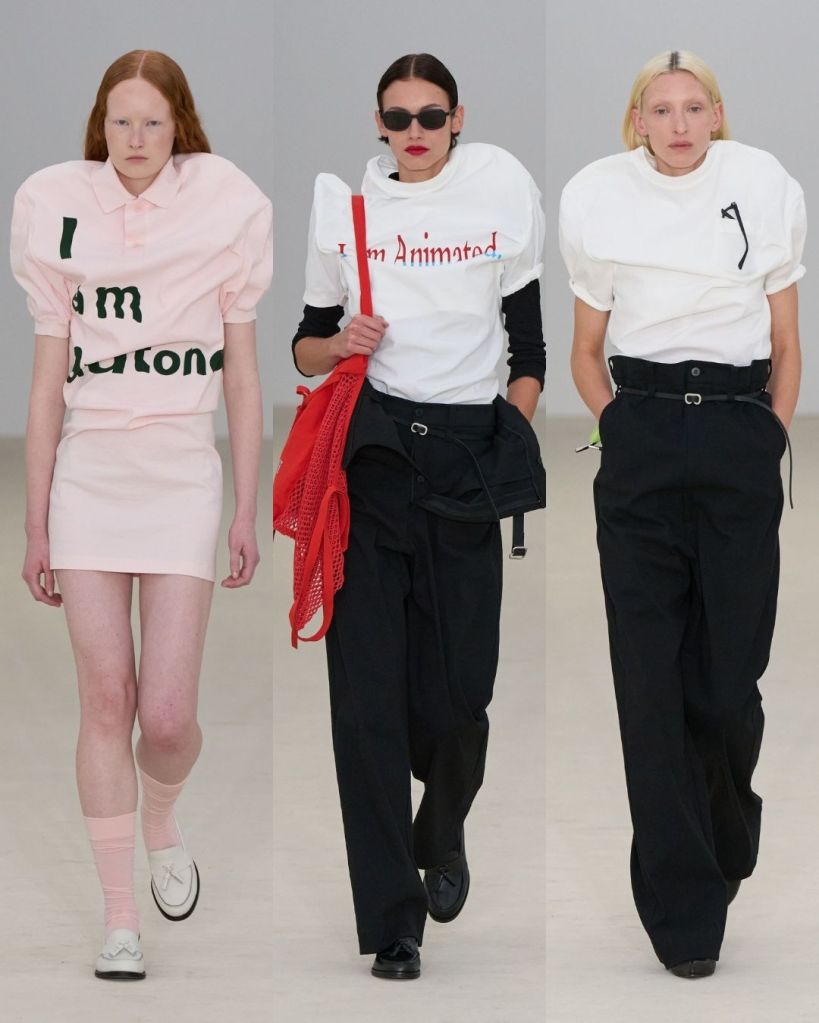 The show opened with what looked like familiar basics with T-shirts, polos, hoodies but even they seemed to have minds of their own. Shoulders pushed upward, seams shifted out of place, and trousers sprouted extra arms and leg holes. The garments looked like they were trying to separate from their wearers, as if deciding for themselves how they wanted to exist.