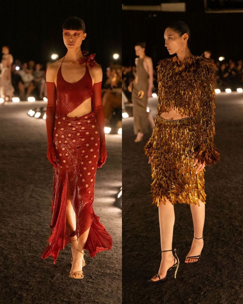 Titled Dancer in the Dark, the collection captured Roseberry’s fascination with inspiration over entertainment. He wanted this show to feel like a visit to a museum, a moment of stillness in a world that moves too fast. The result was strikingly beautiful and emotionally charged. Clean lines, sculptural tailoring, and surreal details made every look feel alive. There was a skirt suit made entirely of 6,000 paintbrushes and glowing “salt lamp” jewels that seemed to pulse with their own light.