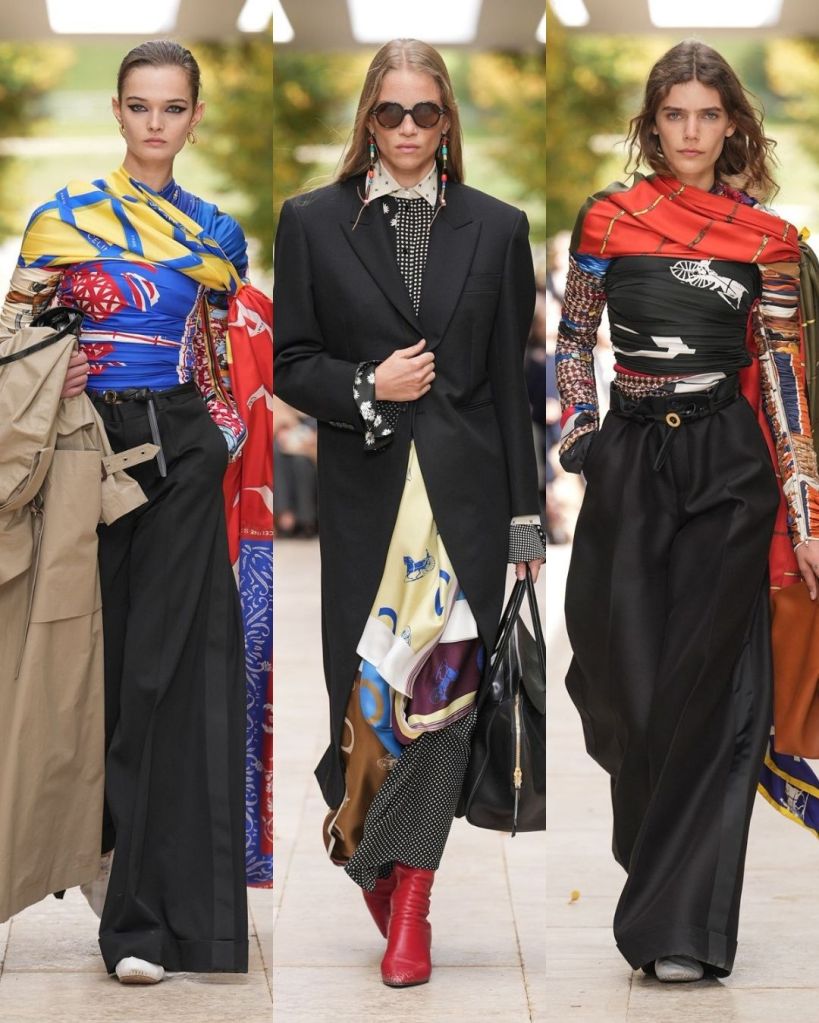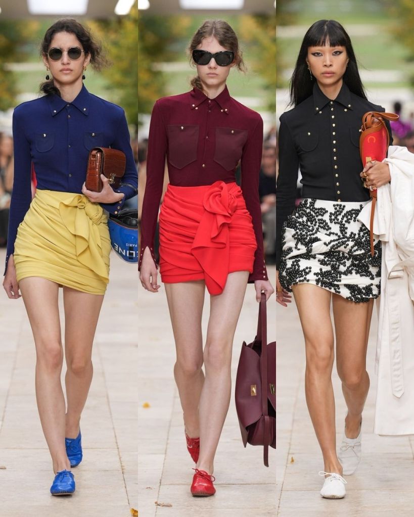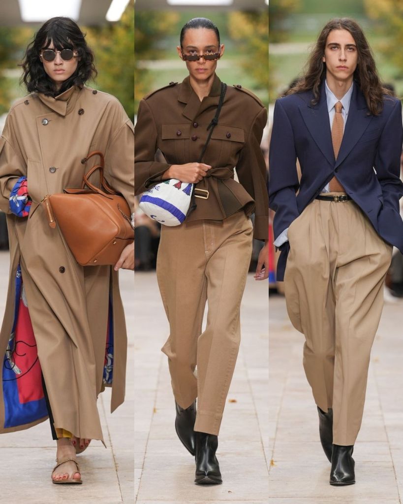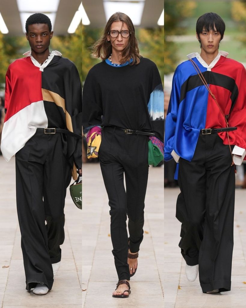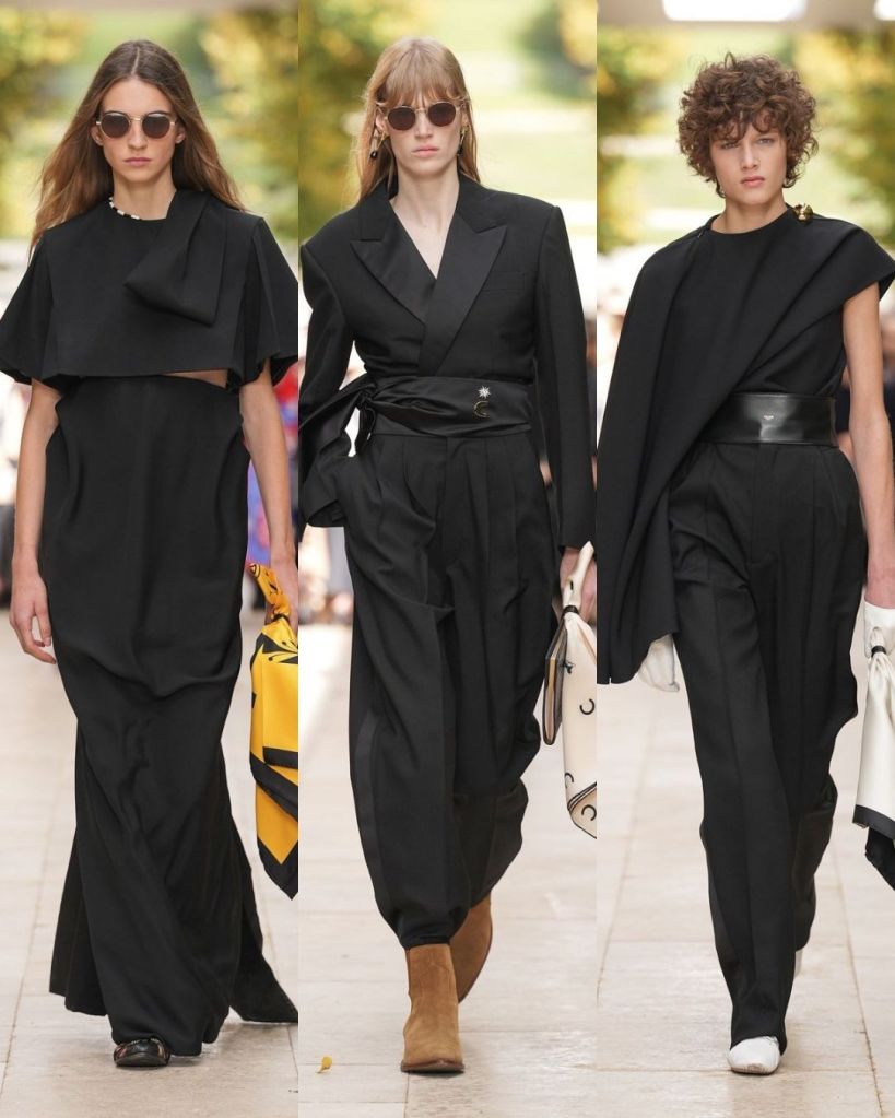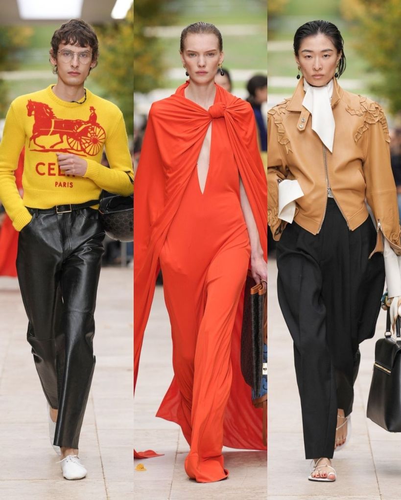 Silk scarves were reimagined as ties, rugby-style shirts, shoulder bags, and belts, turning a conservative accessory into a versatile statement piece. Accessories like Celine bicycle helmets underscored the collection’s thoughtful nod to contemporary Parisian life: fashion as lived, active, and current. It was a wardrobe designed to move through life—on a bike, in the park, at a rooftop dinner; all exuding cool without ever trying too hard.