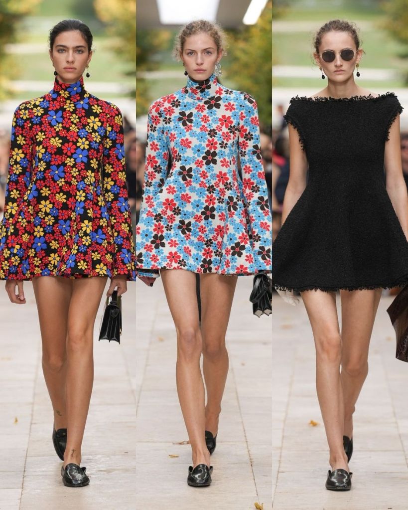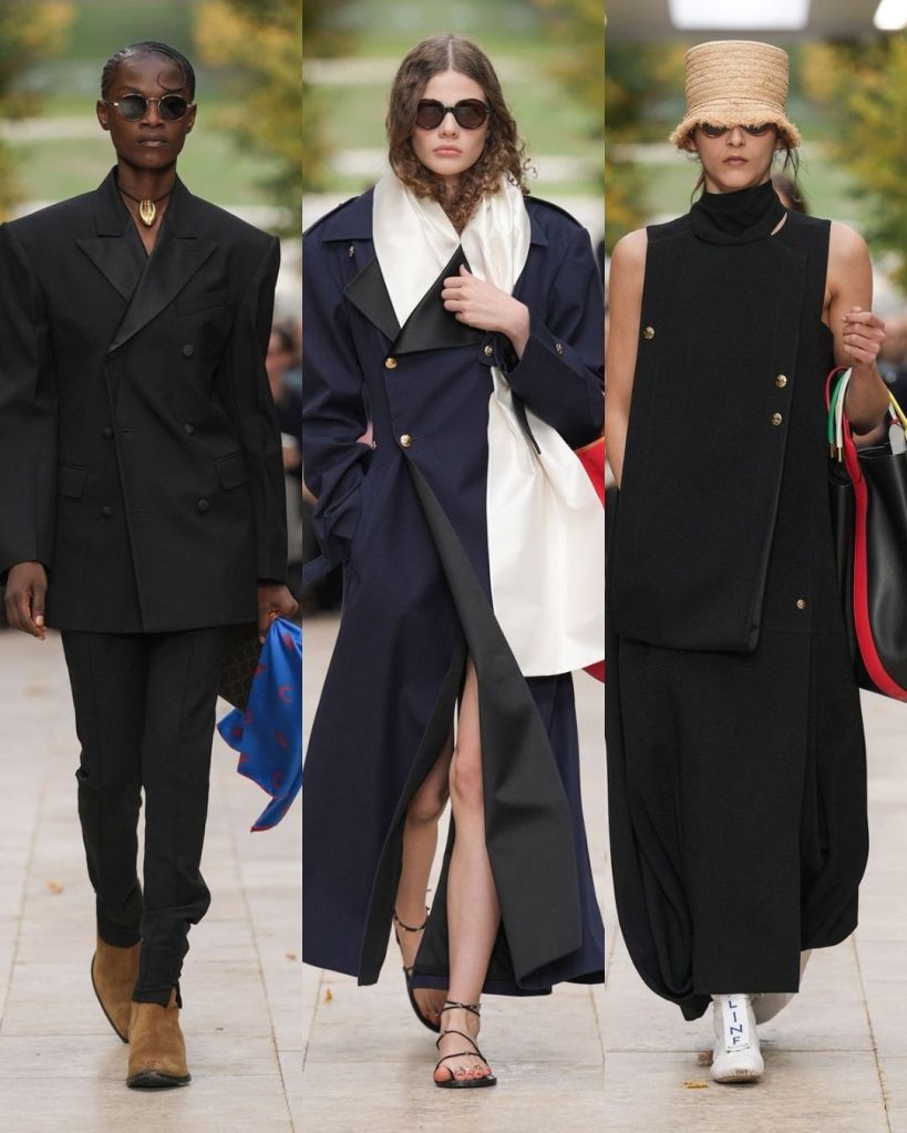 Rider’s tailoring was the highlight. Blazers, double-breasted coats, and equestrian-inspired trousers were rendered in multiple cuts, from skinnies and peg-top chinos to relaxed wide legs. Mini A-line dresses in pop-art florals, sequined bubble silhouettes, and draped evening tops added contrast, while layering, subtle draping, and fluid lines brought a sense of movement and modern ease. Navy, black, and cream dominated, punctuated by primary-colored pops that kept the palette lively without straying from the refined tone.