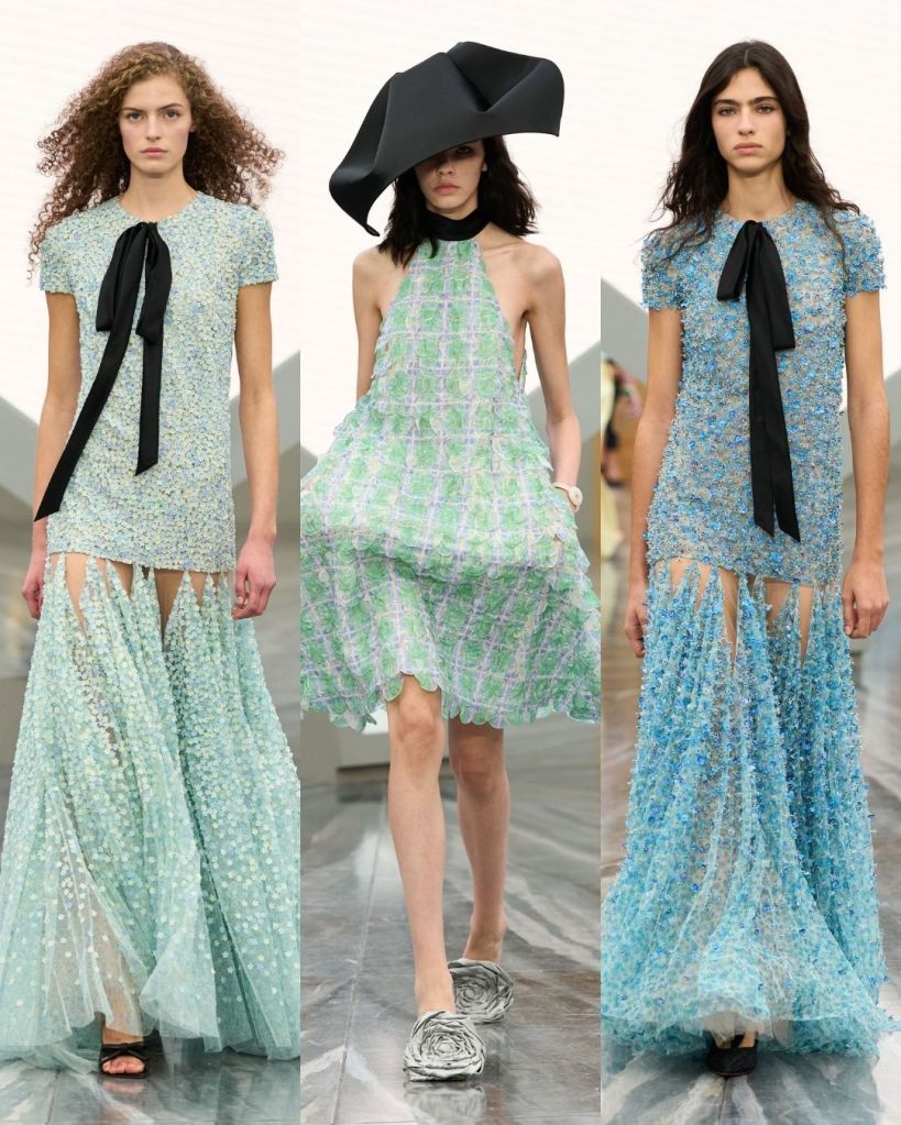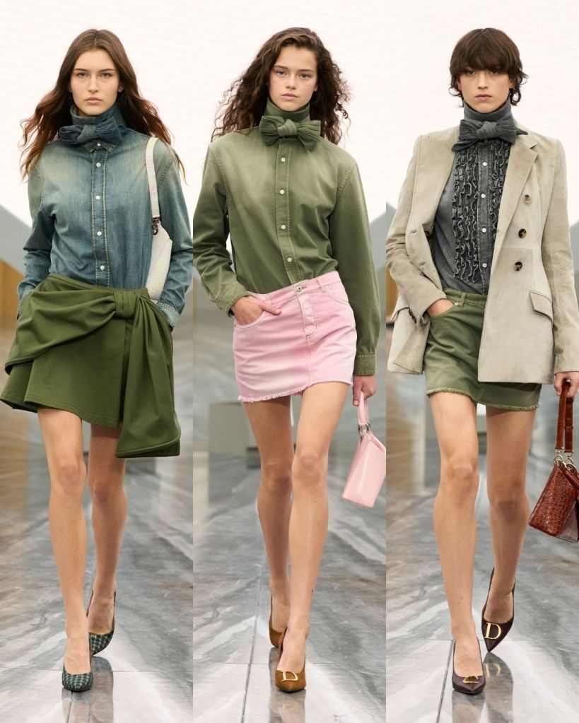 The collection itself reflected this push-and-pull. Iconic silhouettes, from the New Look’s cinched-waist bell shapes to the Bar jacket, were reimagined in unexpected ways: oversize bows, looping ribbon ties, shrunken proportions, and trompe l’oeil pleating created a sense of whimsy and modernity. At the same time, Anderson layered references—from Galliano’s playful pirate flourishes to Chiuri’s softer romanticism—without allowing any single idea to dominate. Denim miniskirts paired with tricorne hats, lace dresses fanning into butterfly-like wings, and sculptural capes blended the fantastical with wearable fashion, even if the abundance of concepts occasionally felt overstuffed.