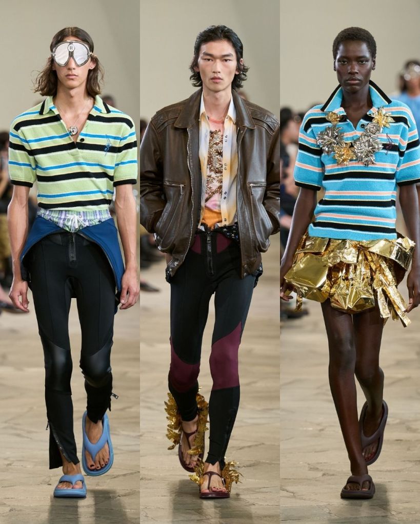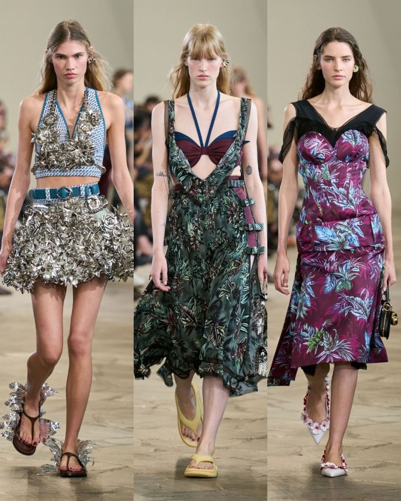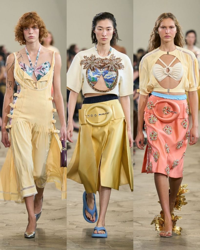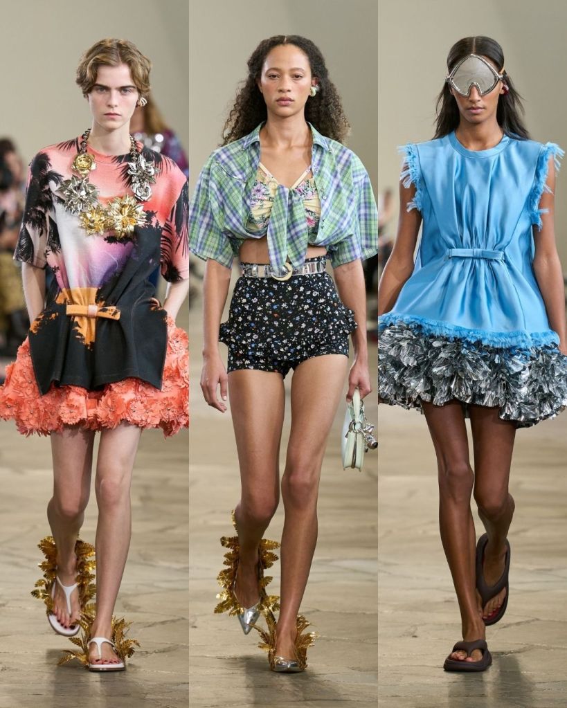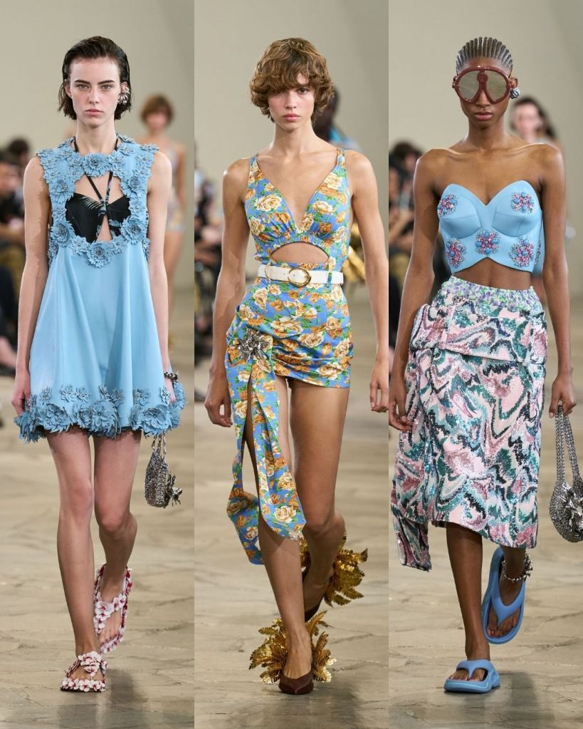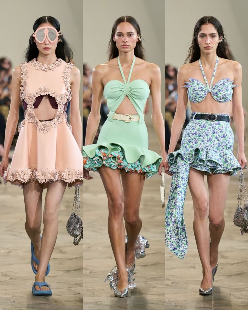 The strongest pieces were simple and inventive. Flippy skirts, halter tops that nodded to 1950s swimwear, and those scuba sunglasses were all charming and very well thought out. Textures and craft were highlights. Metal underskirts and crystal embroidery gave certain looks a couture edge, while the rubber flowers and palm fringes on shoes added a delightful, tactile detail. Styling felt confident and slightly over the top in the best way. Even when some looks piled on too many elements, it read as exuberant rather than messy.