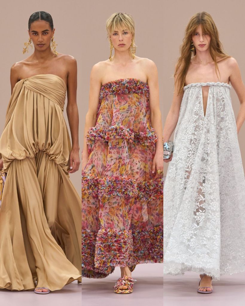 Zimmermann’s florals leaned into the psychedelic this time, warping across crinoline skirts and parachute dresses in tie-dye silks and tulle. Each look shimmered with movement, like watercolor brought to life. The craftsmanship was undeniable, from braided lace detailing to layered ruffles cut on the bias for volume.
