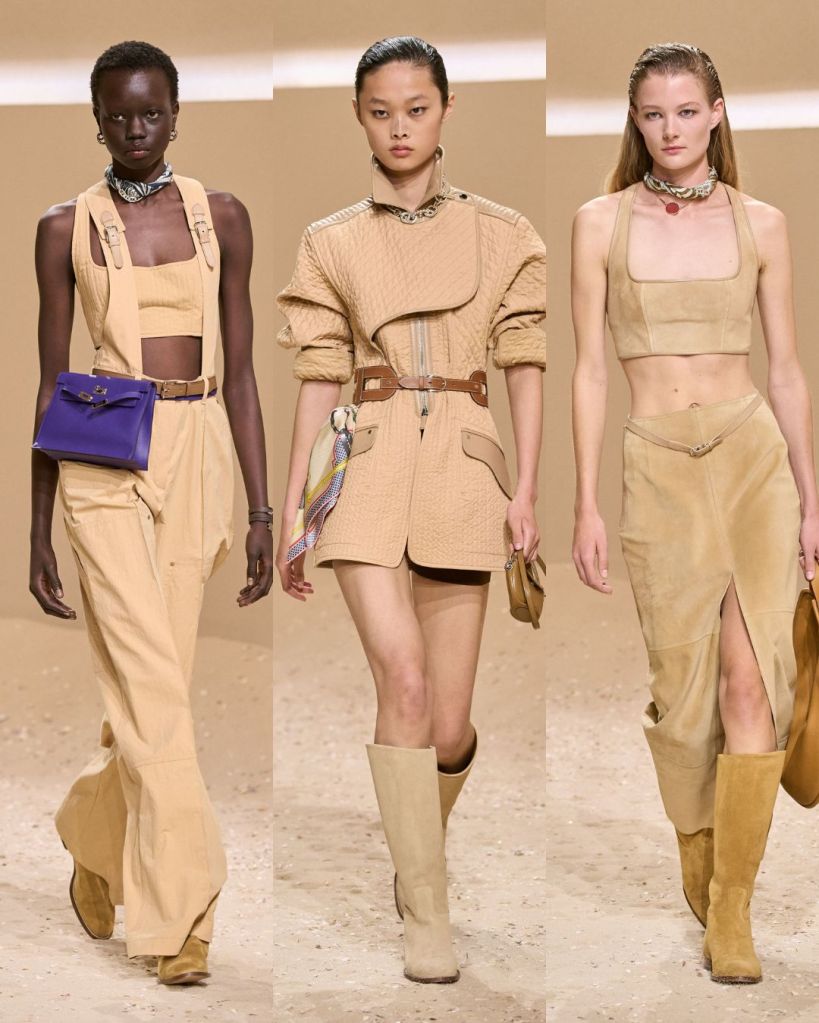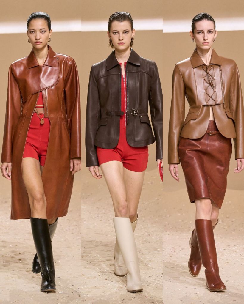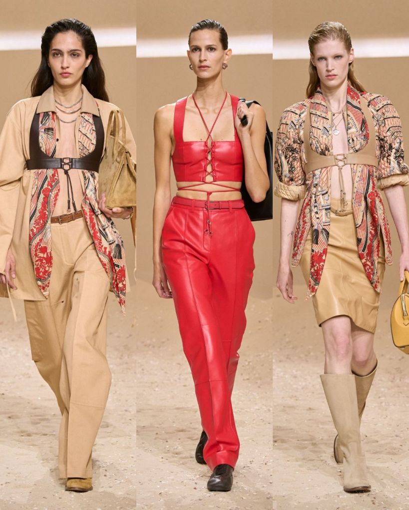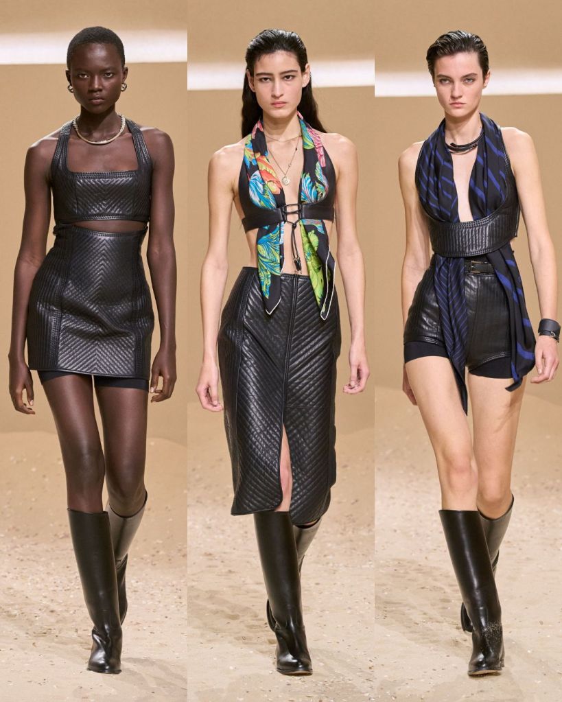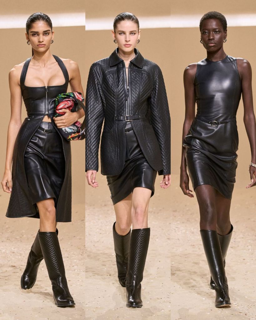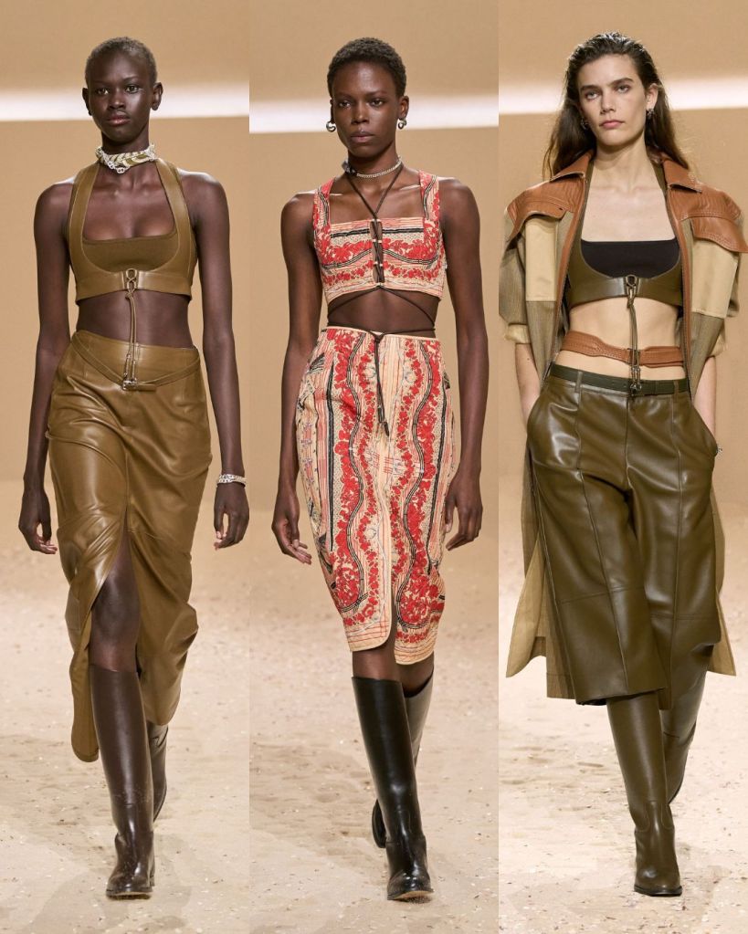 Leather was the hero material, but not in a heavy way. It was cut close to the body, often quilted or draped, showing that structure and softness can coexist. Harnesses layered over bandeaus and button-downs added a touch of sensual rebellion, while silk scarves tied as chokers brought in that cool ‘90s edge. The palette—muted browns, olive, sand, and red—gave everything warmth and depth. Vanhee’s world is one of confidence. Her Hermès woman doesn’t try too hard; she just is.