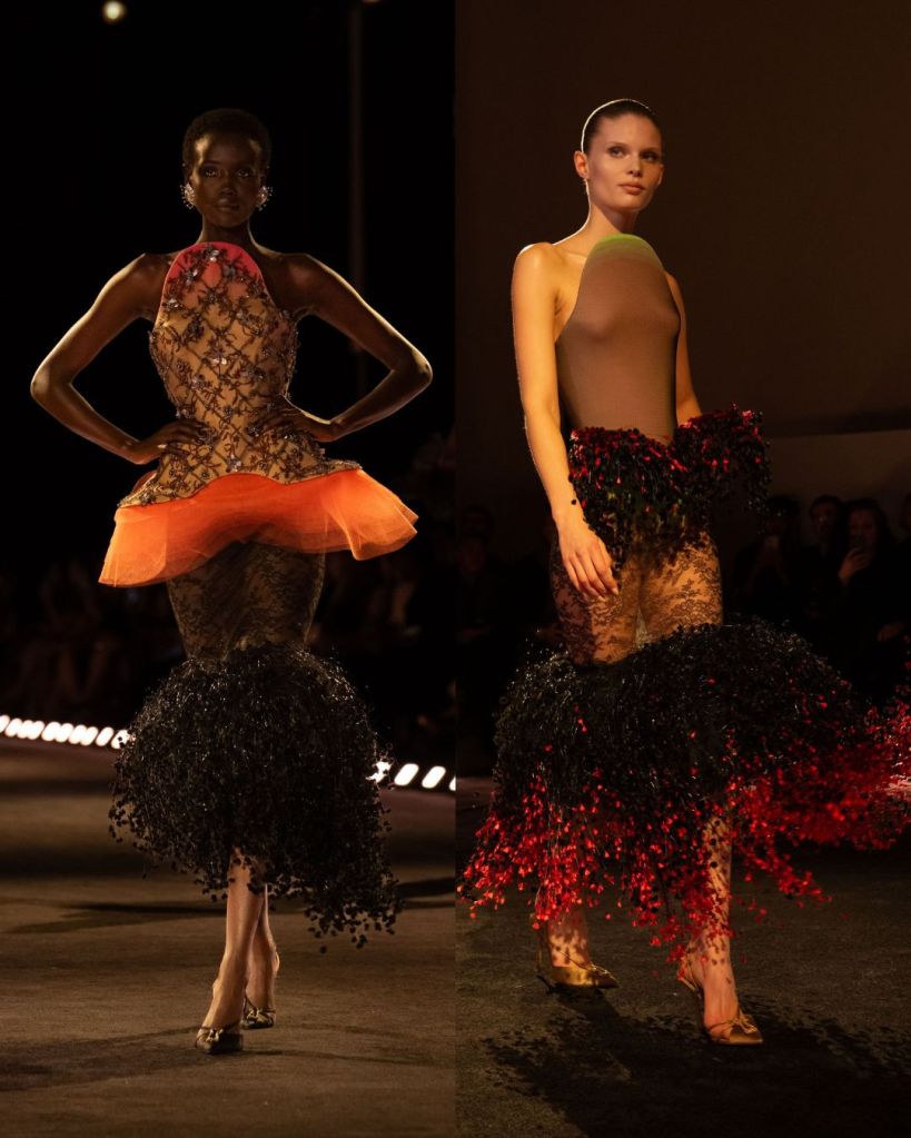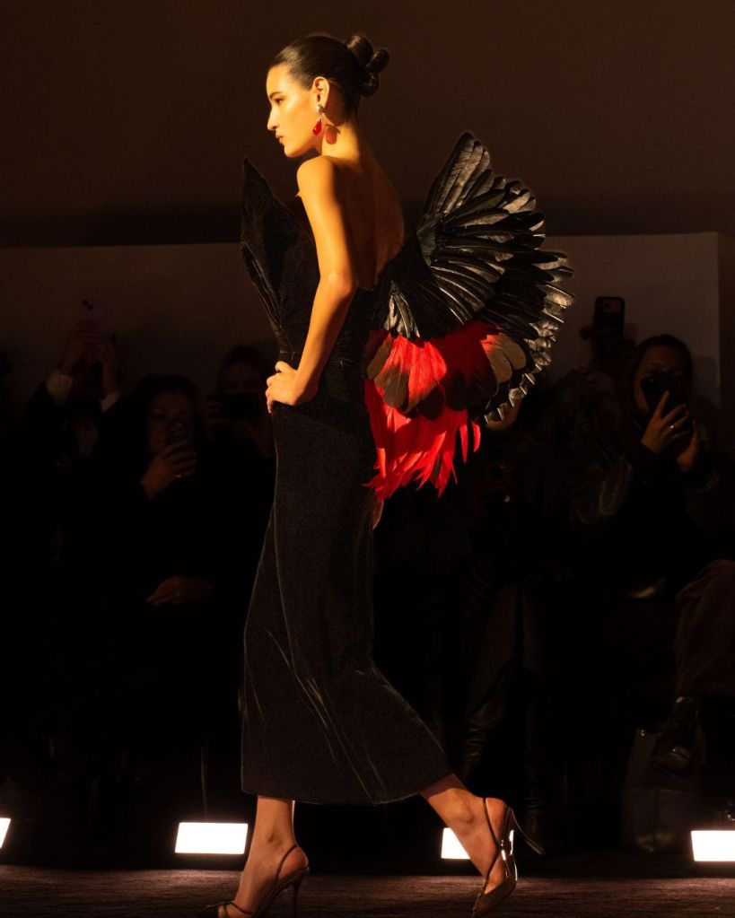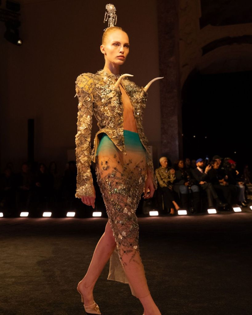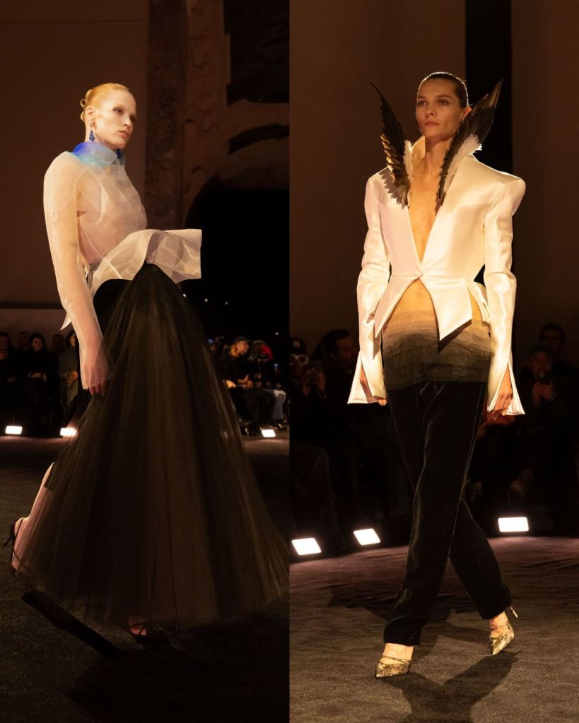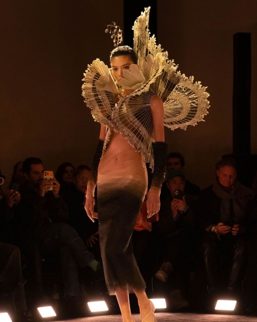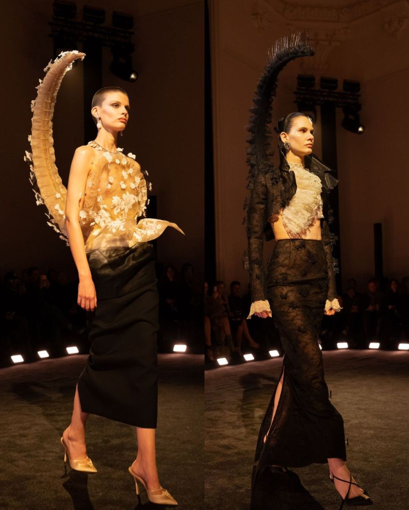 The Sistine Chapel reference is not a lazy art name drop. You can feel the shift from control to release in the clothes themselves. The silhouettes start with discipline and then explode. Scorpion tails curl out of lace jackets. Blowfish spikes harden soft tulle. Wings erupt from backs like instinct taking over logic. It is not decorative. It is emotional. Couture built from feeling first.