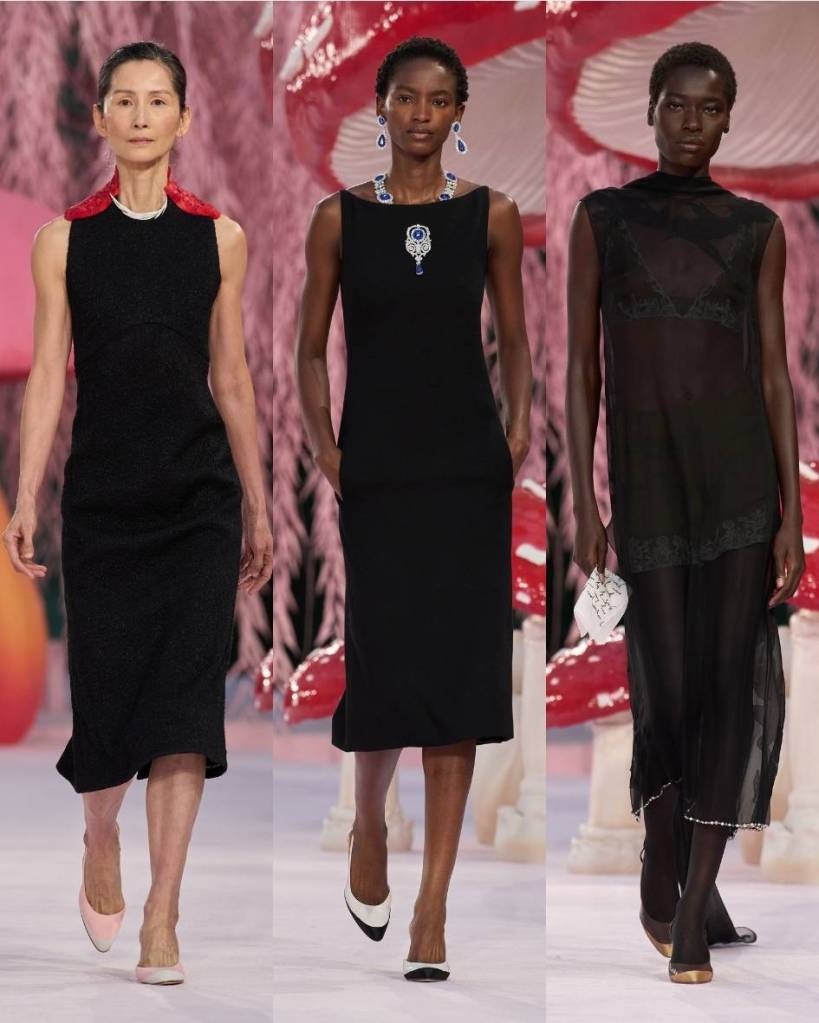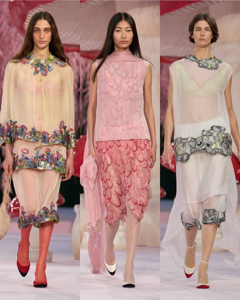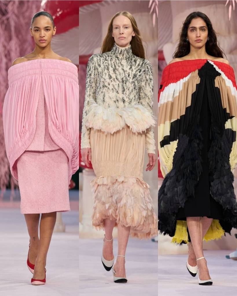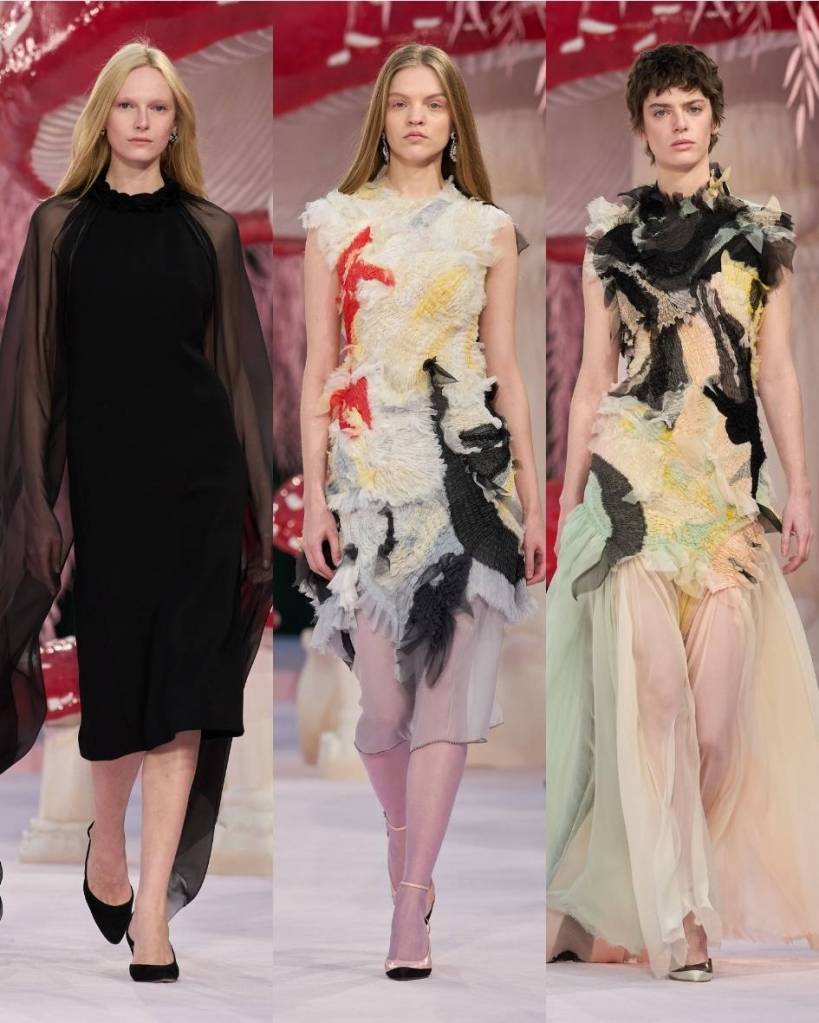 Birds became the quiet metaphor throughout. Freedom, movement, softness without weakness. Feathers appeared as illusion rather than excess. Mother of pearl, velvet dégradés, delicate cotton dresses stitched like memories. Even the little black dress felt intentional again. Simple, but tense in construction. Easy, but deeply considered.