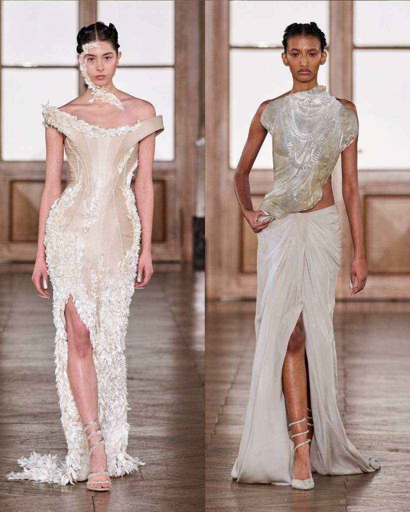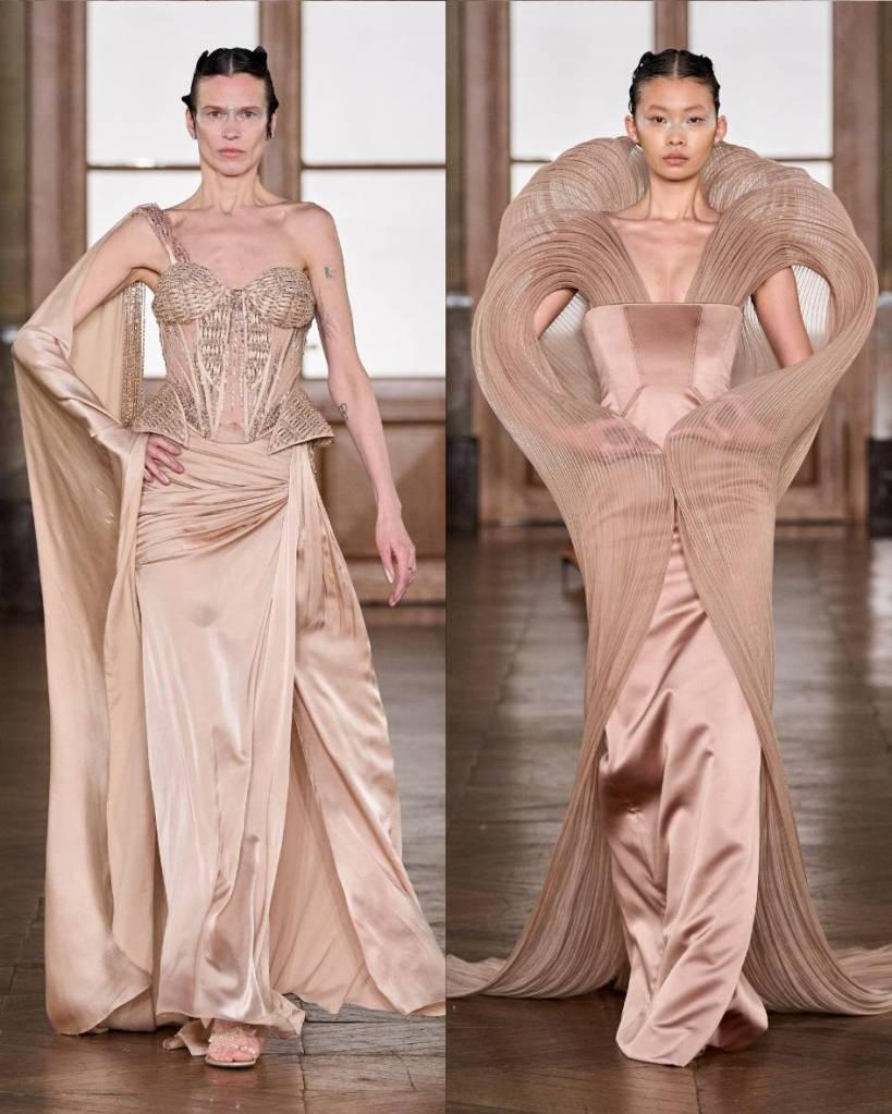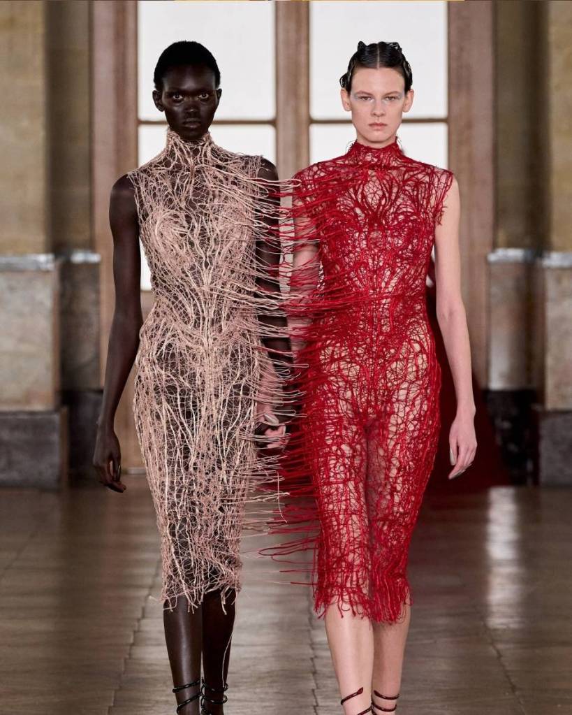 Gupta’s understanding of the body is where this really starts to sing. In India, the body is not separate from energy, it carries it. Here, anatomy becomes sacred geography. Web like threadwork traces energy points, nervous systems, and invisible pathways across the body. These are not dresses you just put on and walk away in. They ask to be contemplated and very much desired.