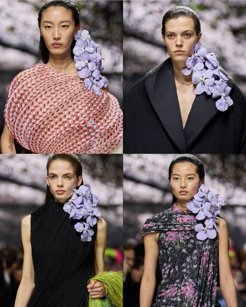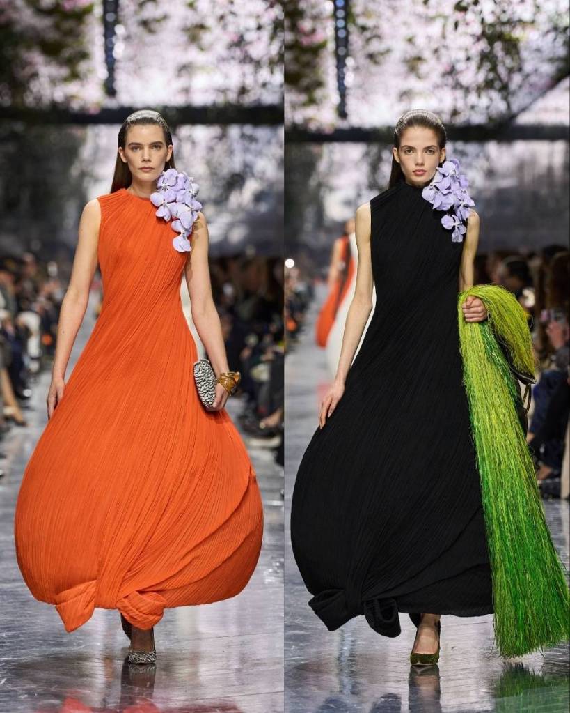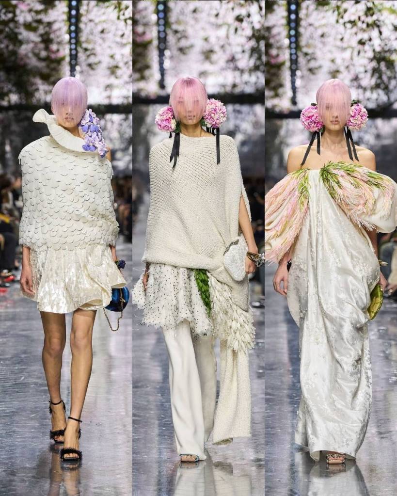 Flowers were everywhere and very obvious. Cyclamen clustered at ears, orchids balanced on shoulders, petals translated into ruffles, feathers and embroidery. Dresses shimmered like wet leaves. There were shingled feather skirts, draped silk tops that moved like breath, watery column gowns with appliqué that looked poured onto the body. One look carried a giant leaf umbrella, ridiculous and perfect. Mini dresses mimicked flowers in bloom.