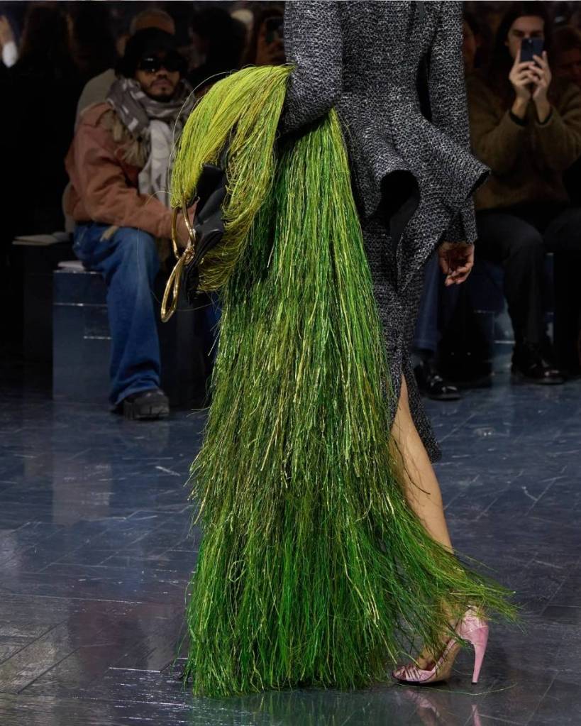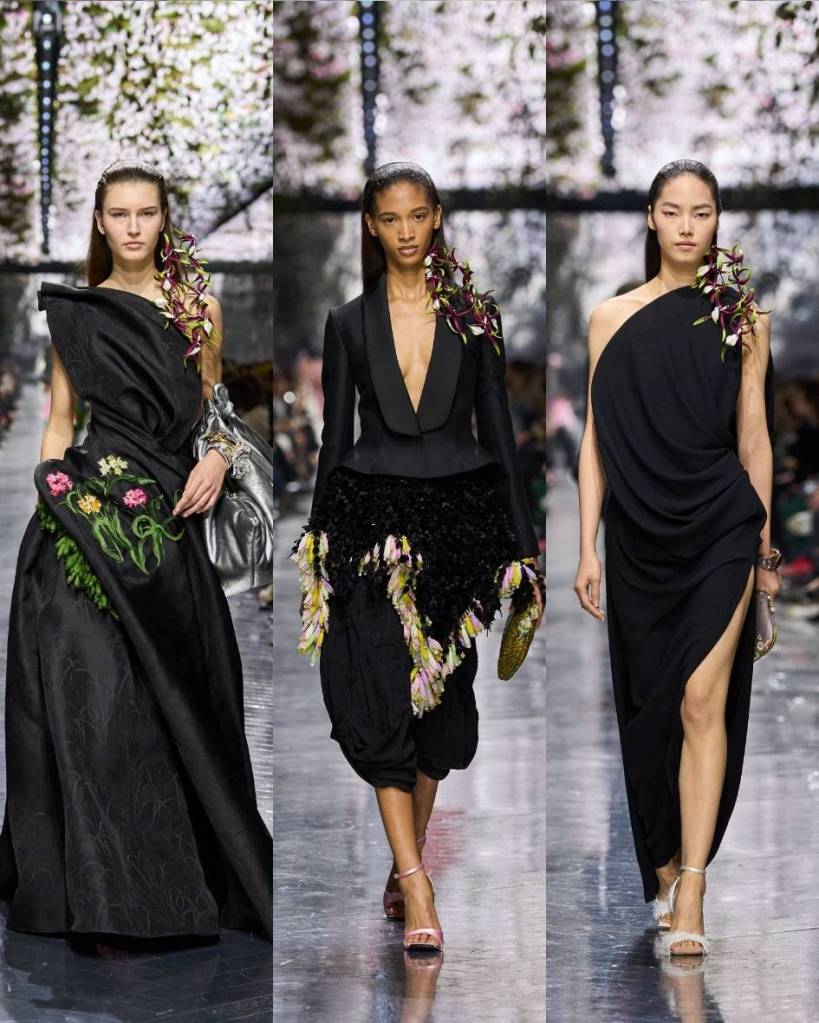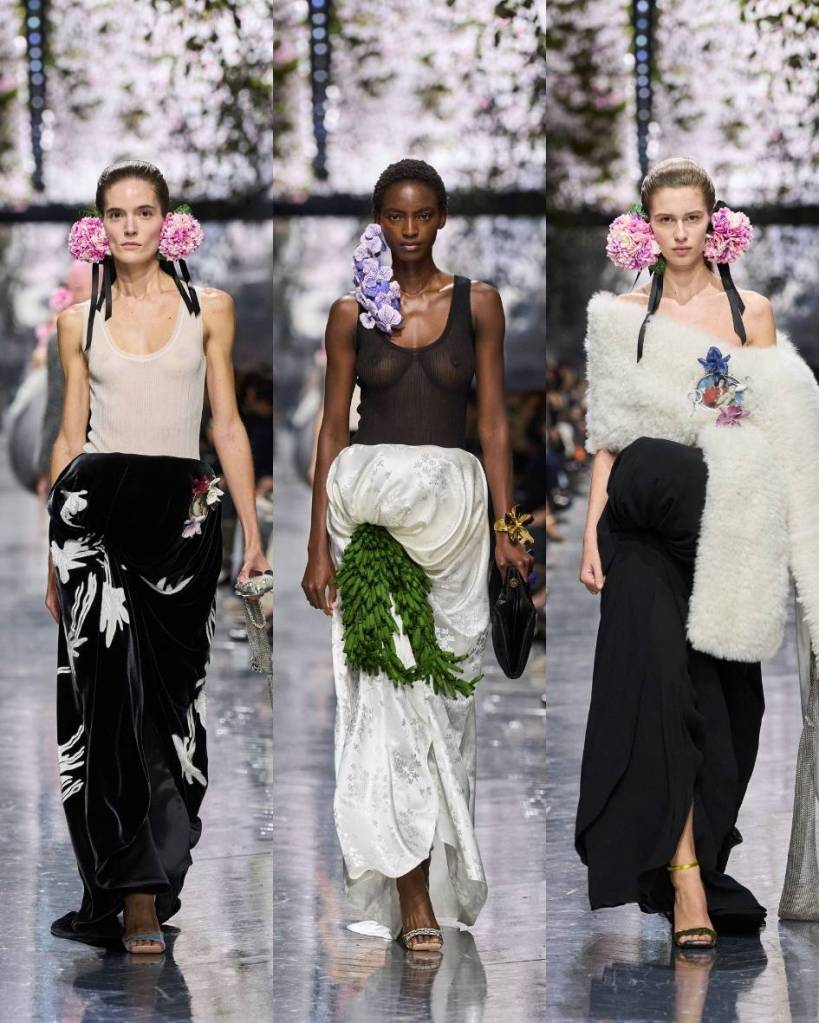 Nature was everywhere, but never in the predictable, floral-for-floral’s-sake way. It was embedded into the clothes, into the structure, into how fabric moved and misbehaved. Jonathan Anderson’s first couture for Dior felt like a fully realised world, and more importantly, a deeply cohesive one. Orchids balanced on shoulders. Cyclamen clustered at ears. Foliage erupted from hems in green tassels.